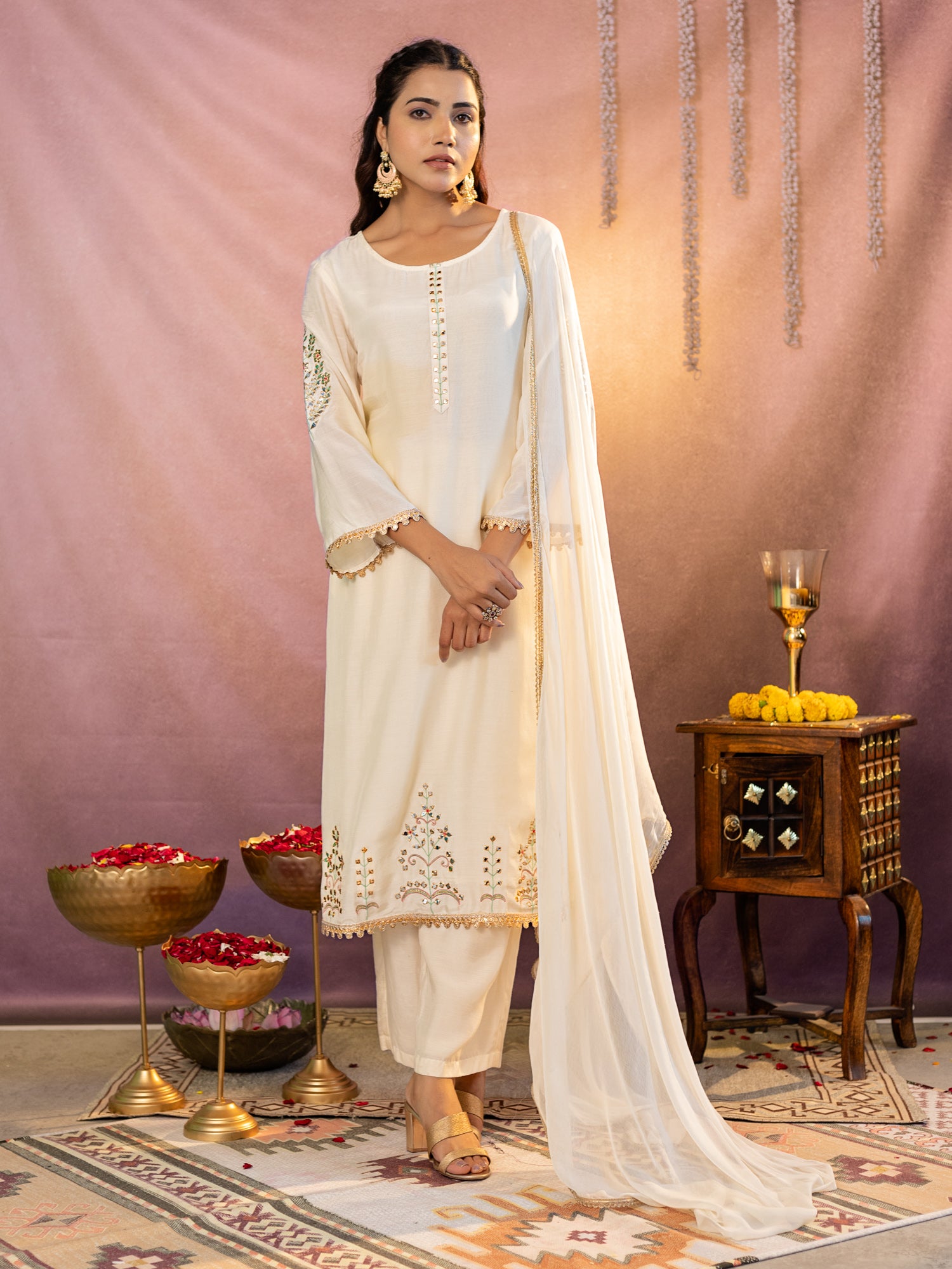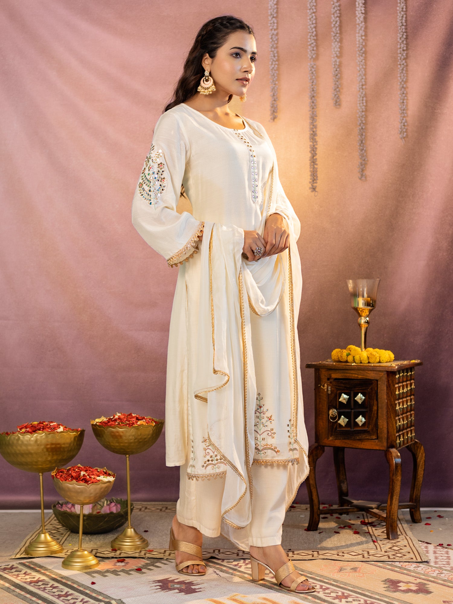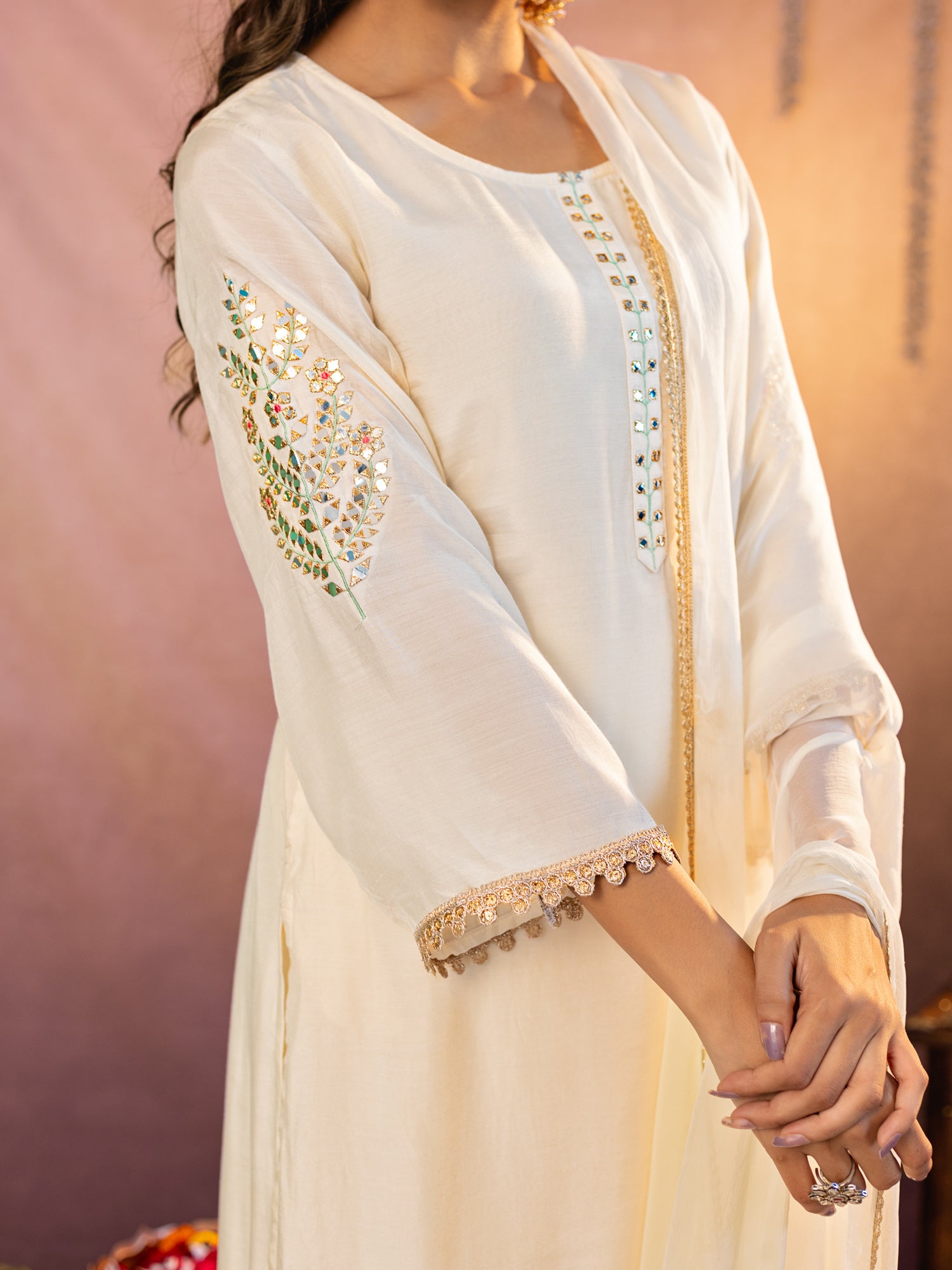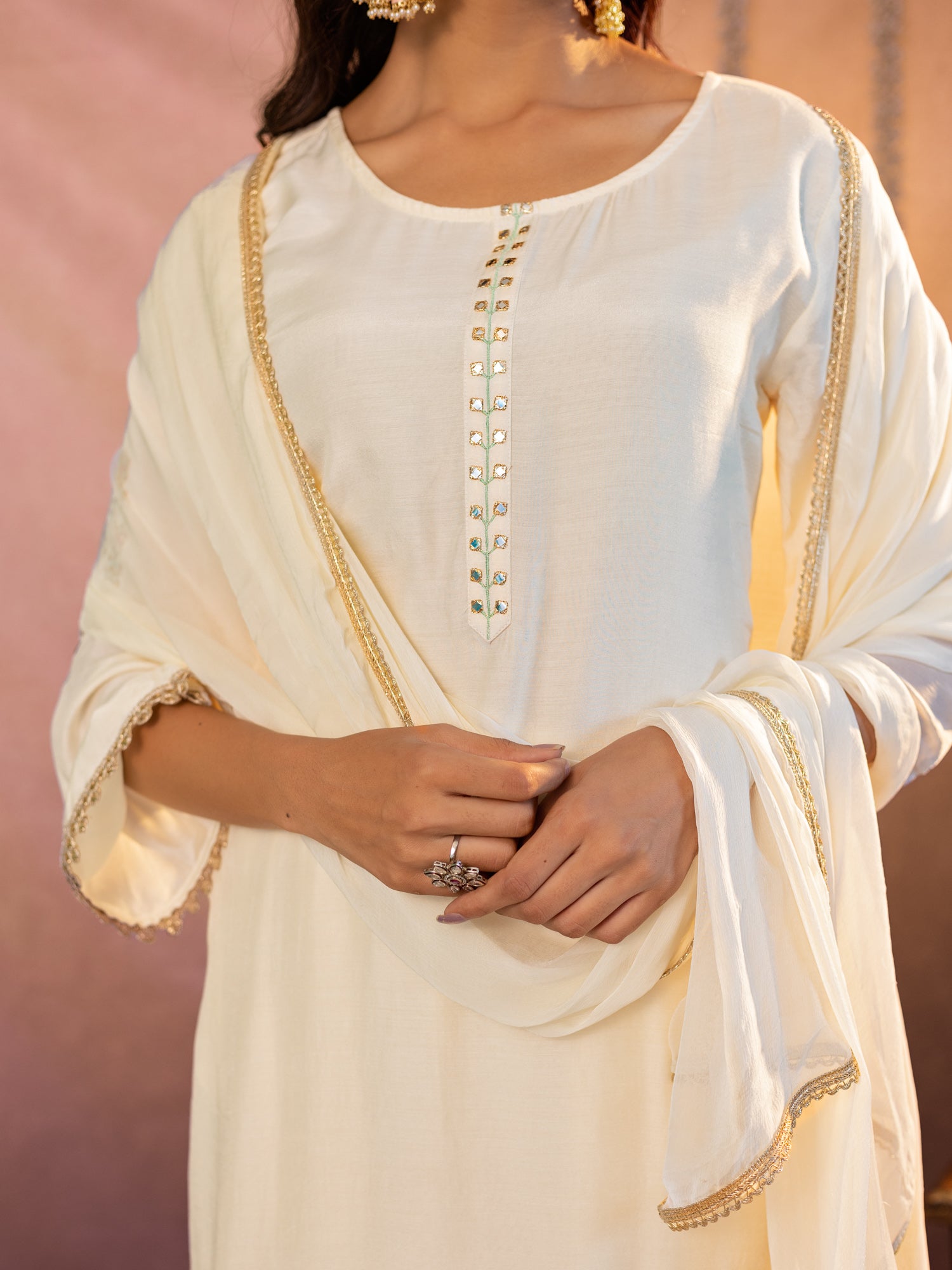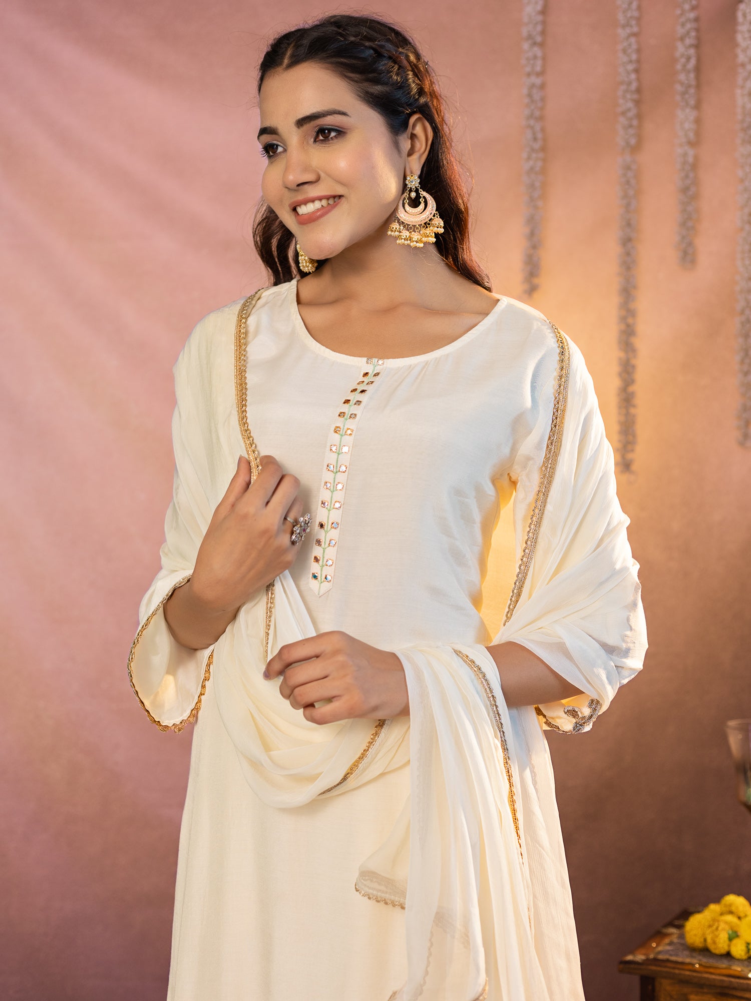 Off White Mirror Work Embroidered Pakistani Style Kurta Set With Dupatta