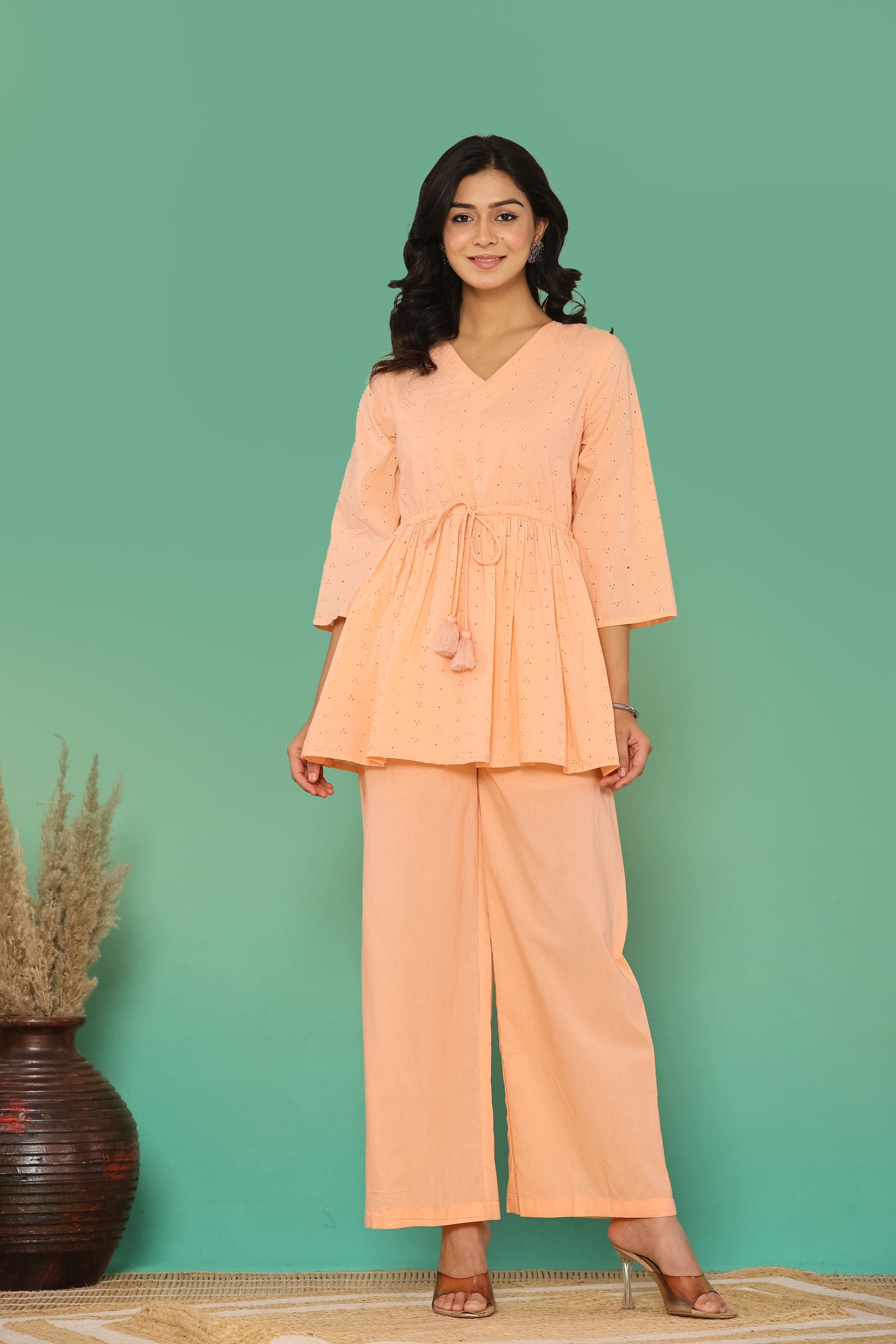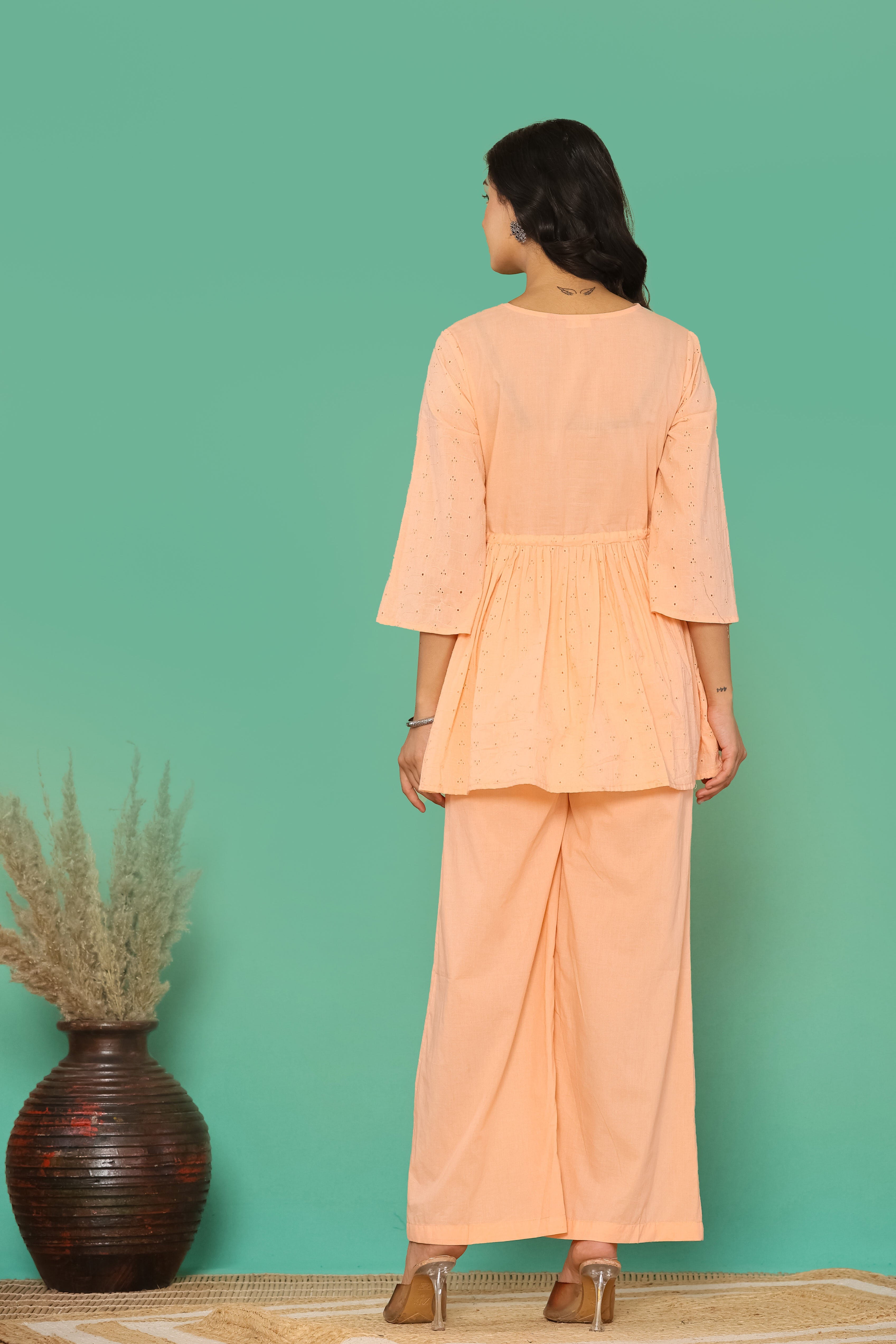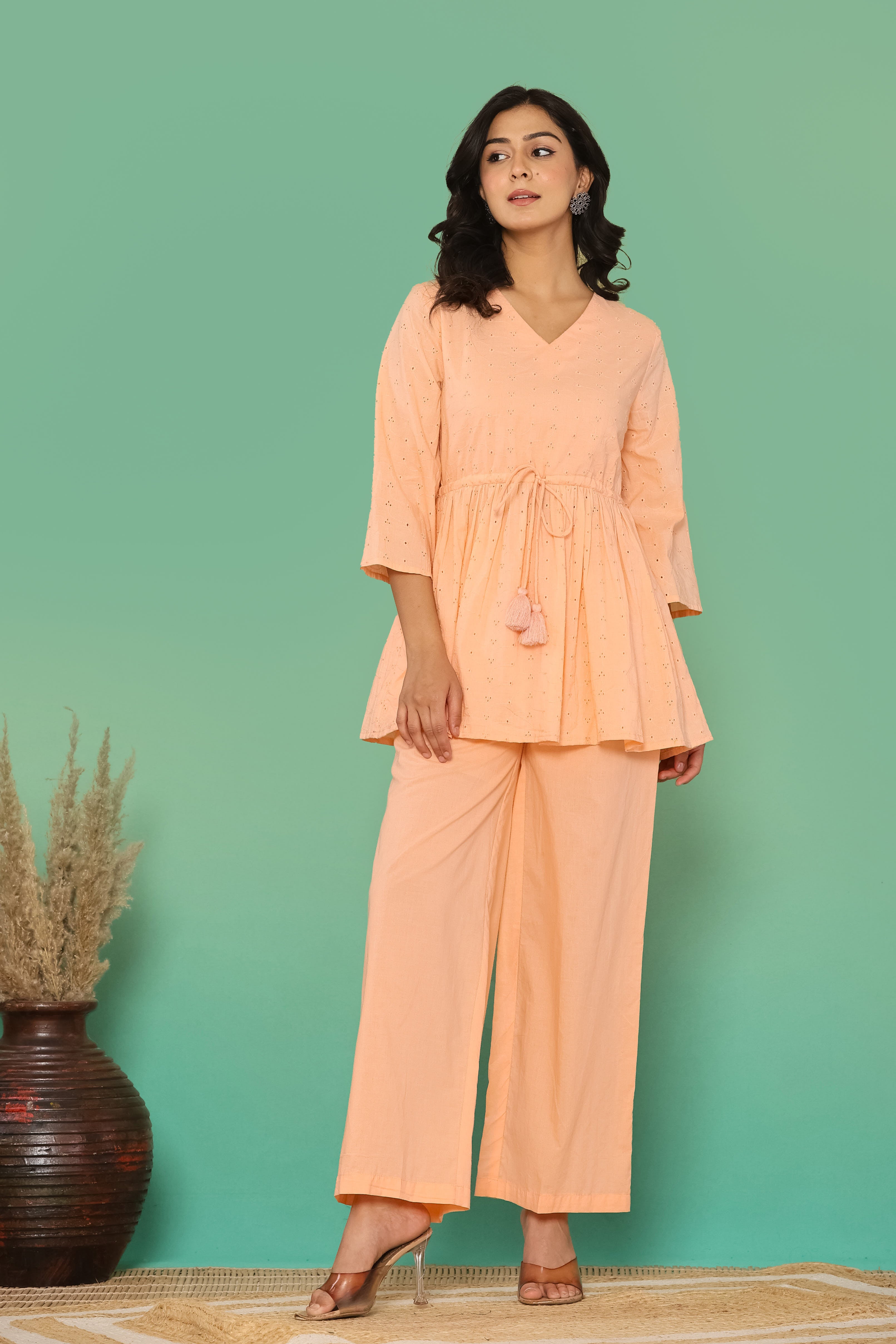Pastel Orange Schiffli Embroidered Pure Cotton Co-Ord Set