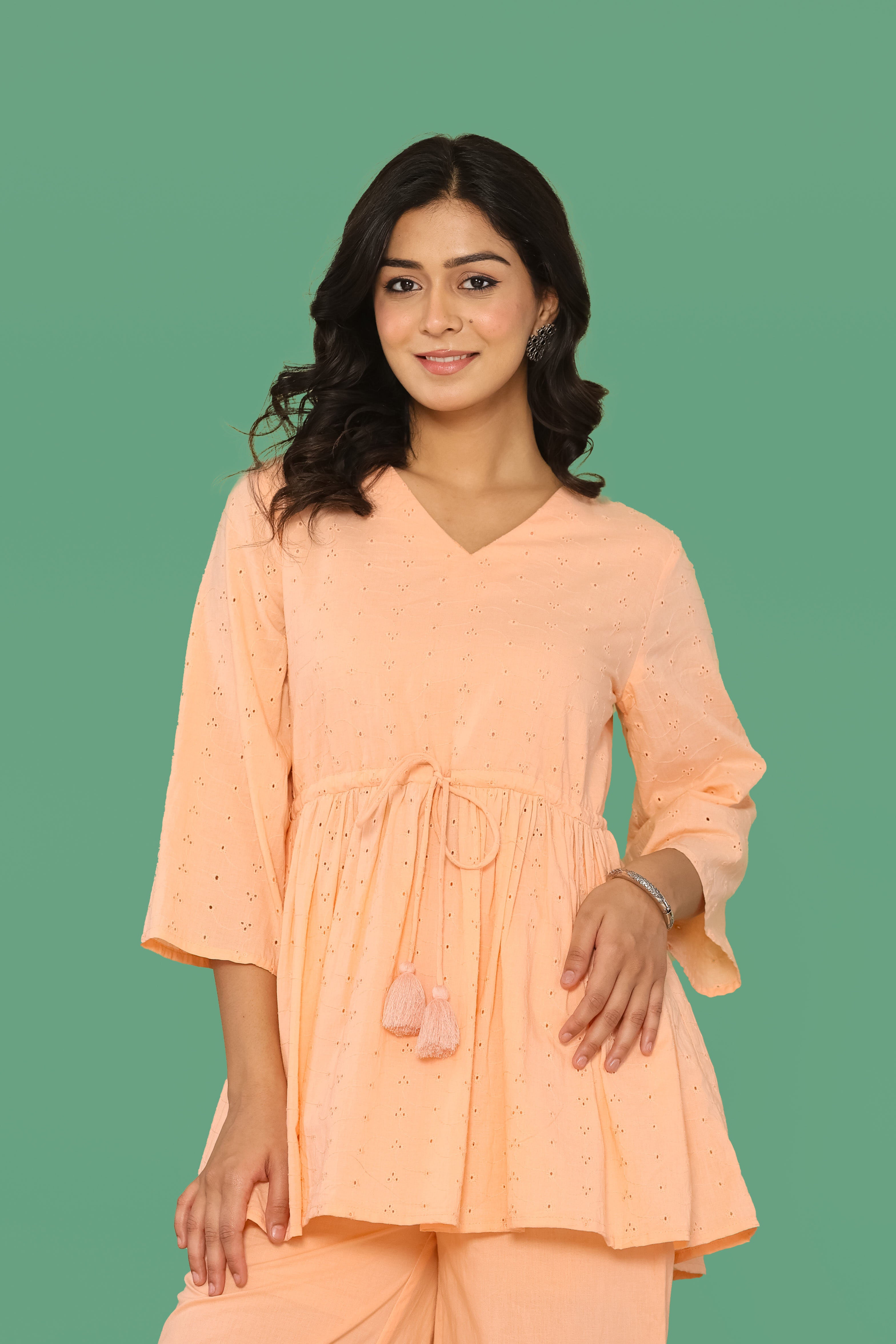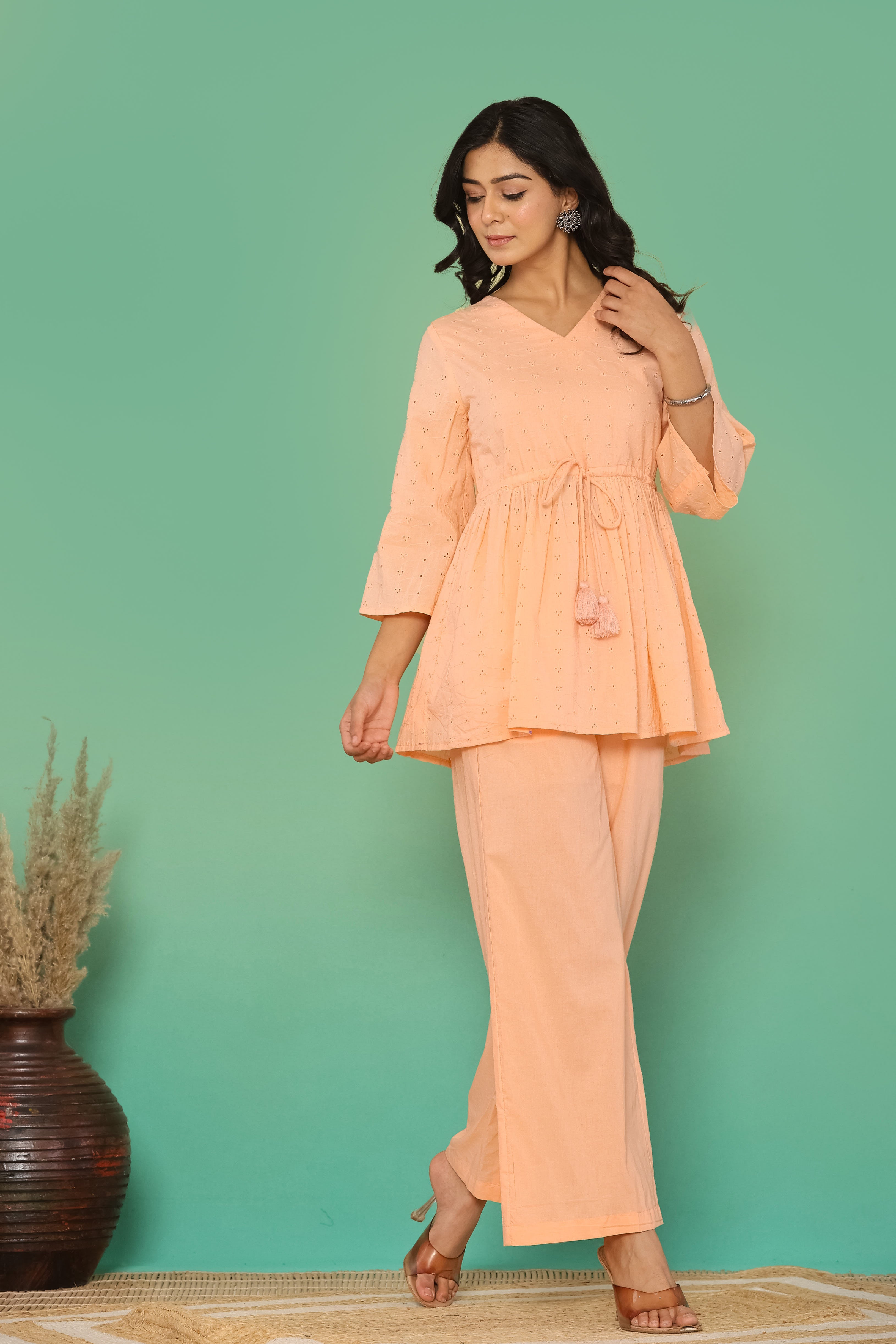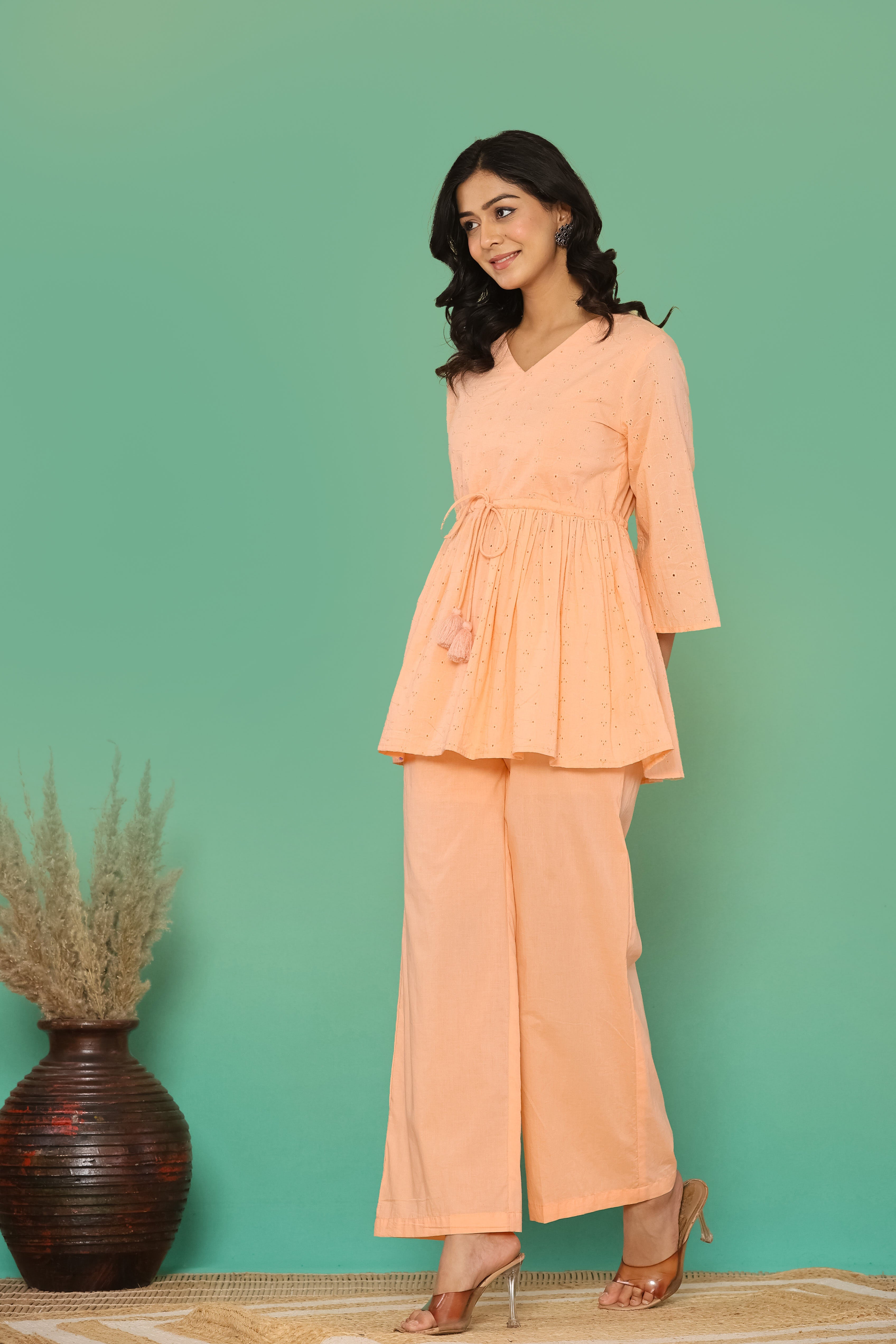 Pastel Orange Schiffli Embroidered Pure Cotton Co-Ord Set