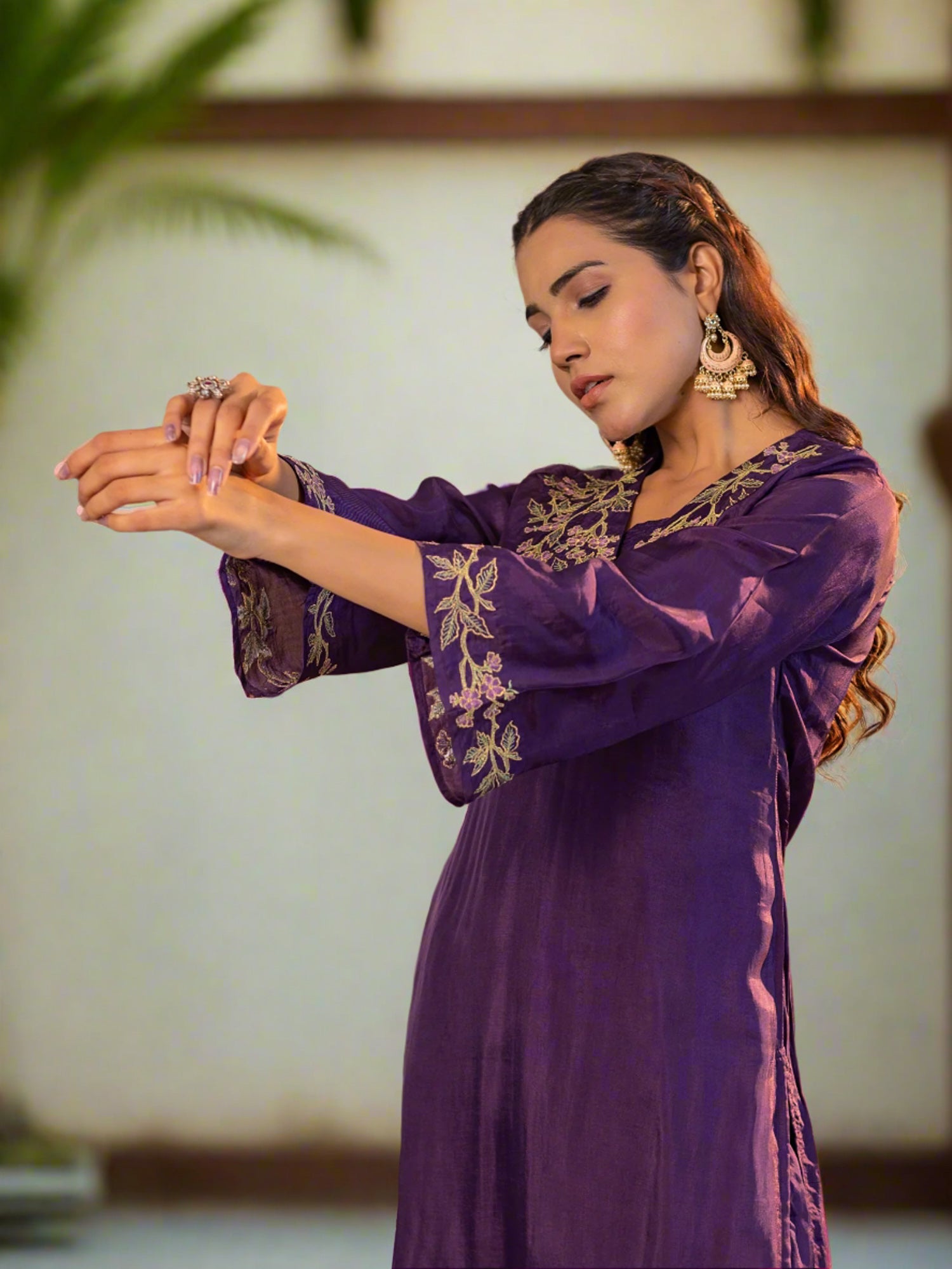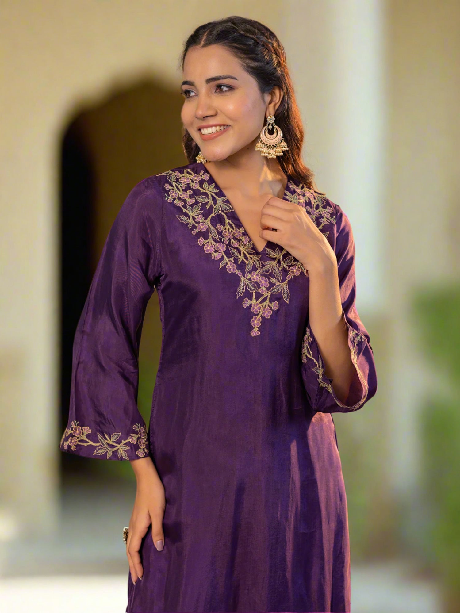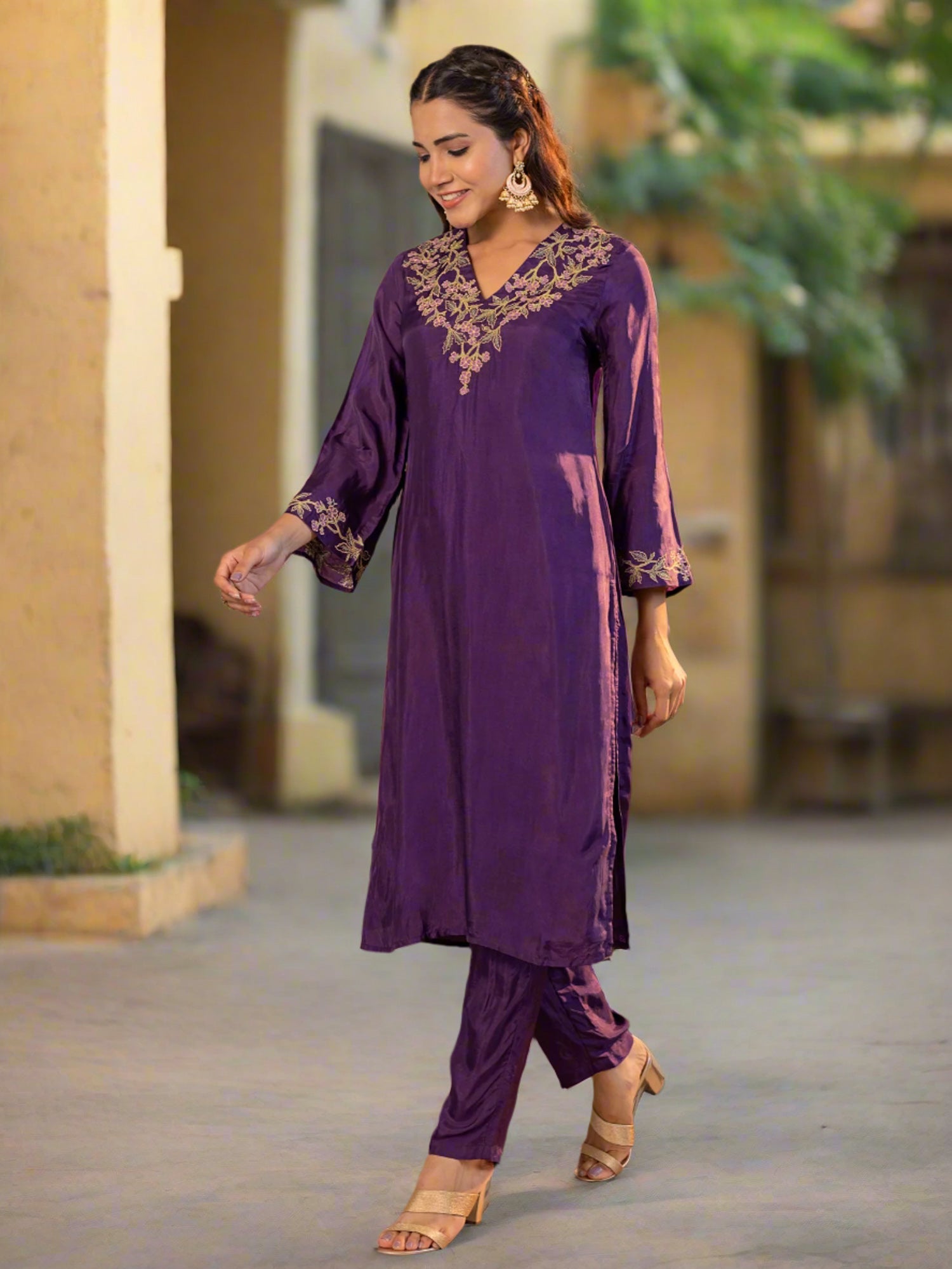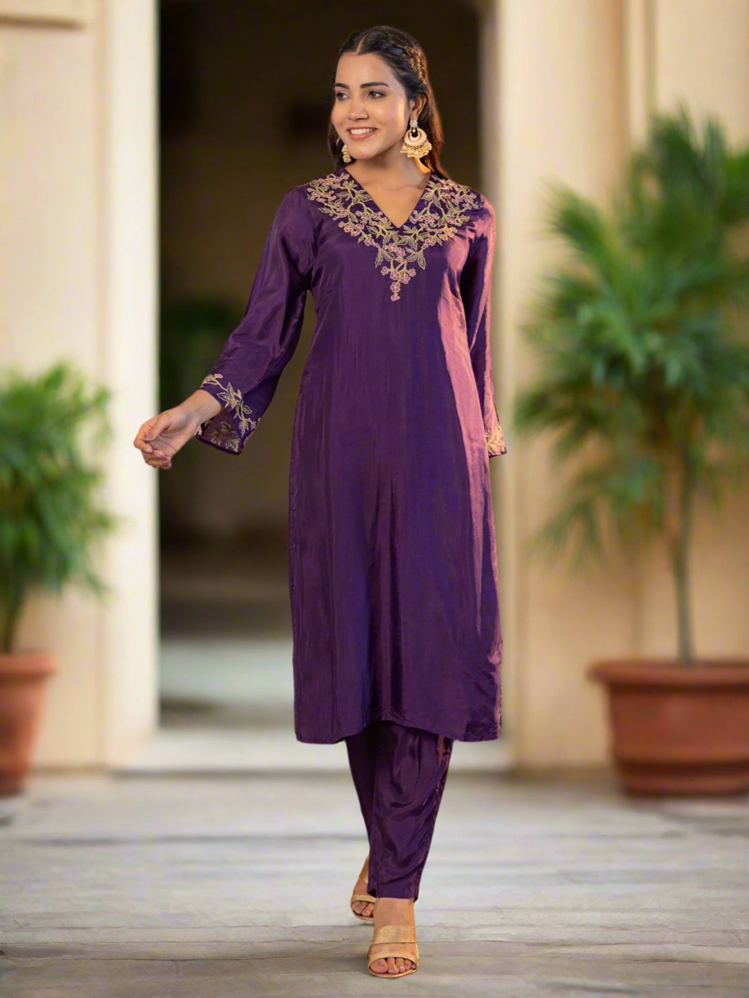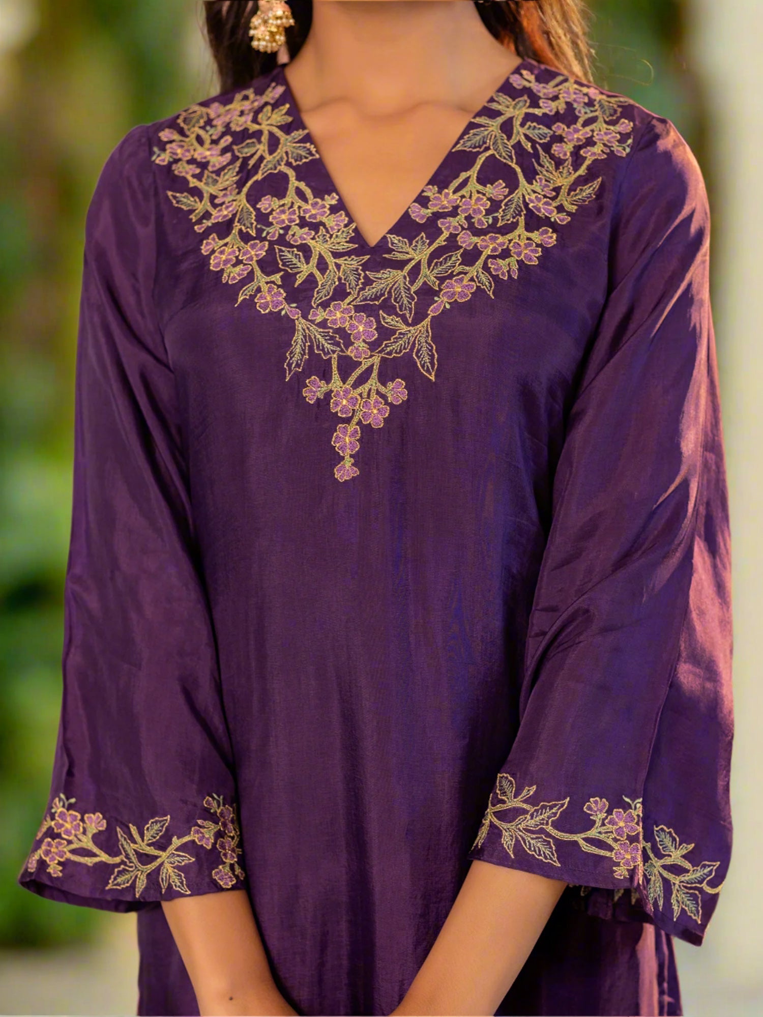 Purple Upada Silk V-Neck Floral Embroidered Co-Ord Set