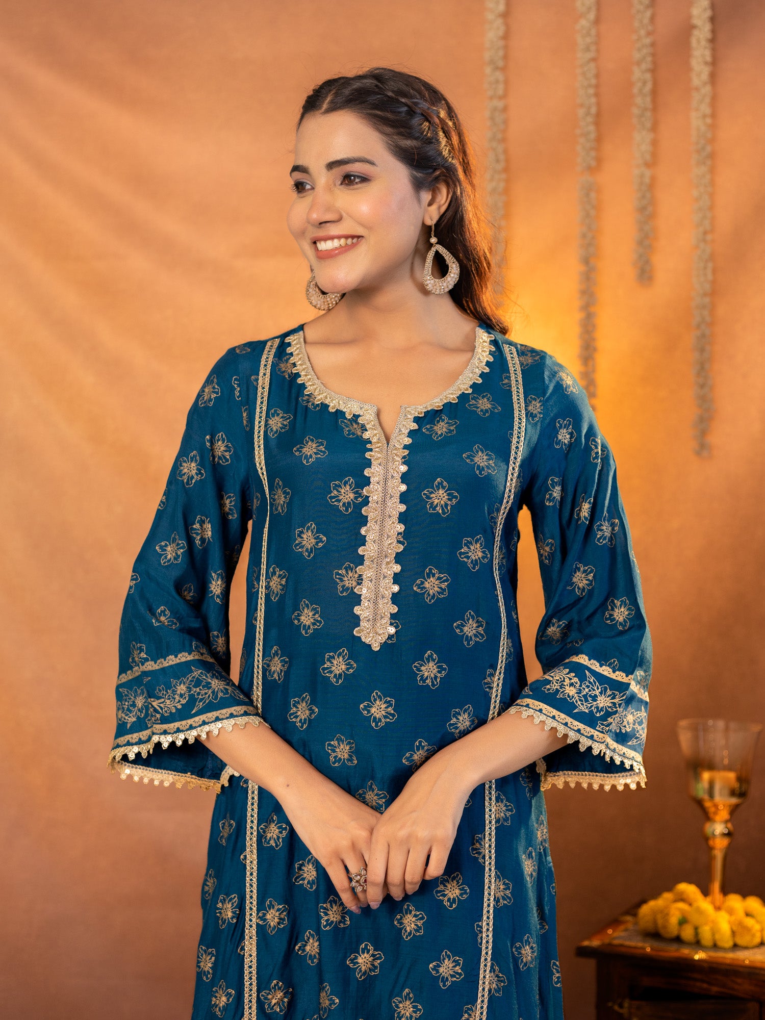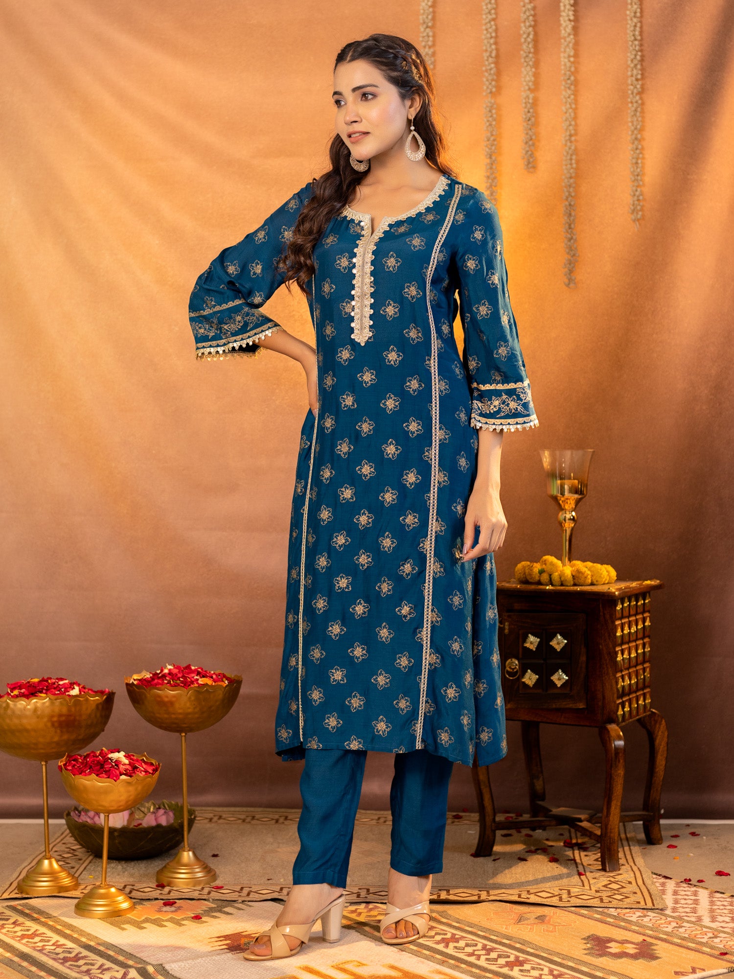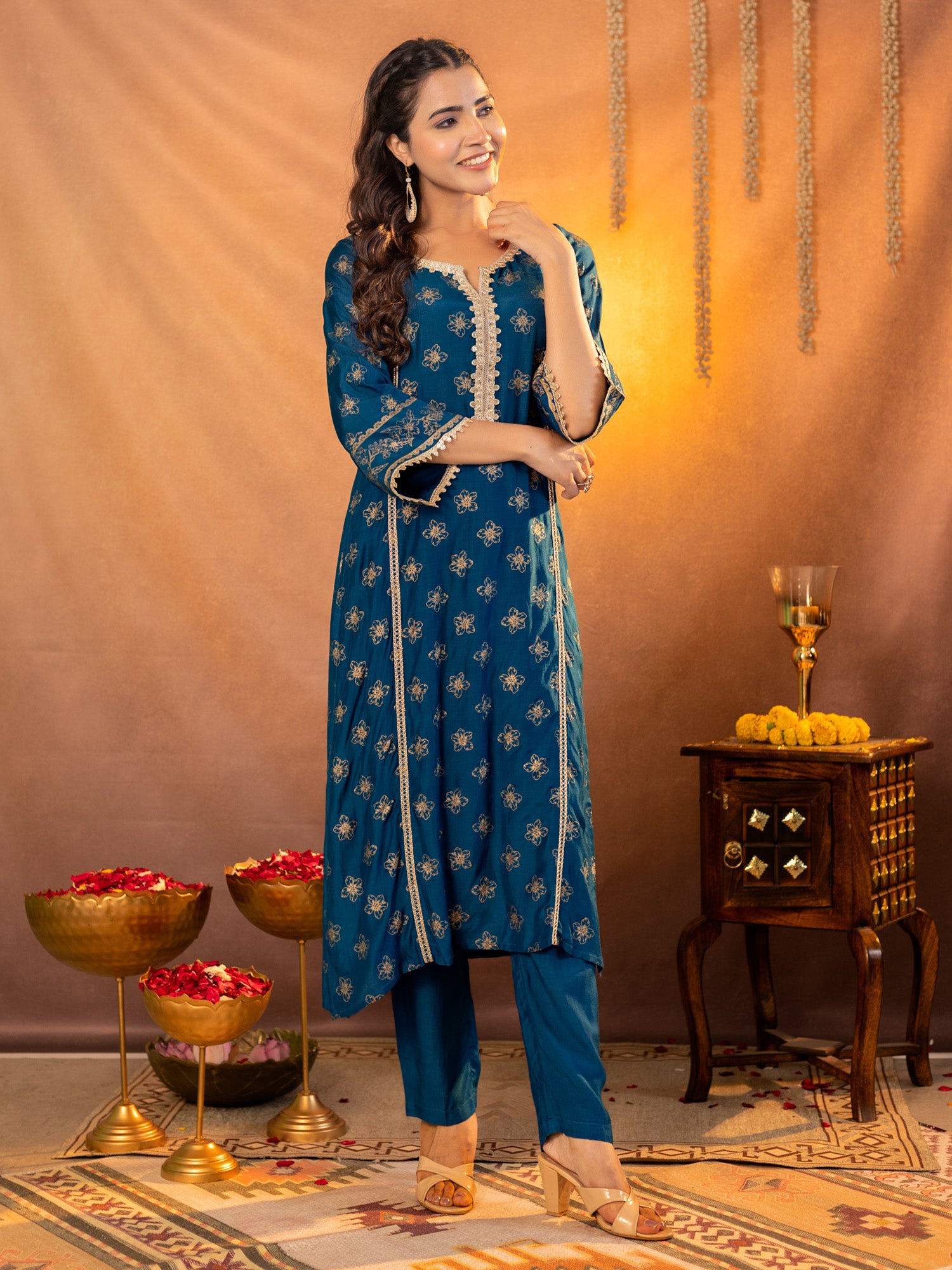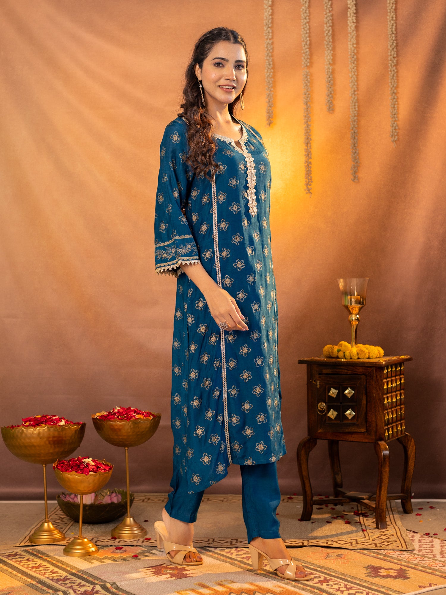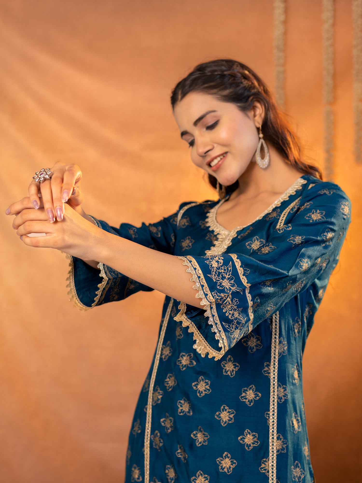 Teal Blue Gold Printed Muslin Co-Ord Set