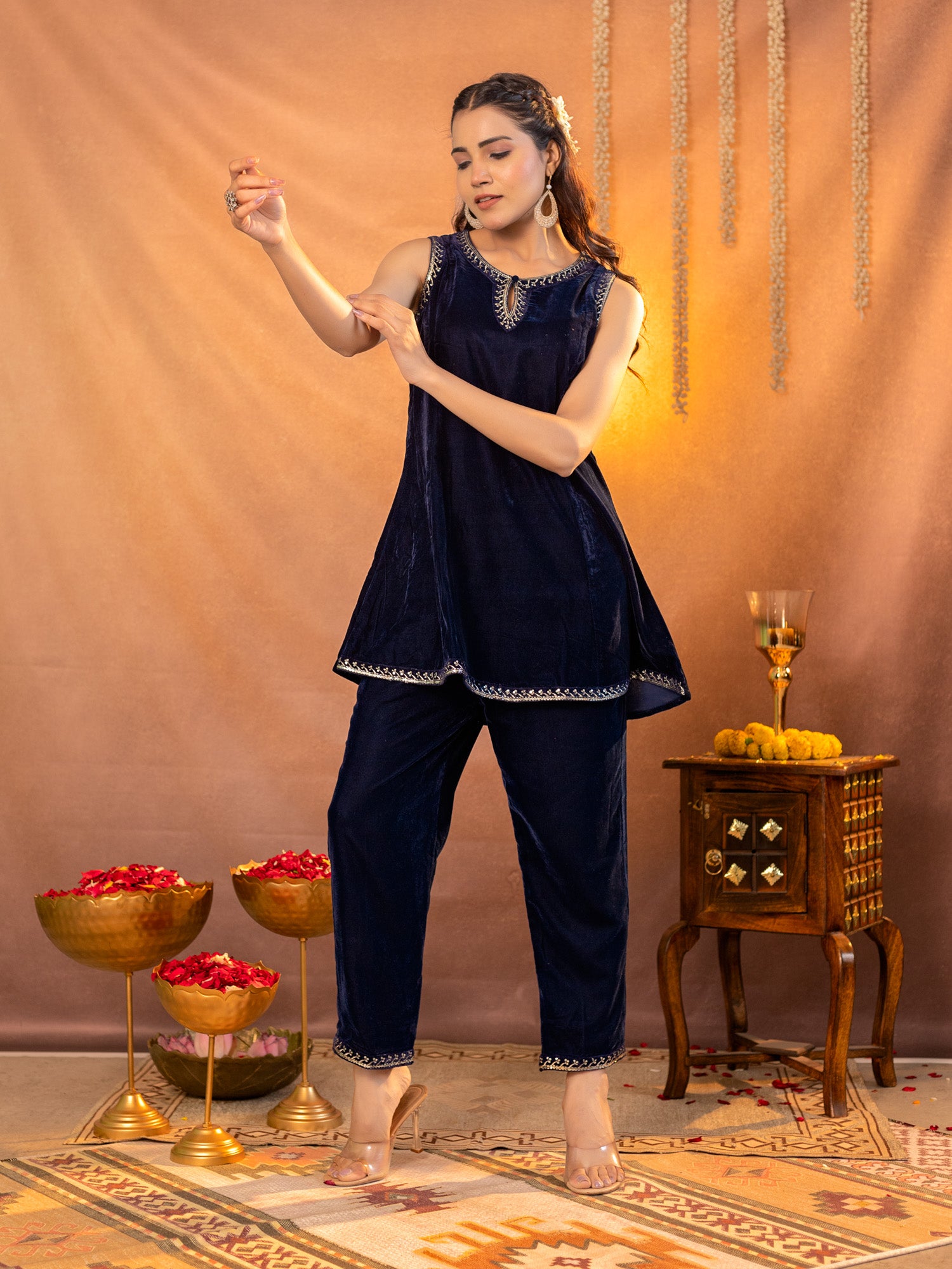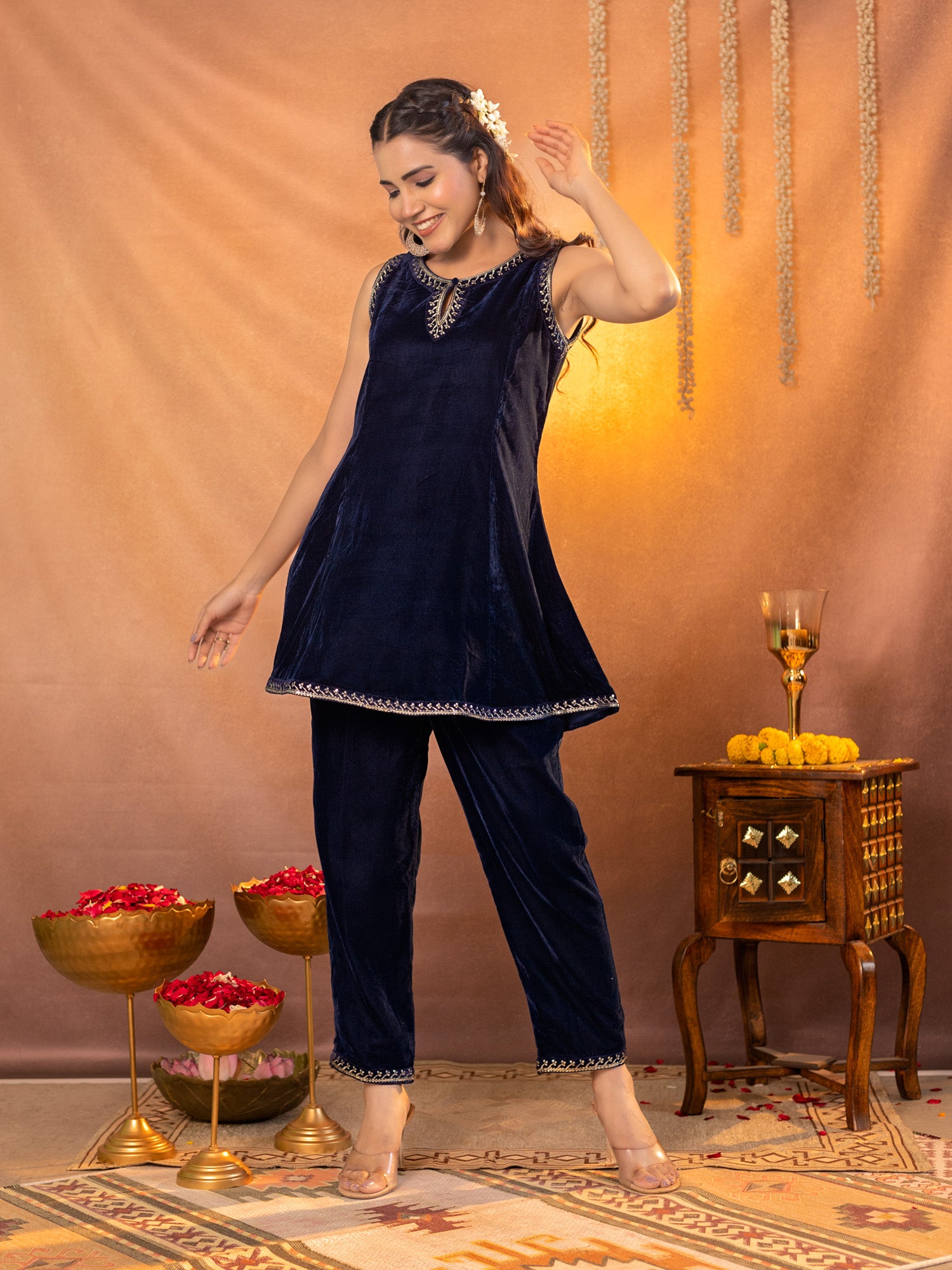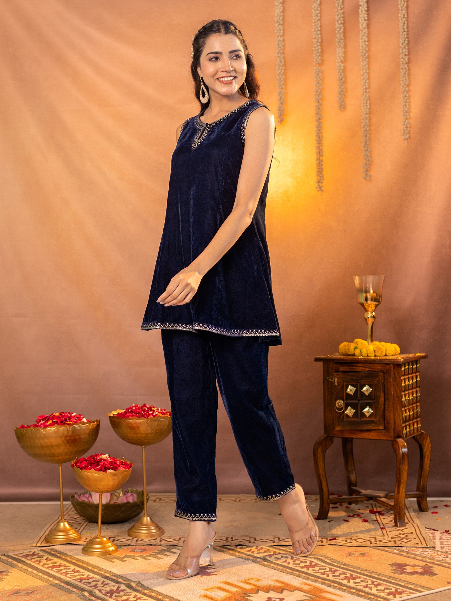 Navy Blue Sleeveless Velvet Kurta With Pant