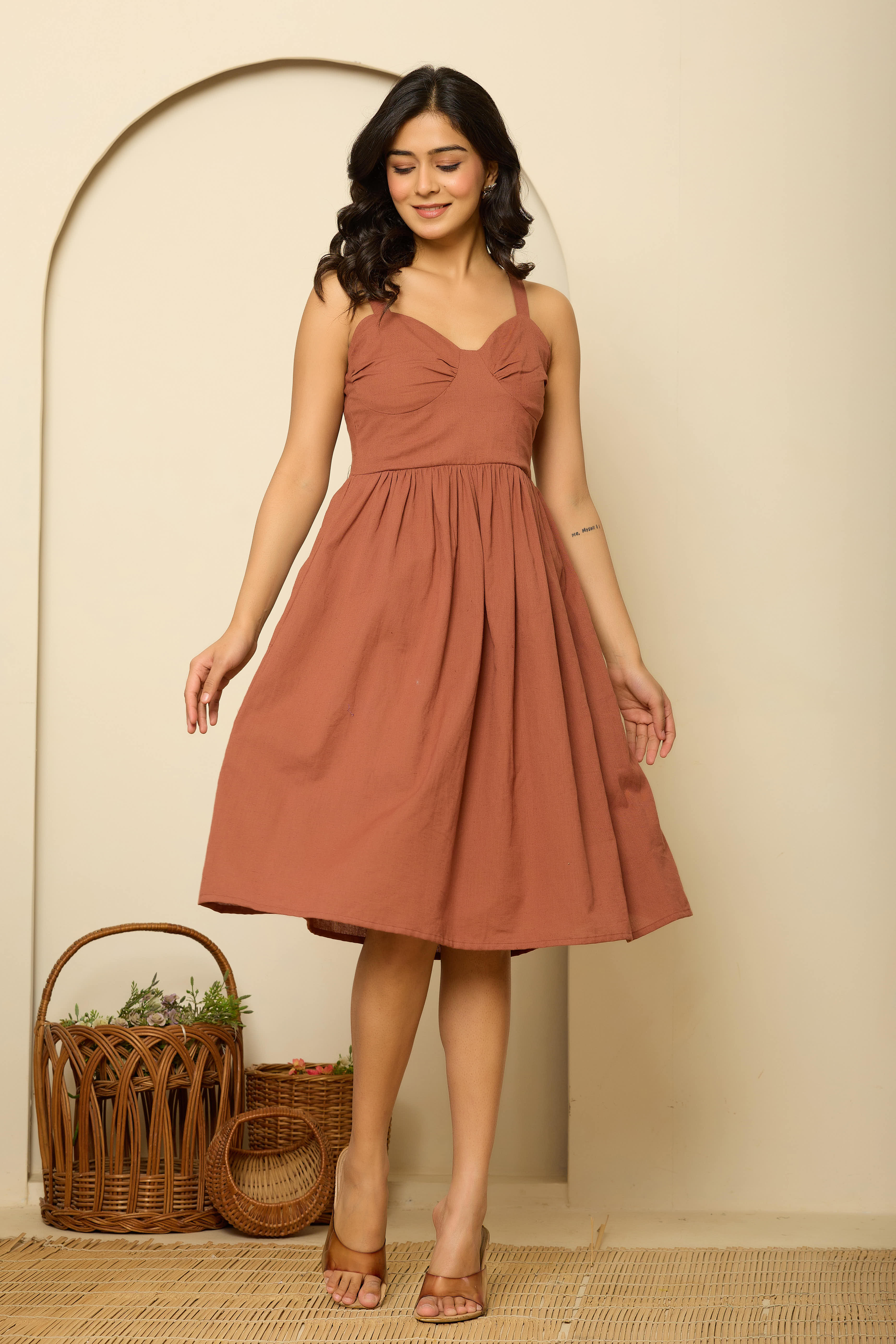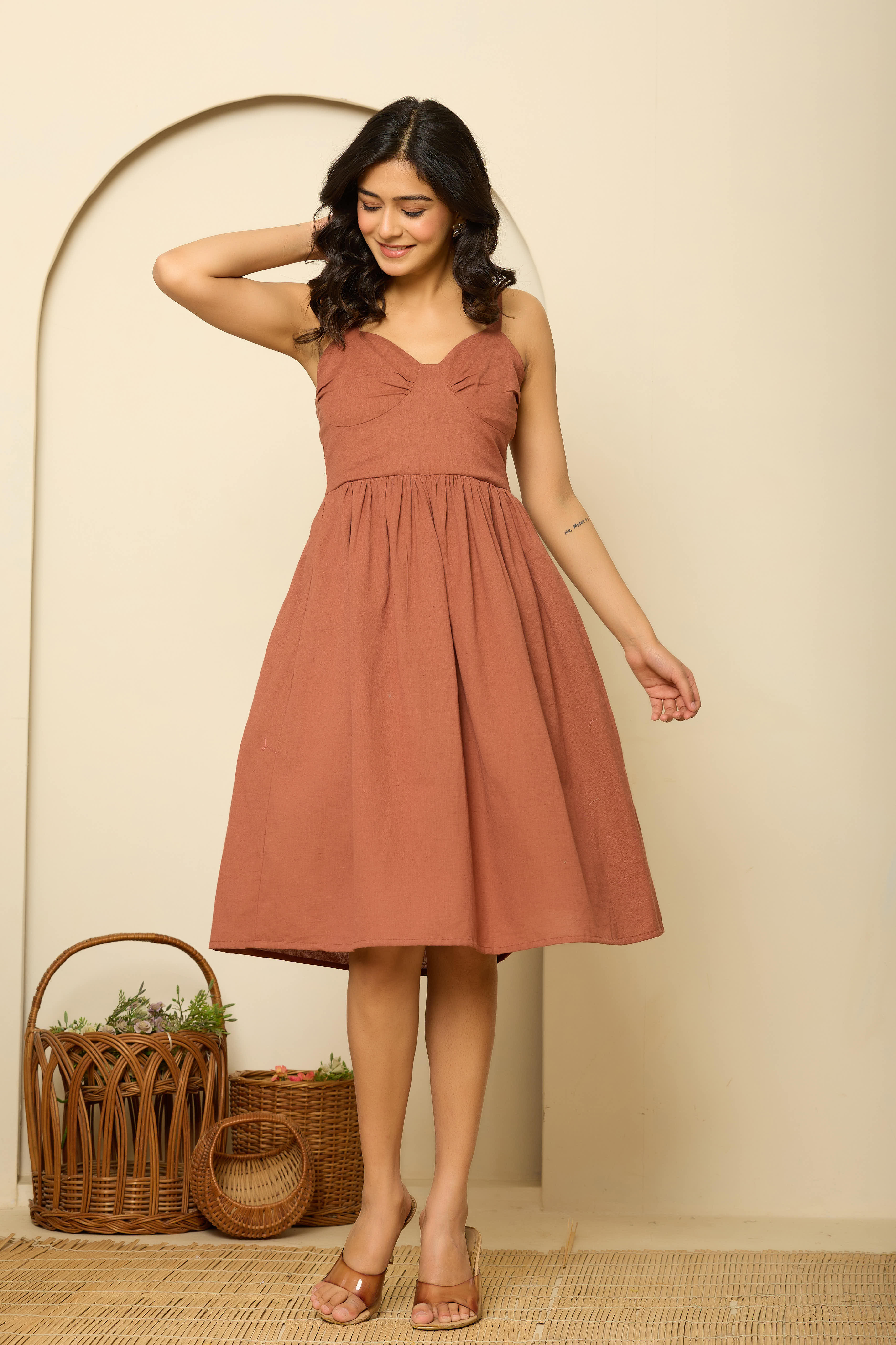 Brown Cotton Sweetheart Neck Sleeveless Dress