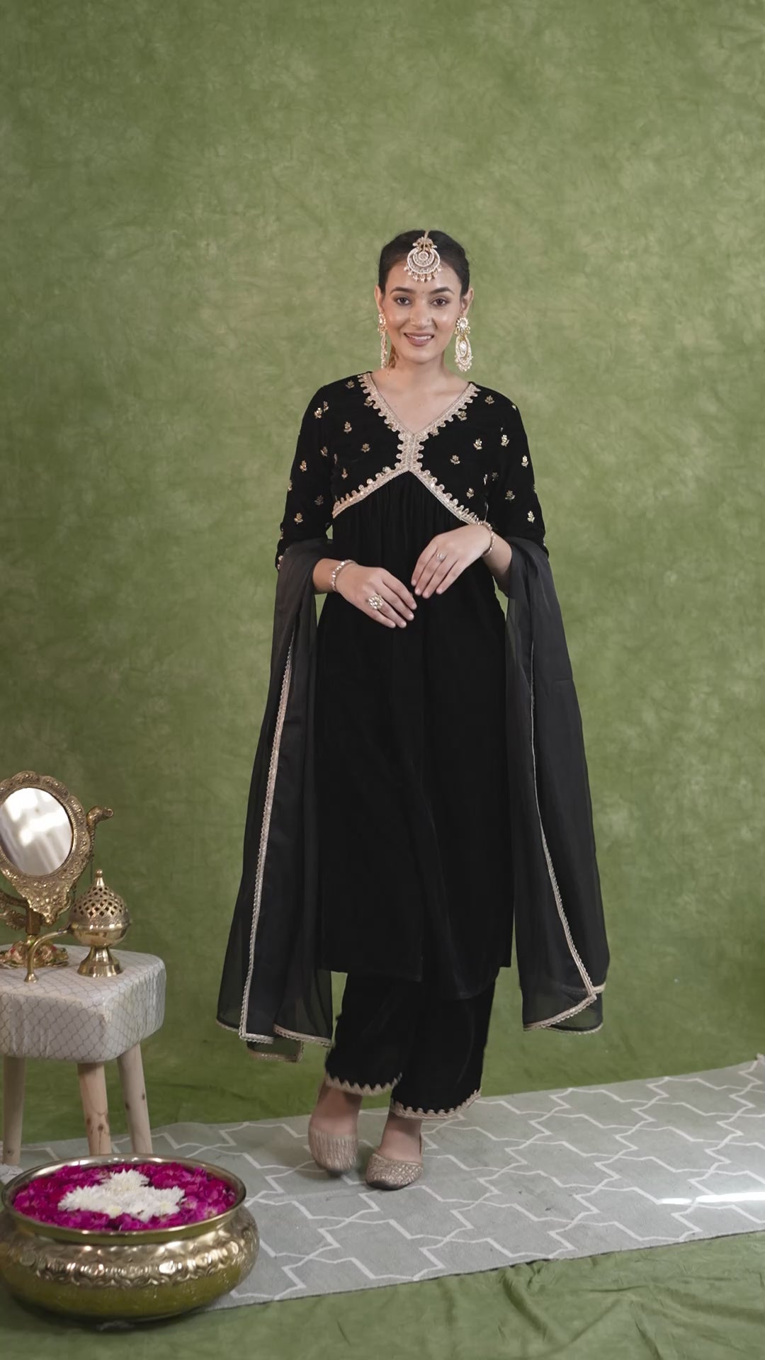 Black Velvet Embroidered Alia Cut Kurta Set With Dupatta