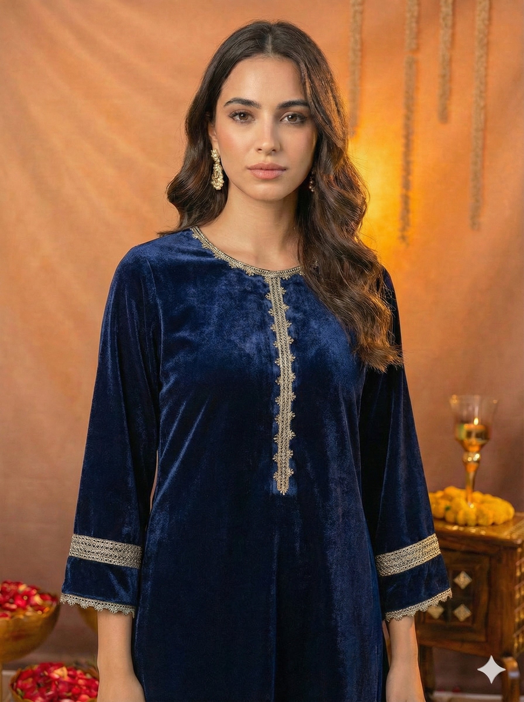 Navy Blue Velvet Kurta And Pant Co-ord Set