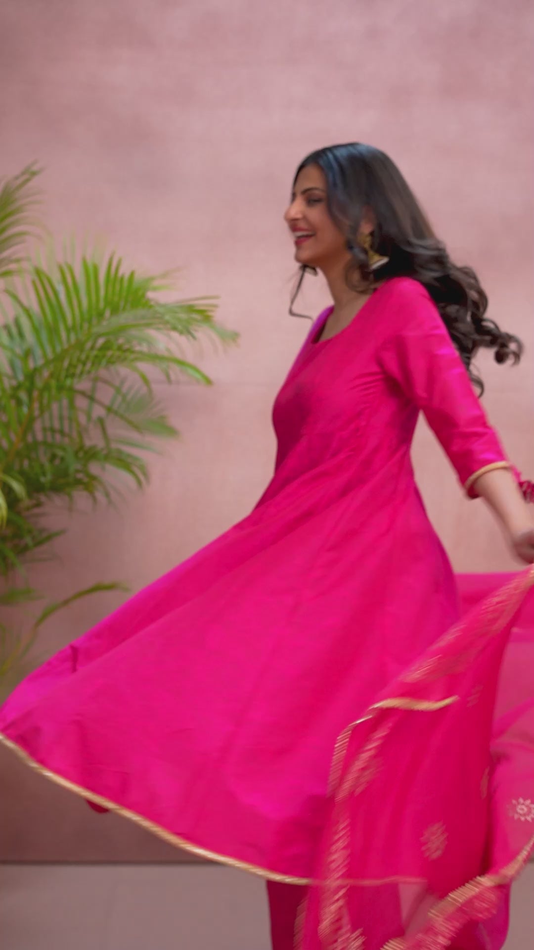 Pink Viscose Flared Anarkali Set With Gold Printed Dupatta
