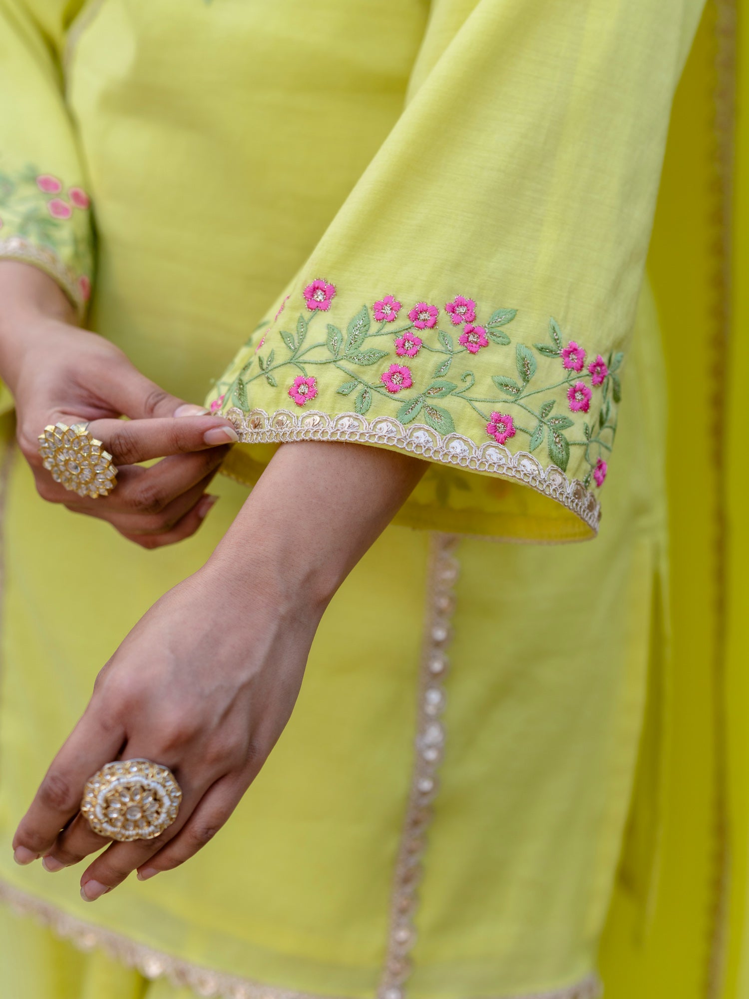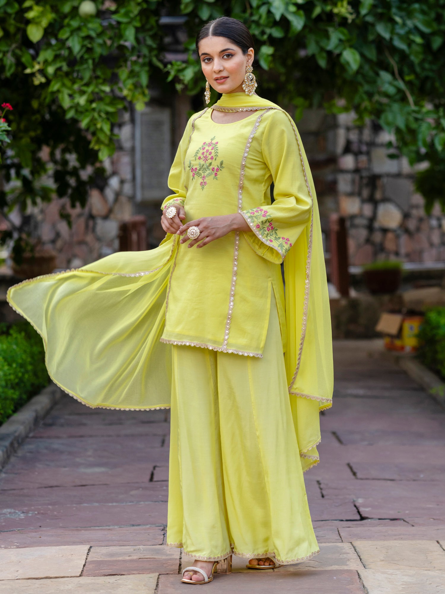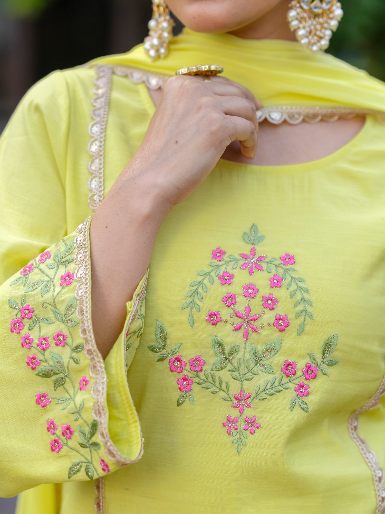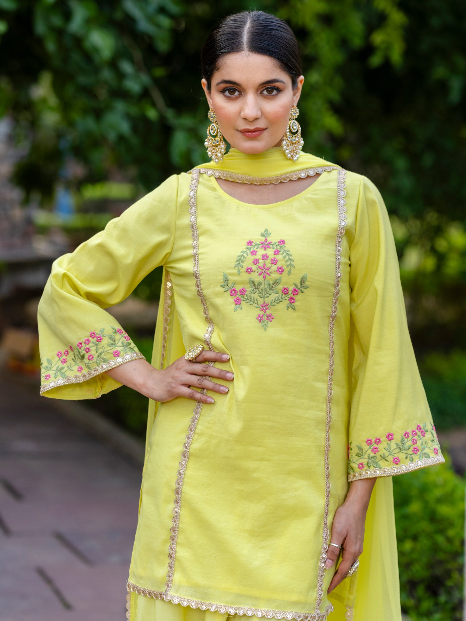 Yellow Chanderi Embroidered Kurta Set With Flared Pant And Chiffon Dupatta