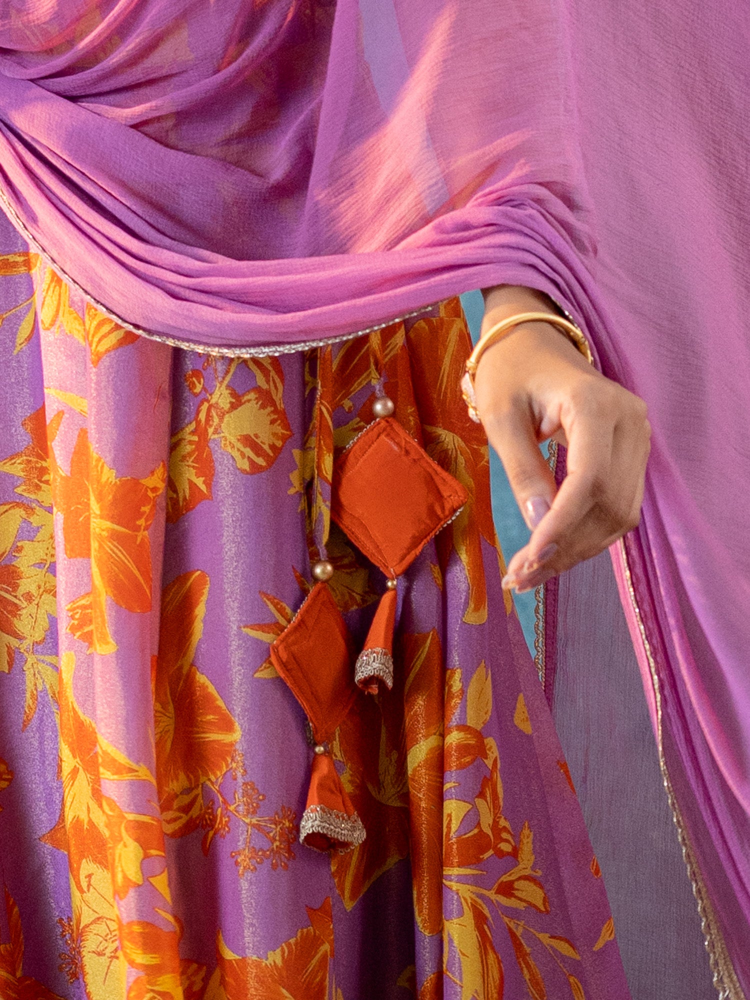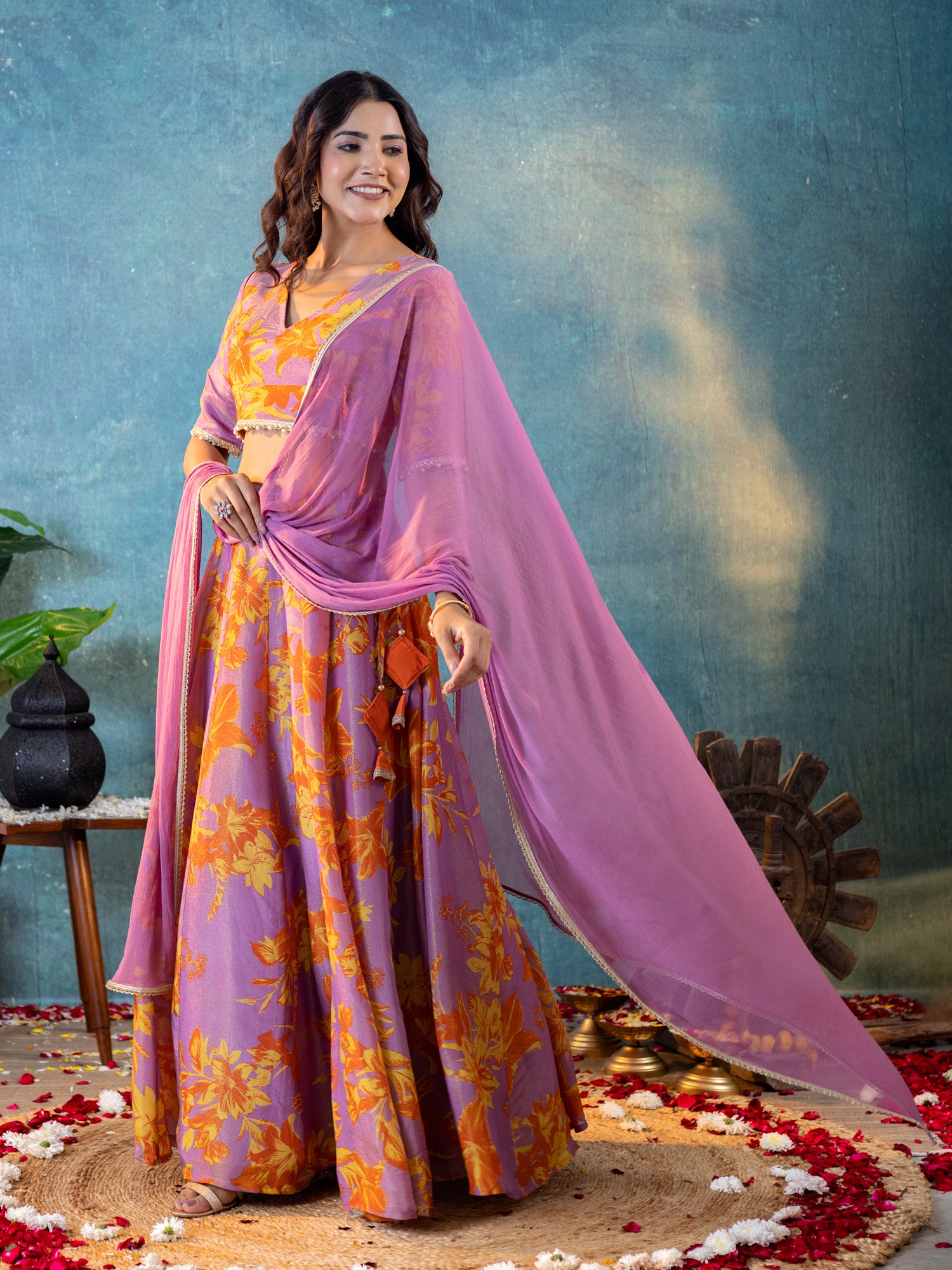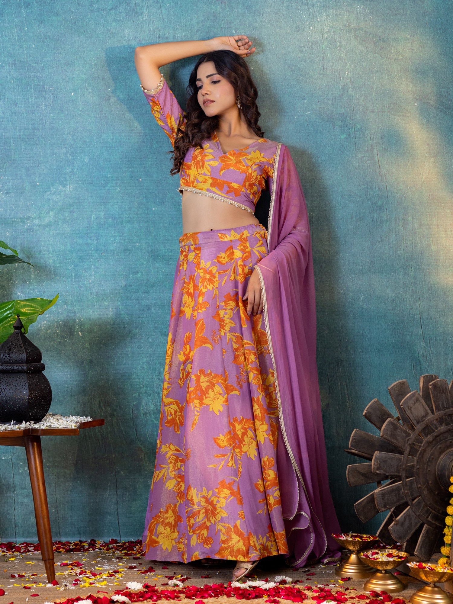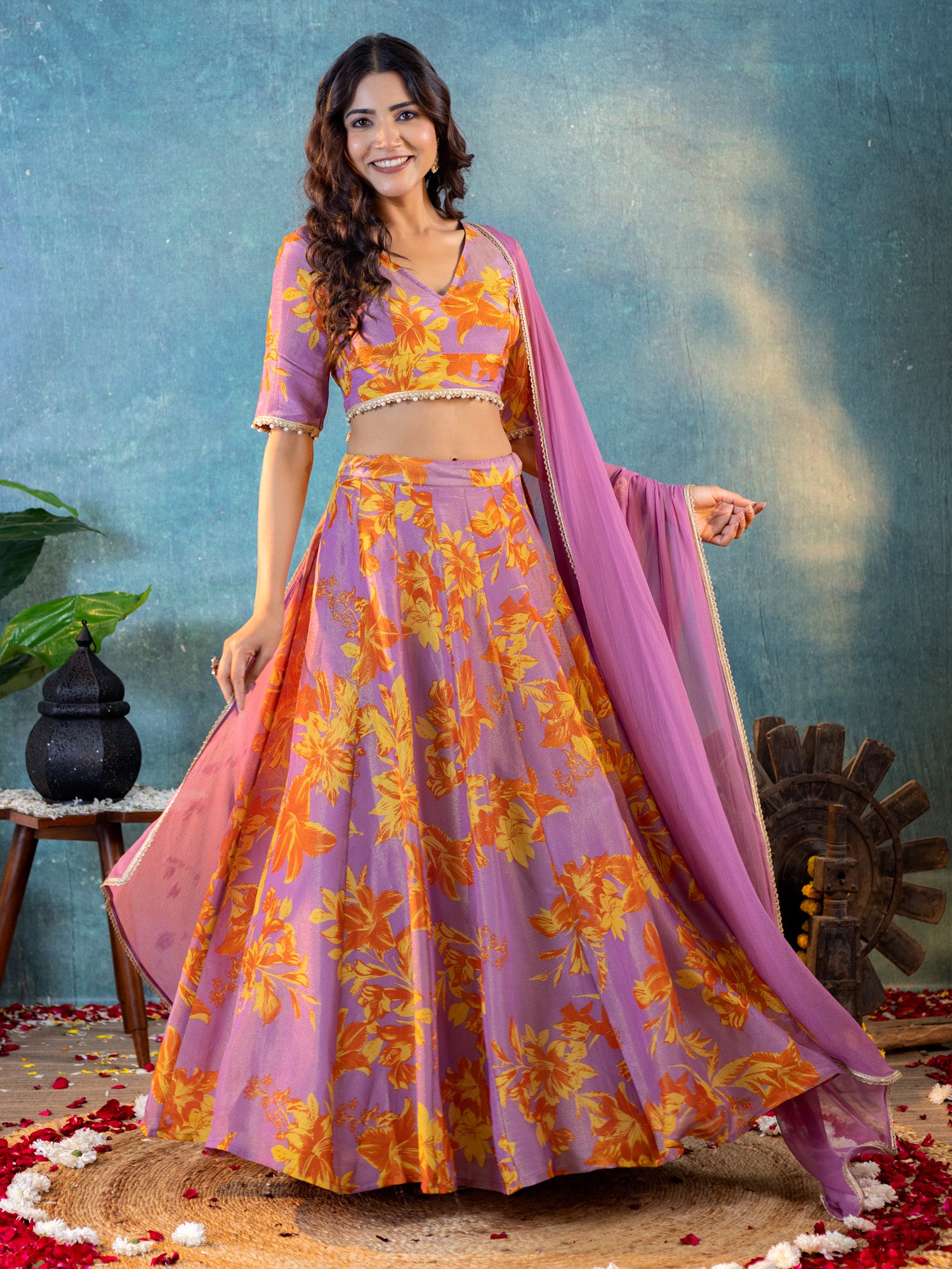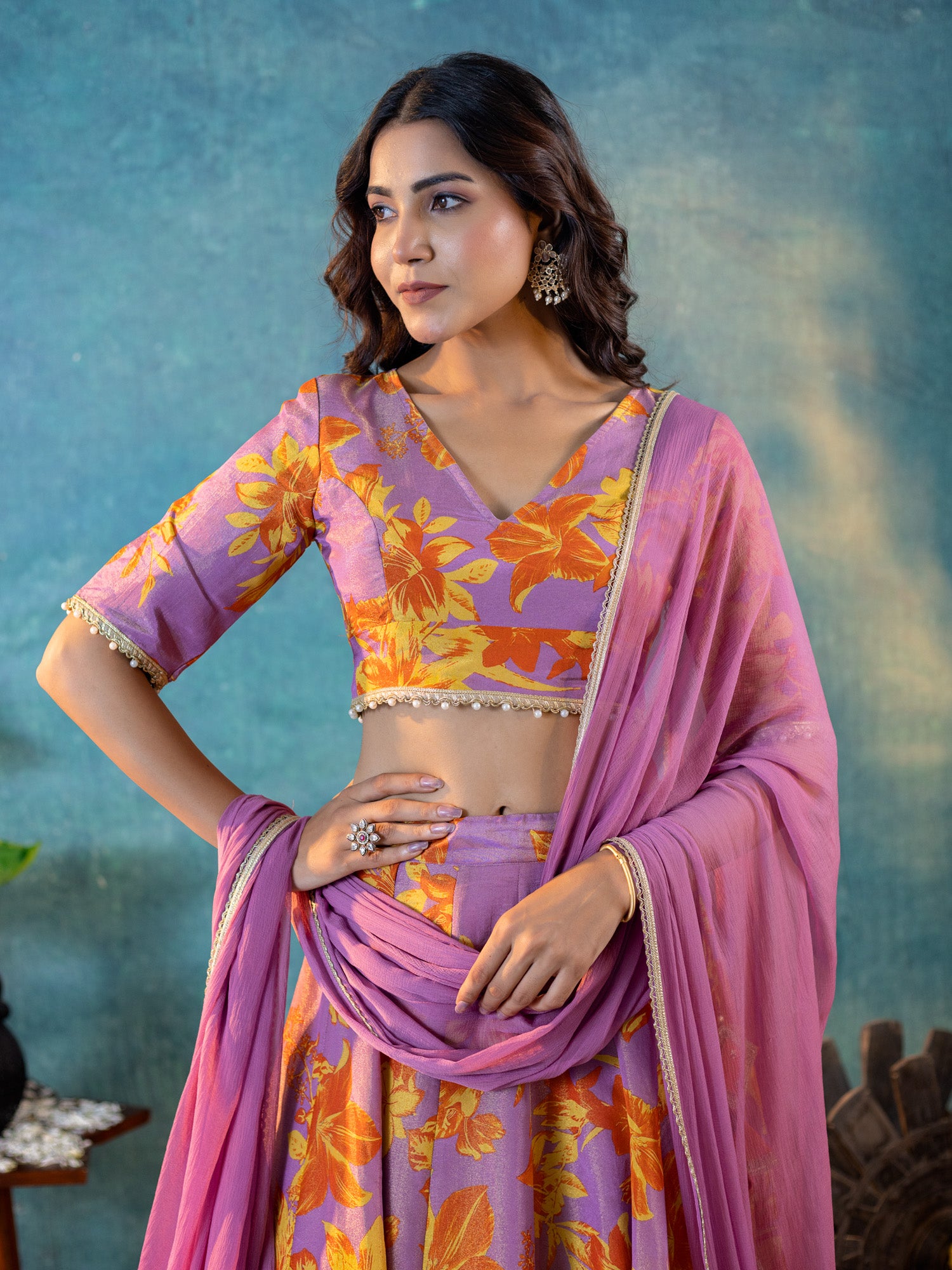 Floral Printed Tissue V-Neck Blouse And Lehenga Set With Chiffon Dupatta