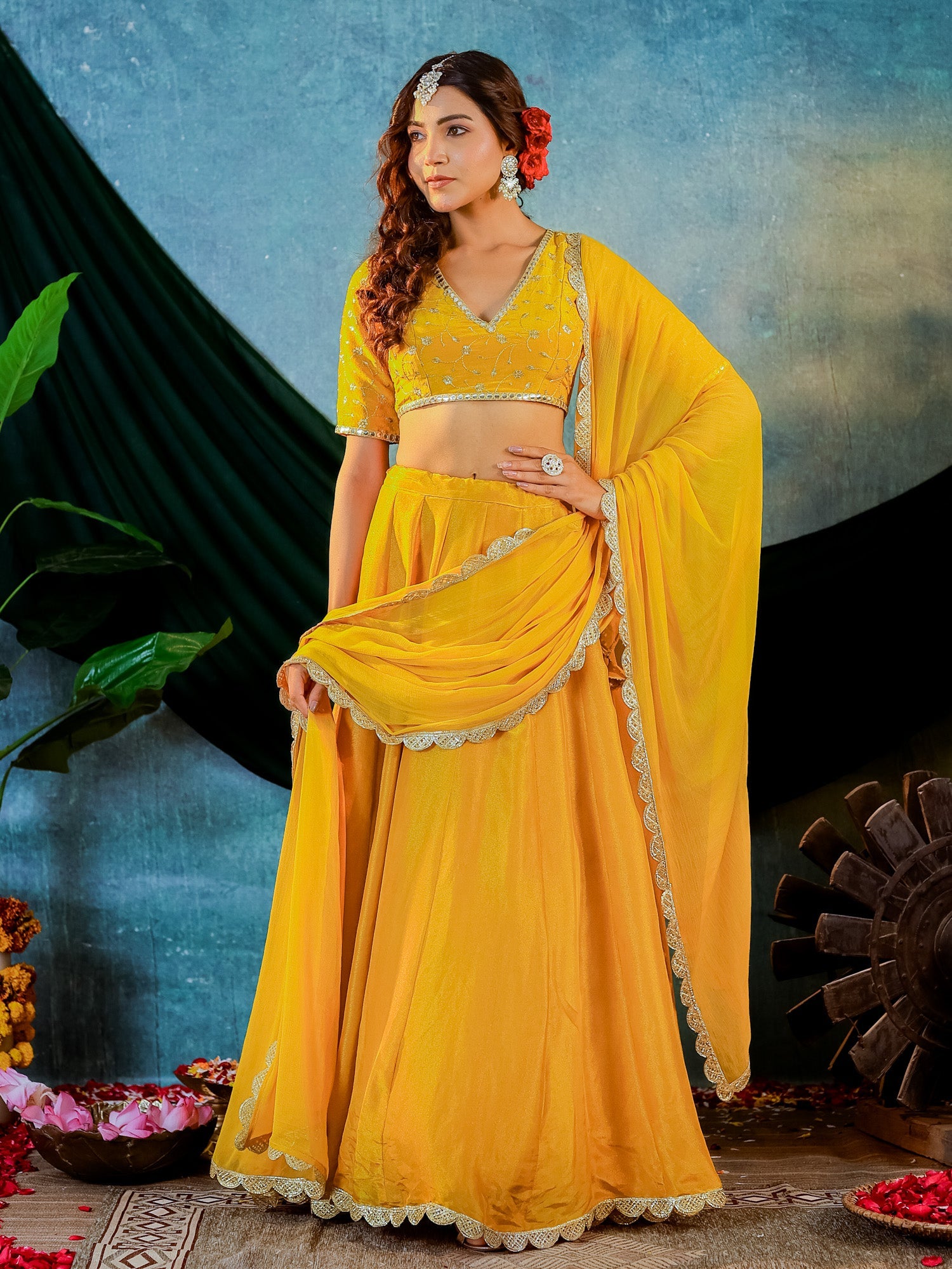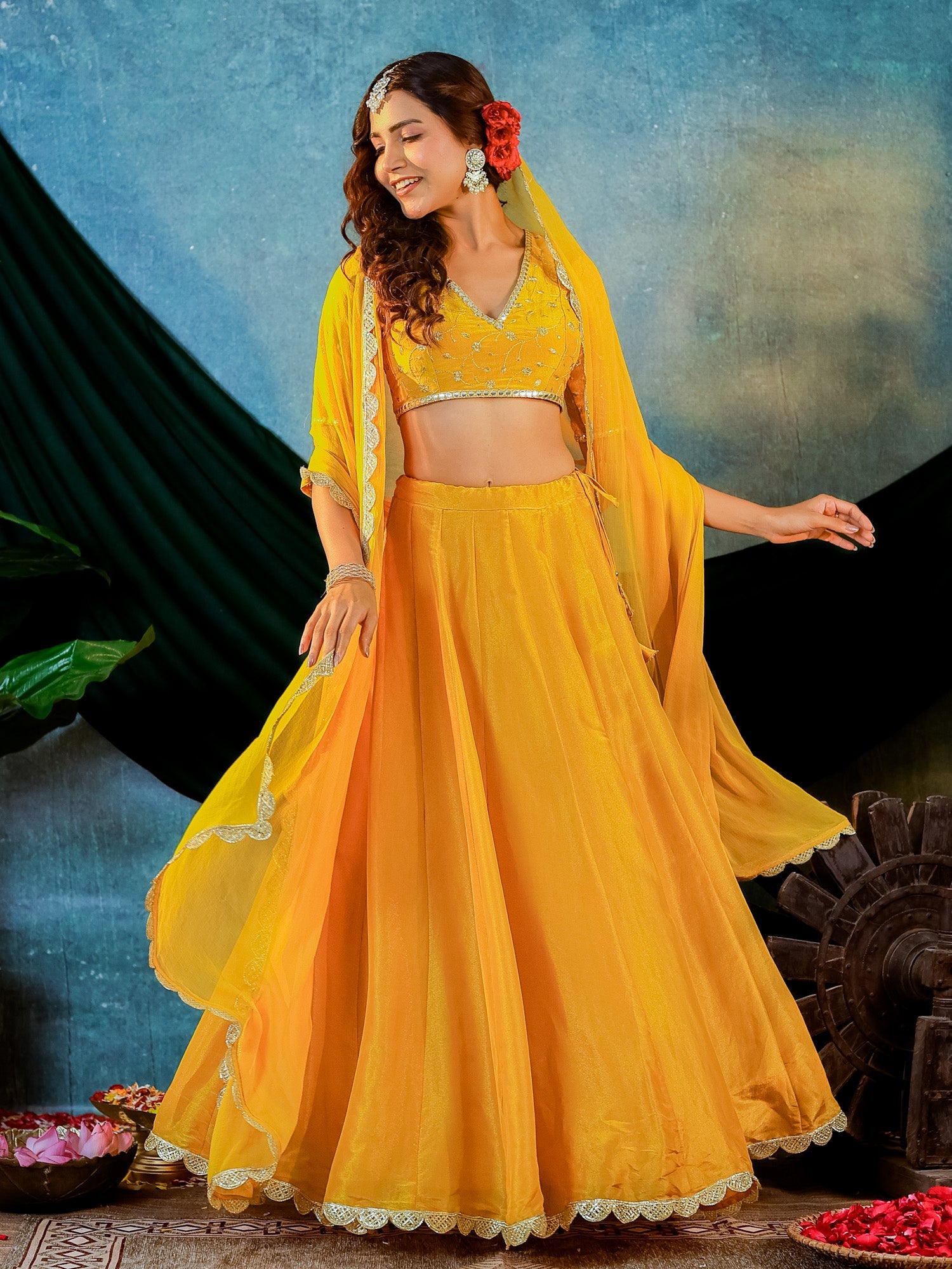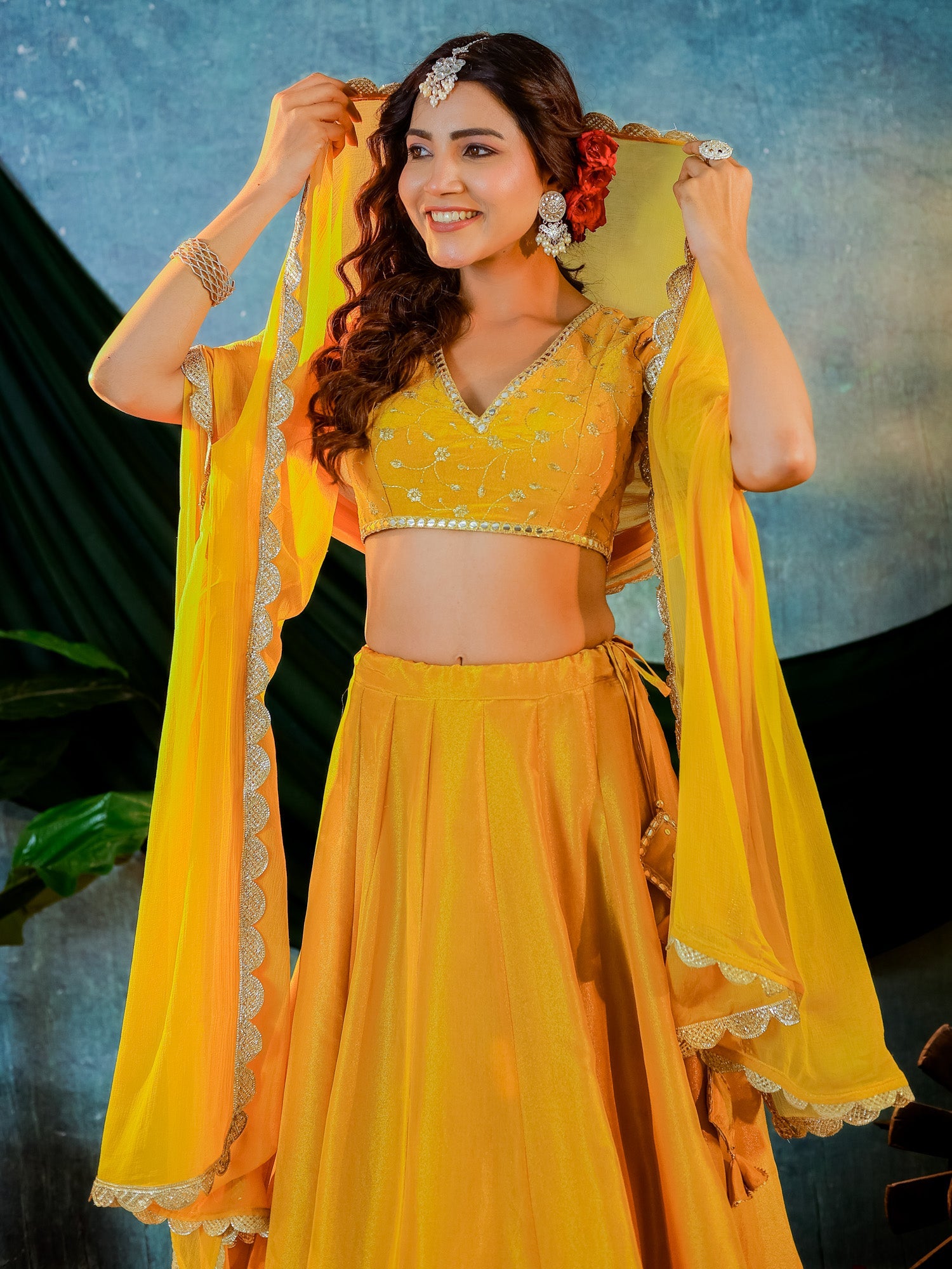 Mustard Yellow Tissue Embroidered Blouse and Lehenga With Chiffon Dupatta