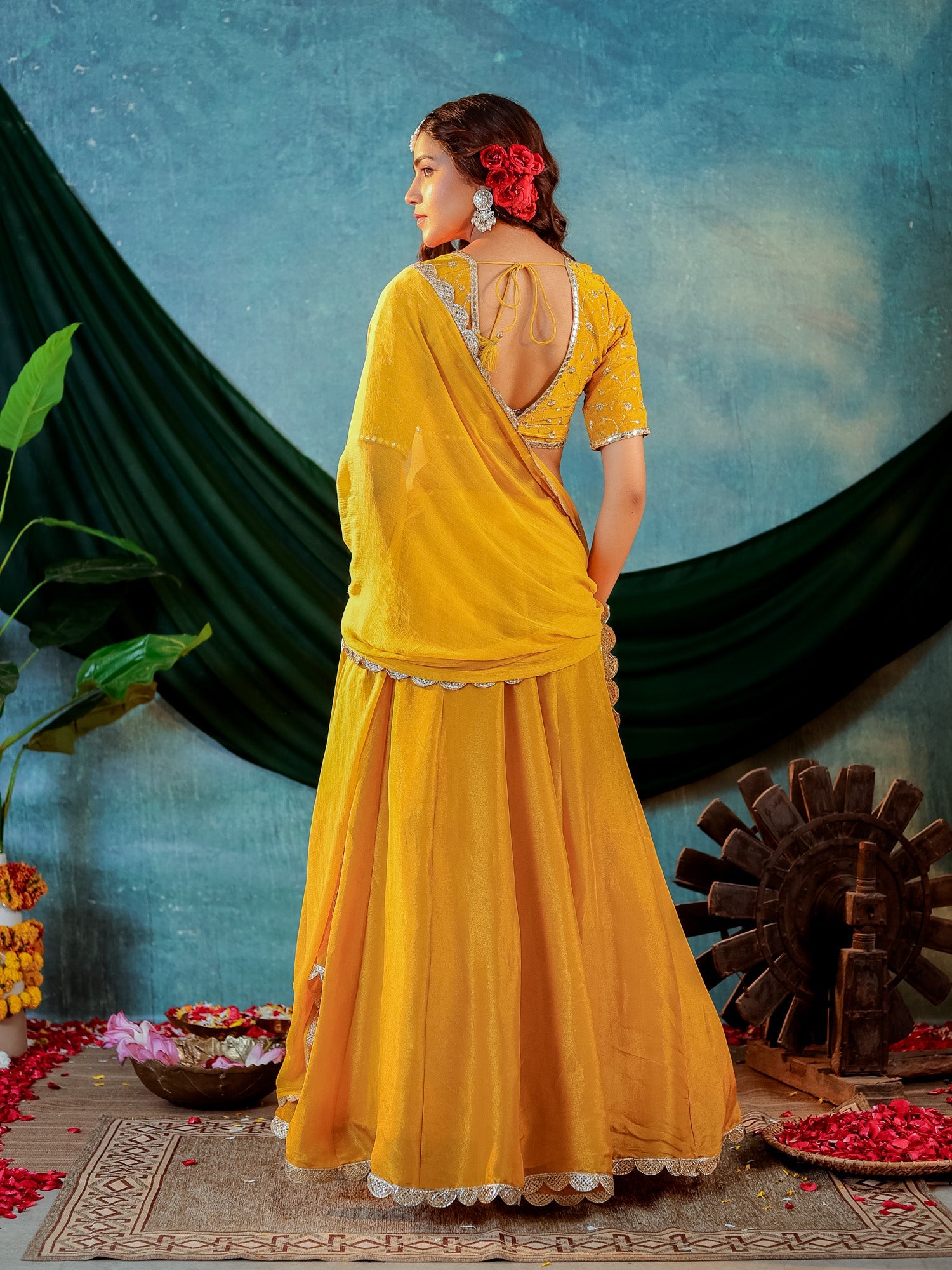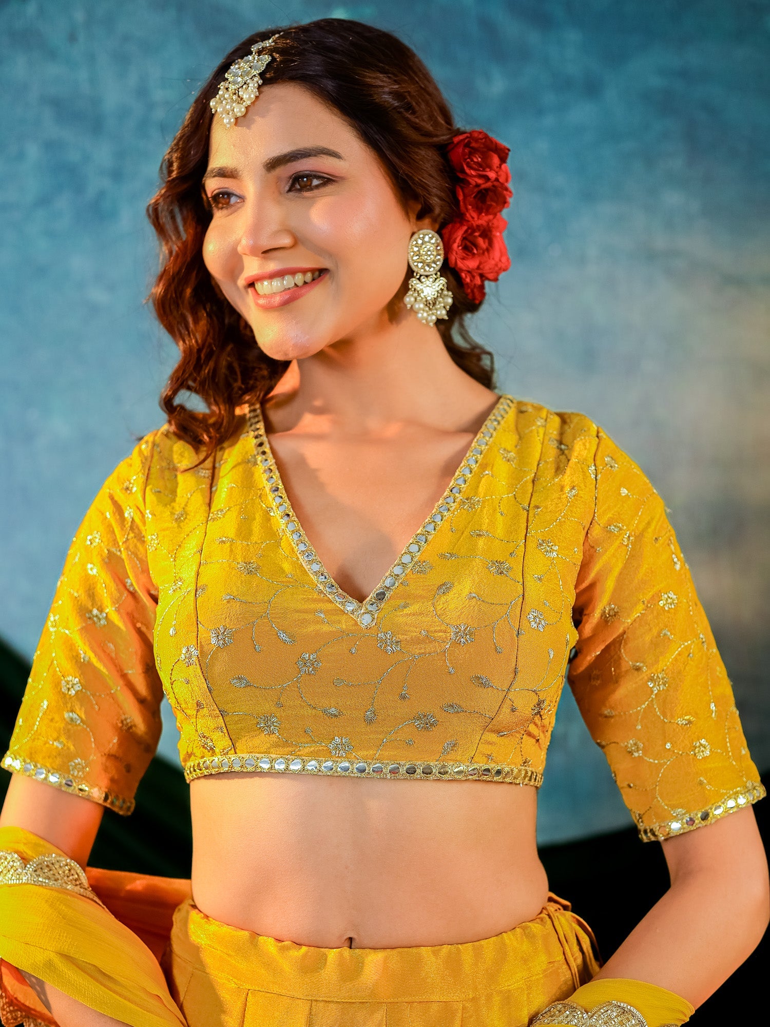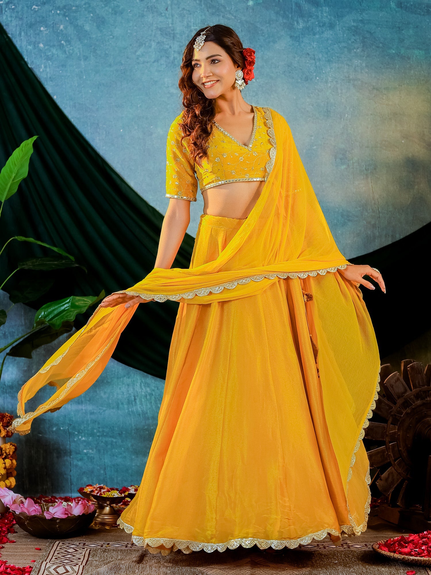 Mustard Yellow Tissue Embroidered Blouse and Lehenga With Chiffon Dupatta