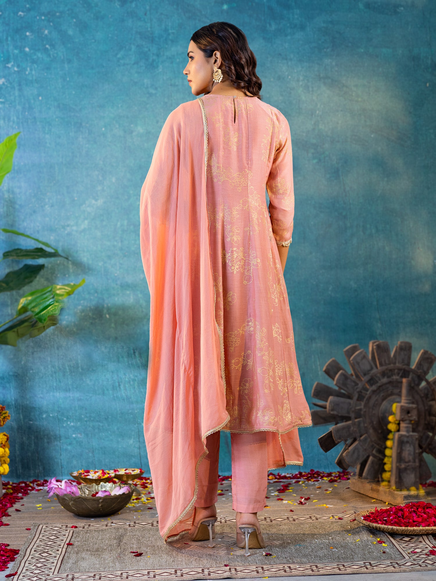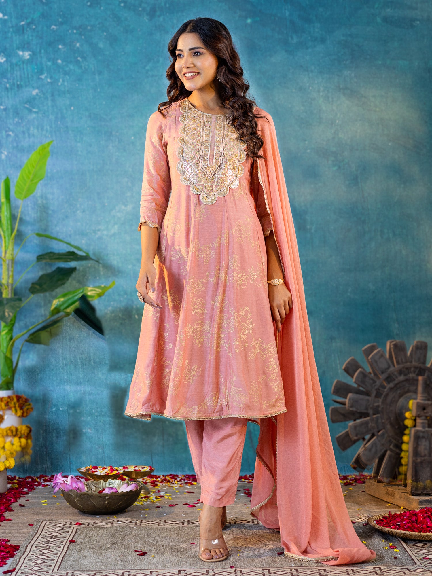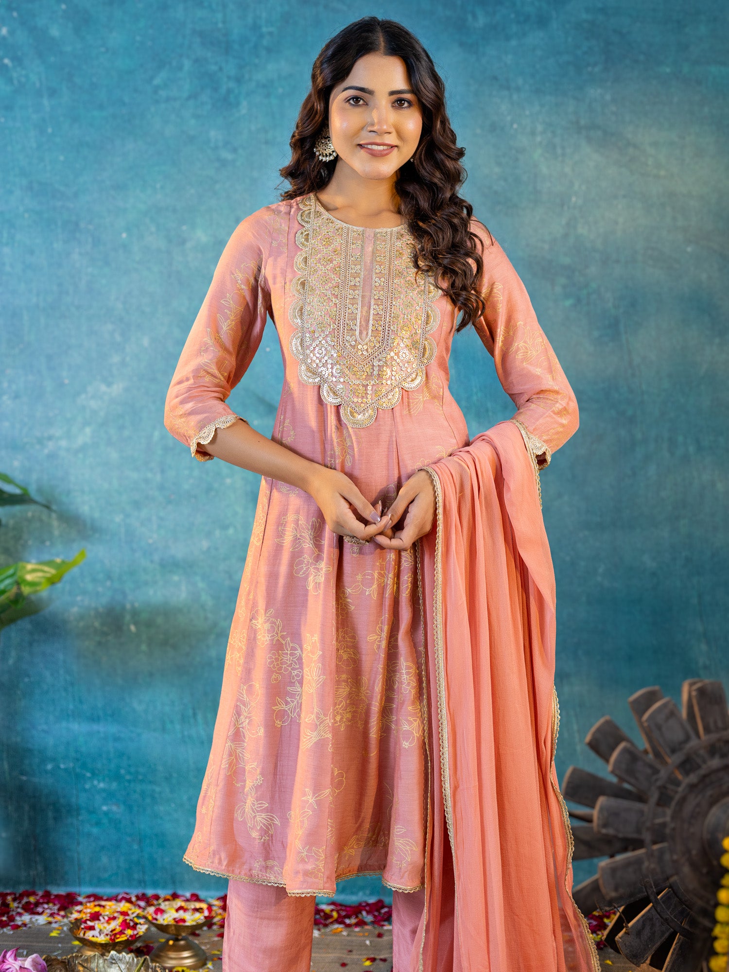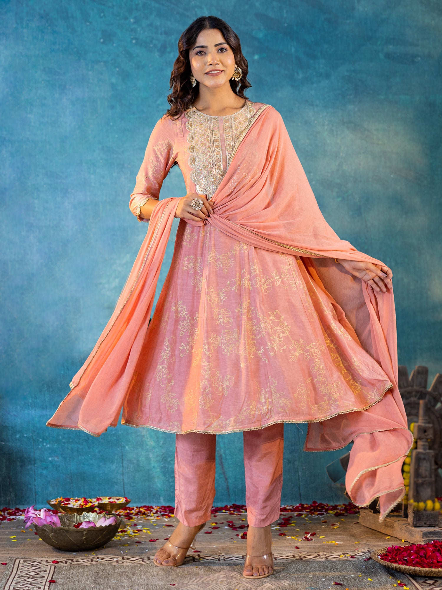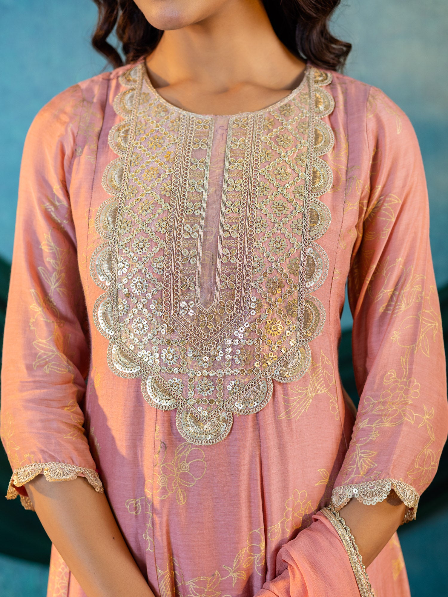 Baby Pink Sequin Embroidered Kurta Set With Chiffon Dupatta