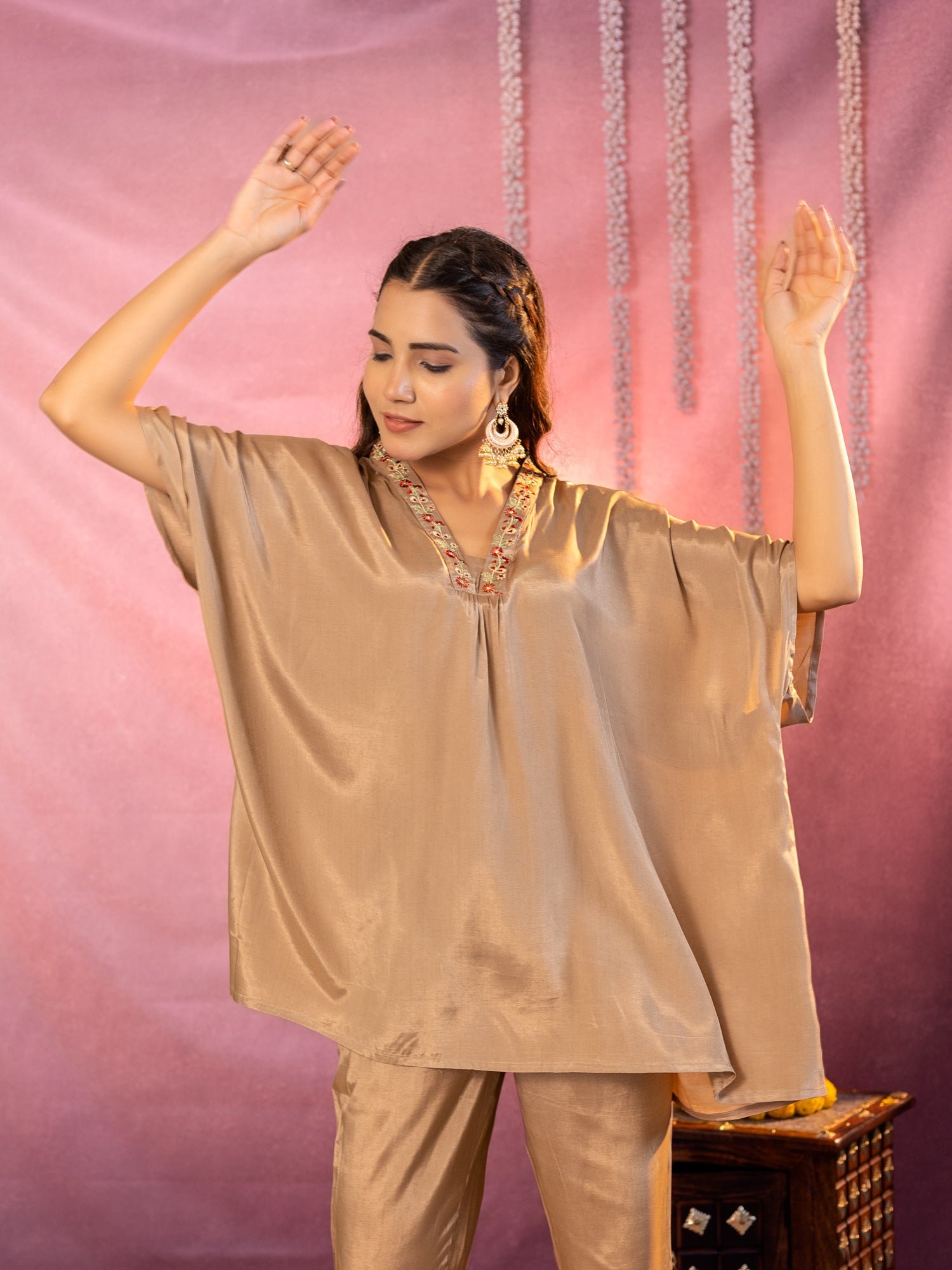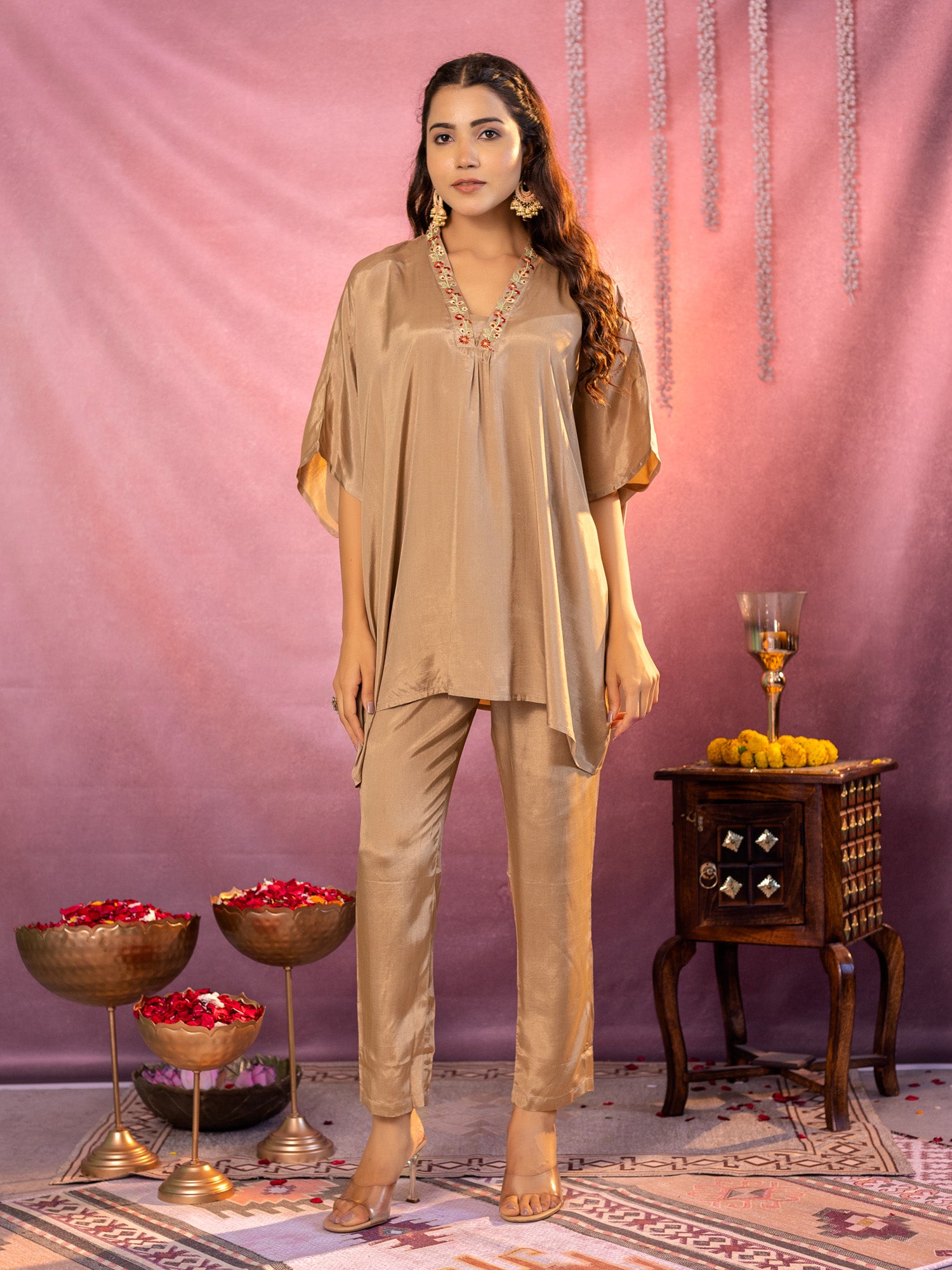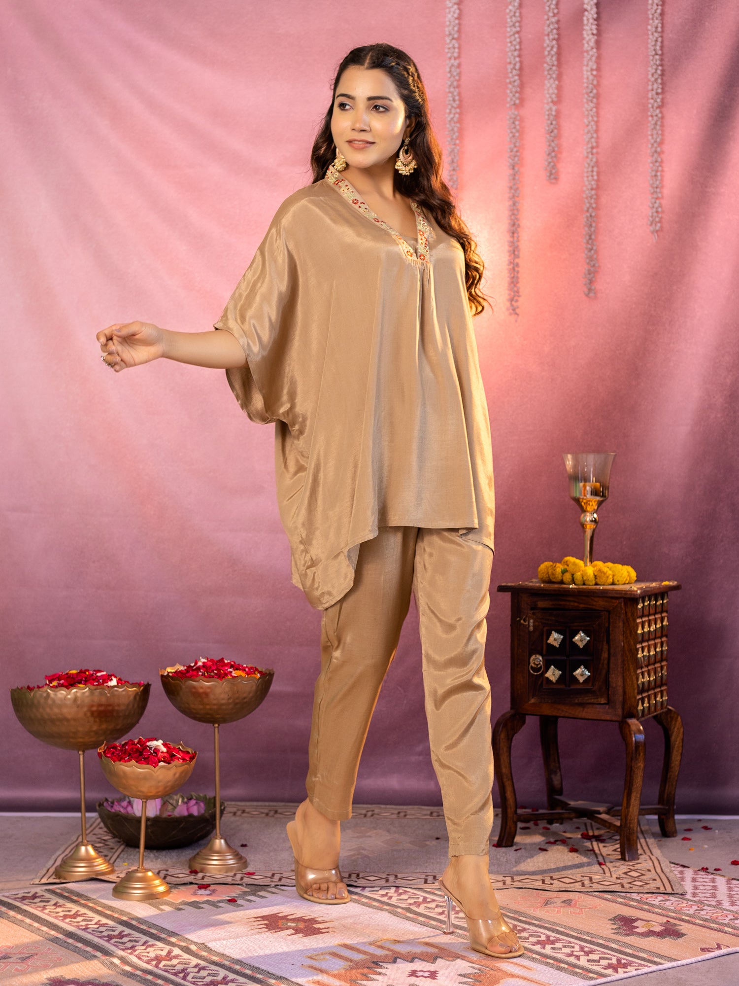 Beige Santoon V-Neck Kaftan Co Ord Set