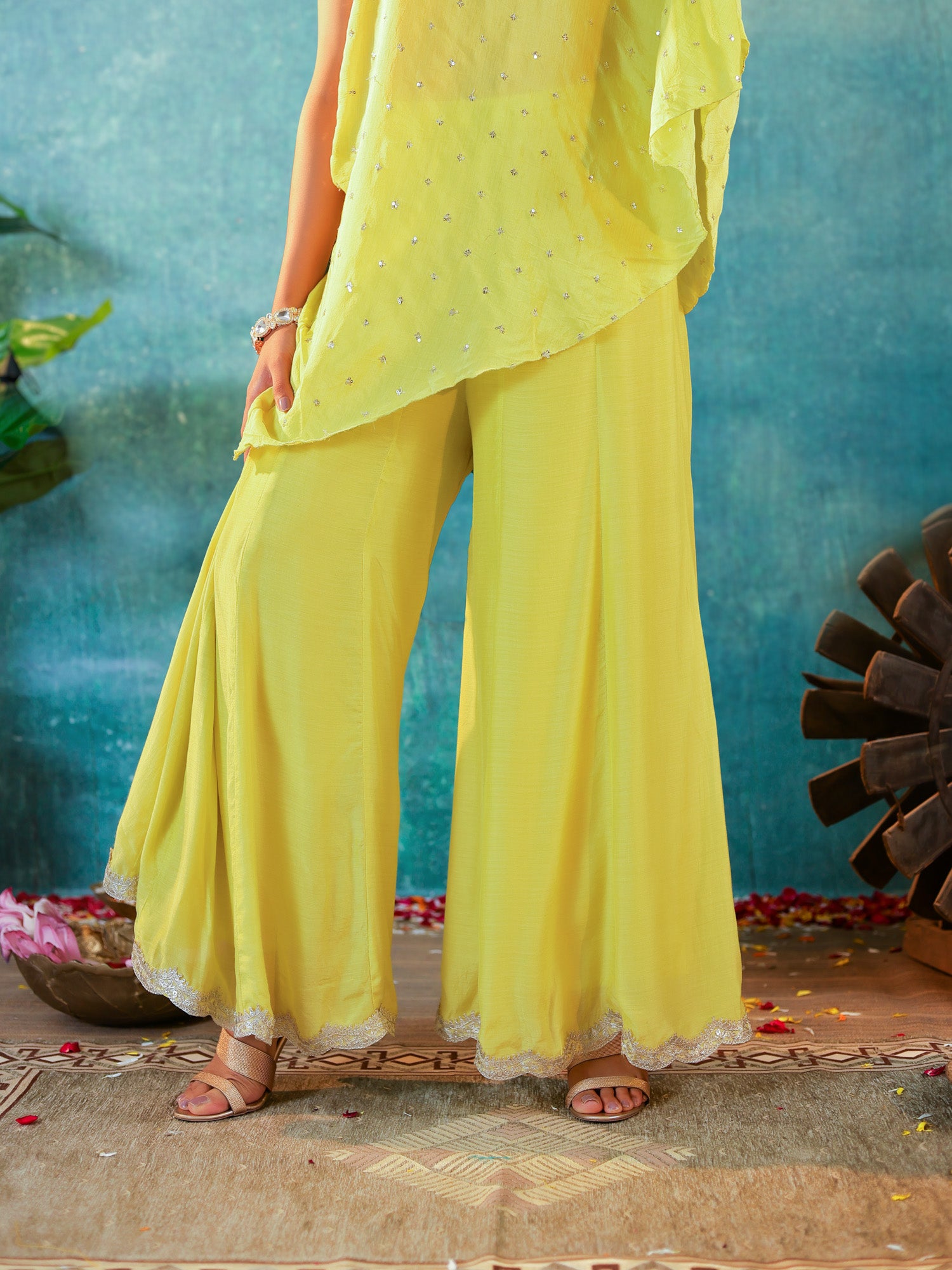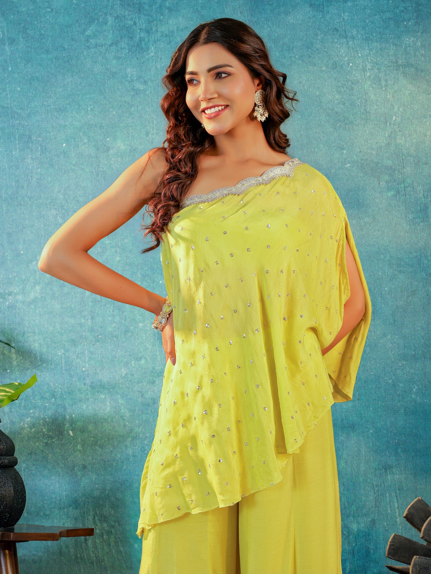 Green Embroidered Off-Shoulder Muslin Co-Ord Set With Bell-Bottom Pant