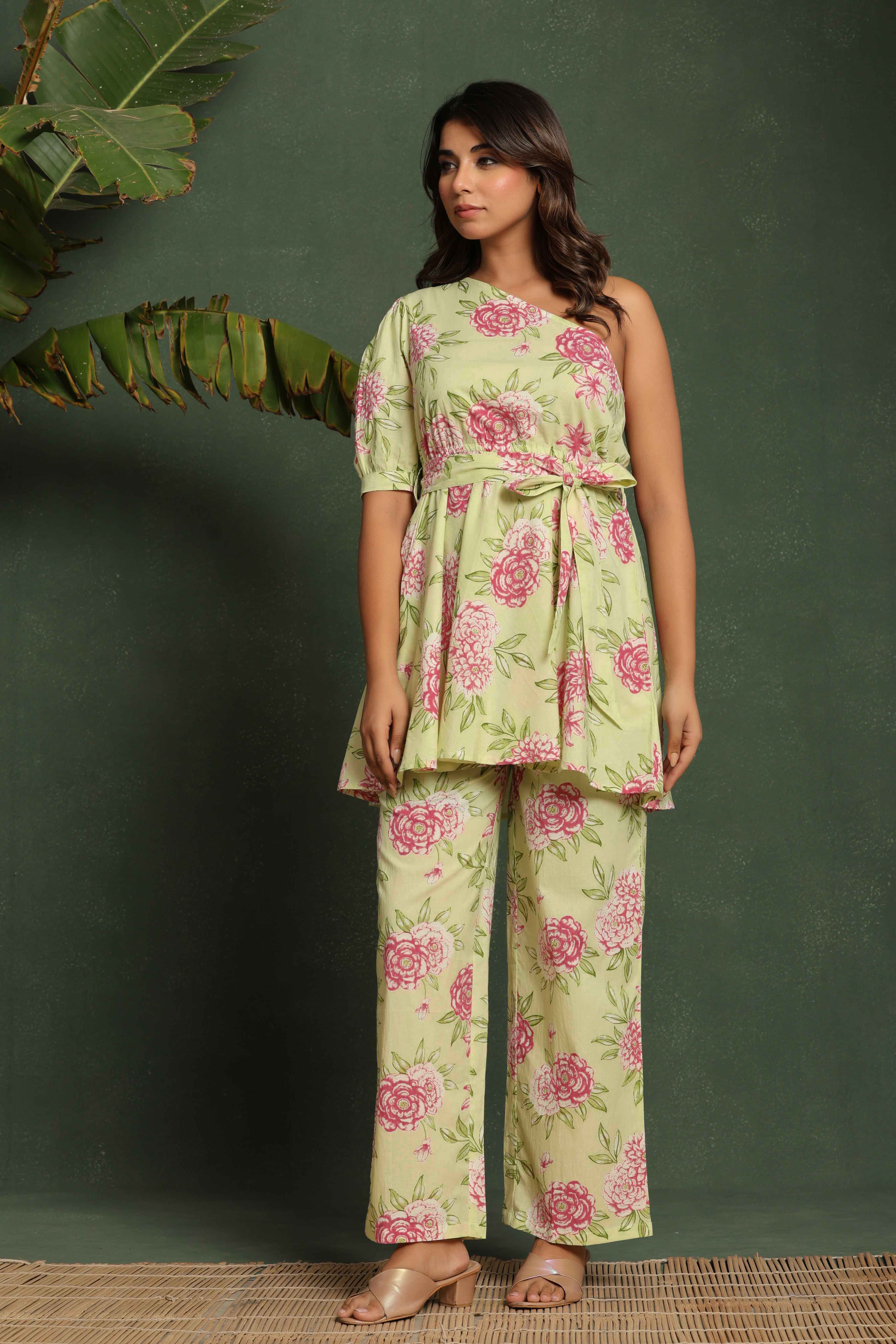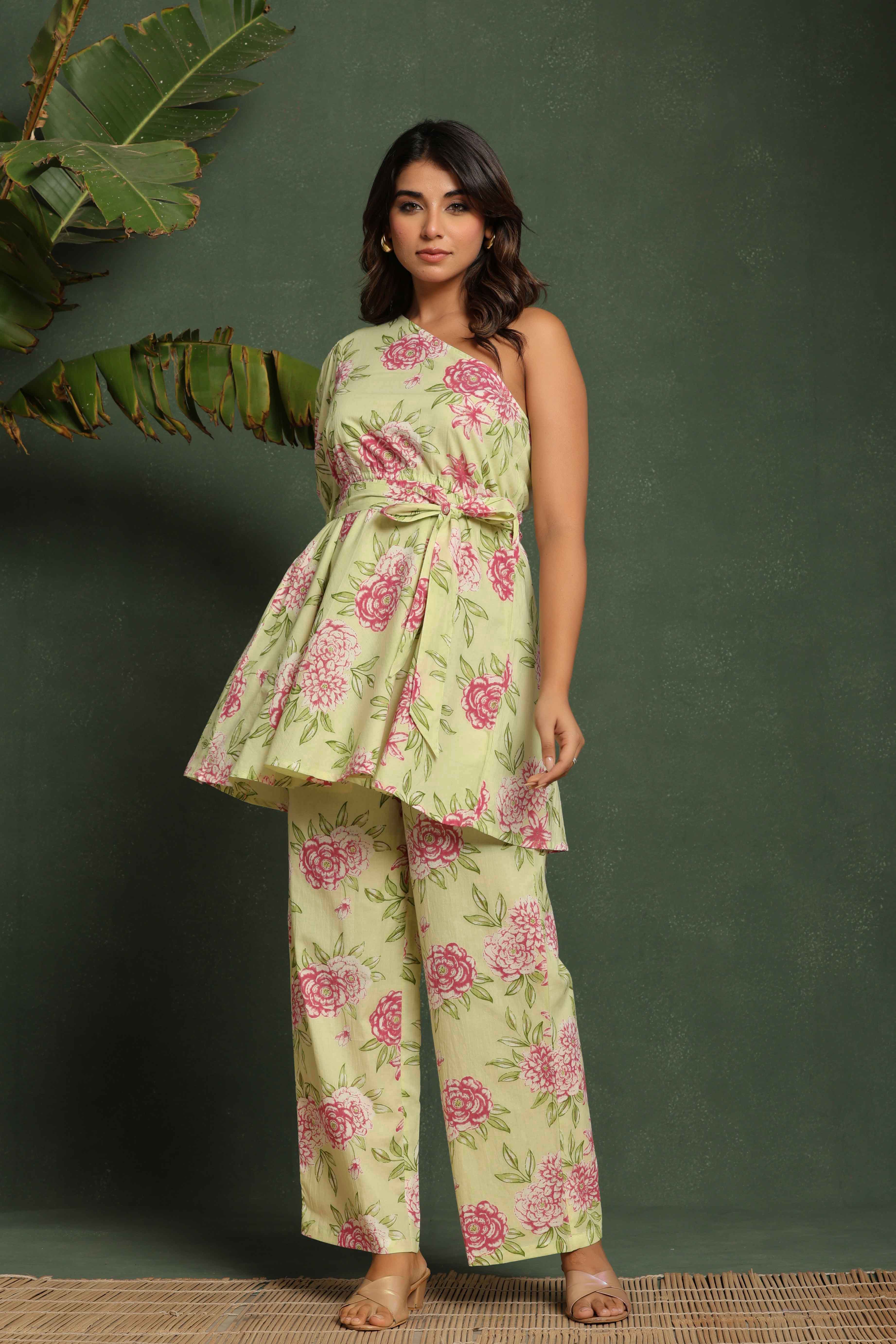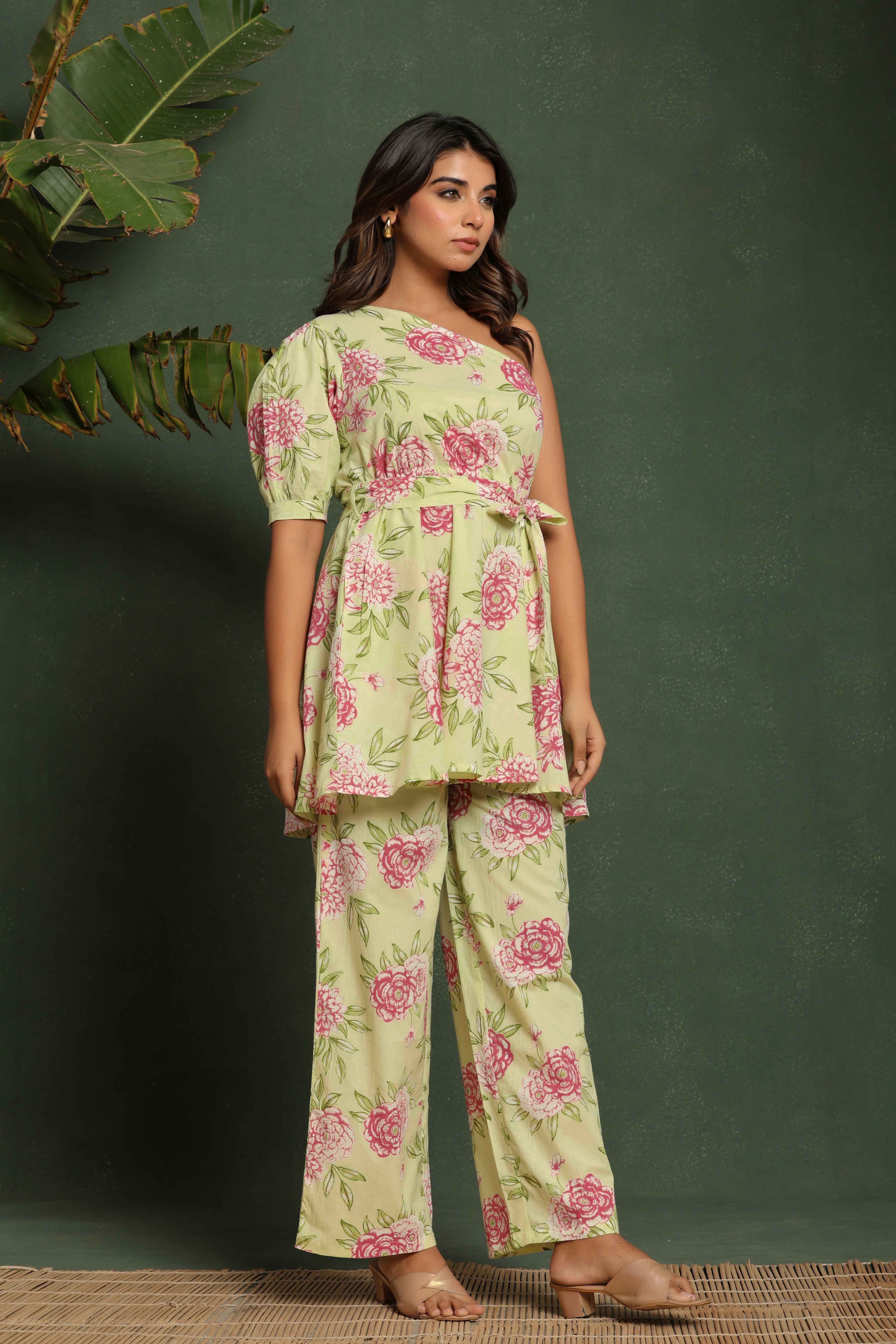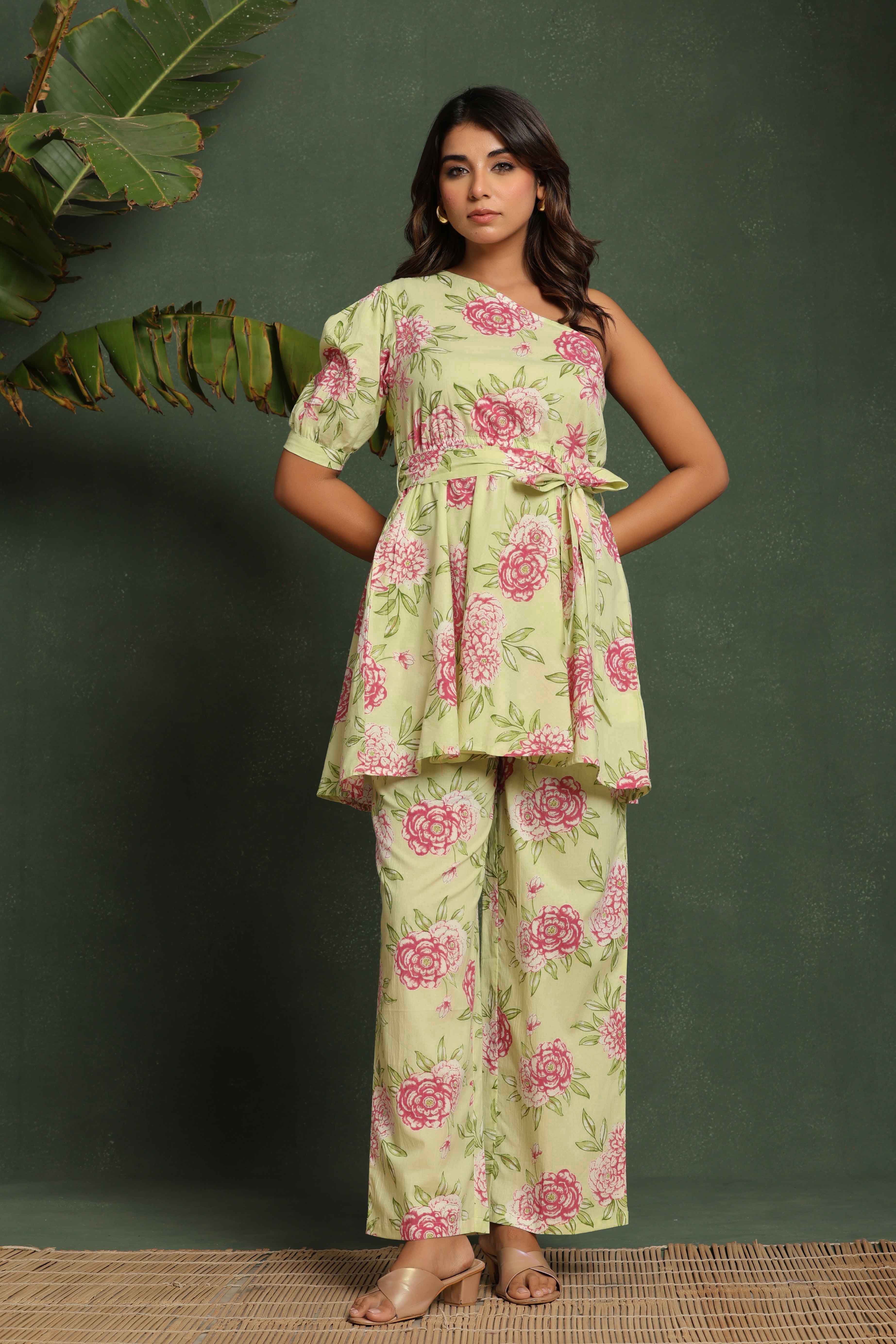 Green Printed Pure Cotton One-Shoulder Co-Ord Set