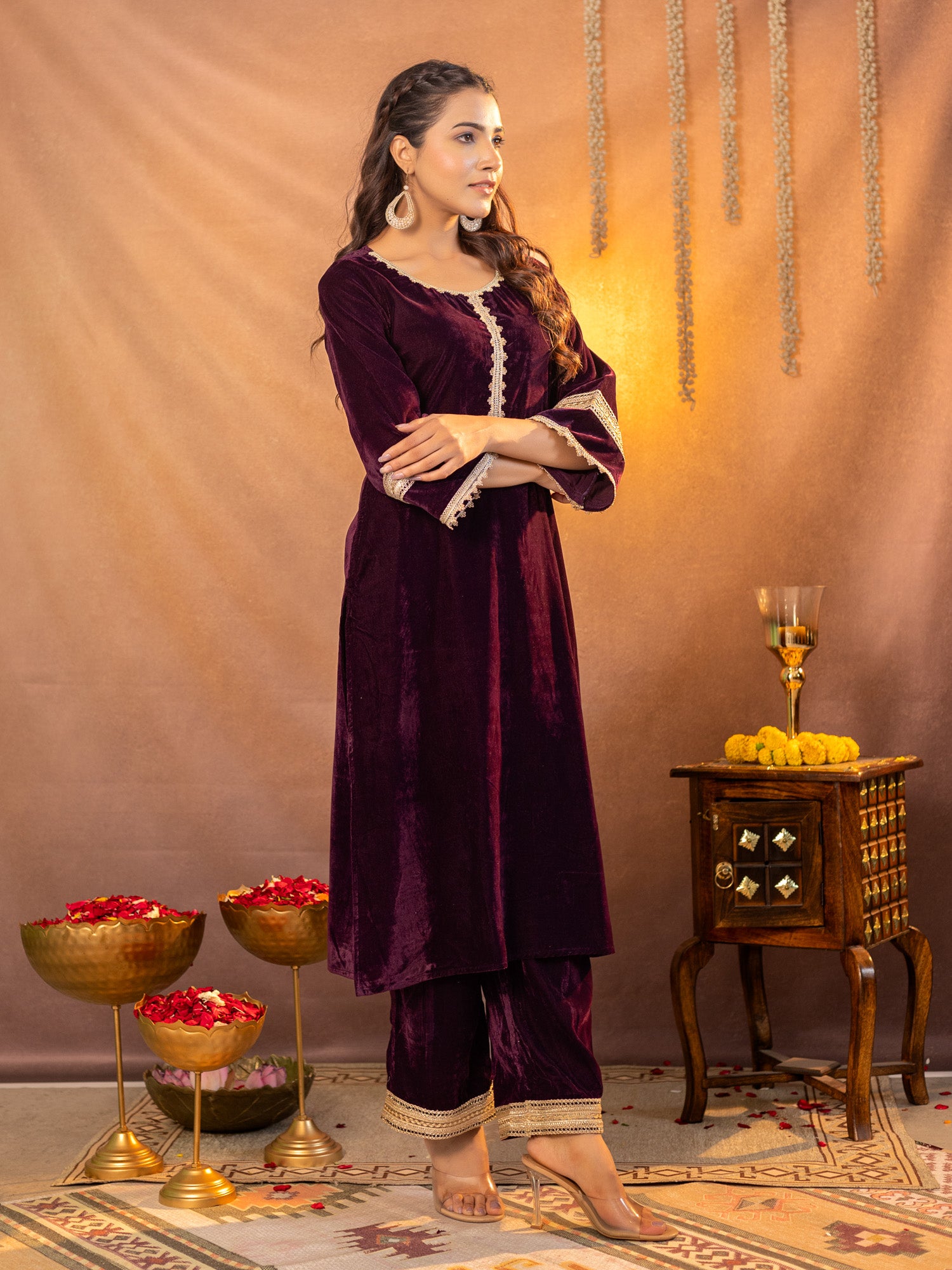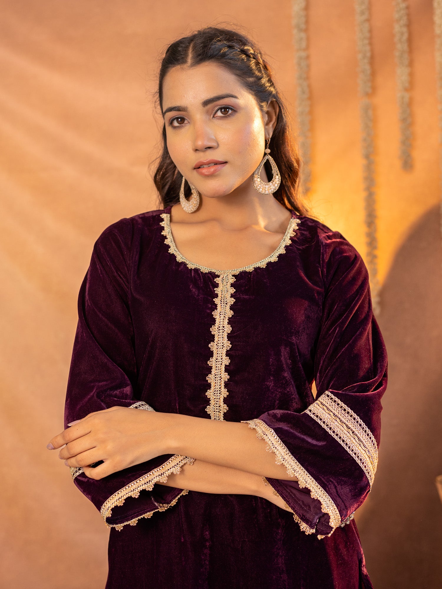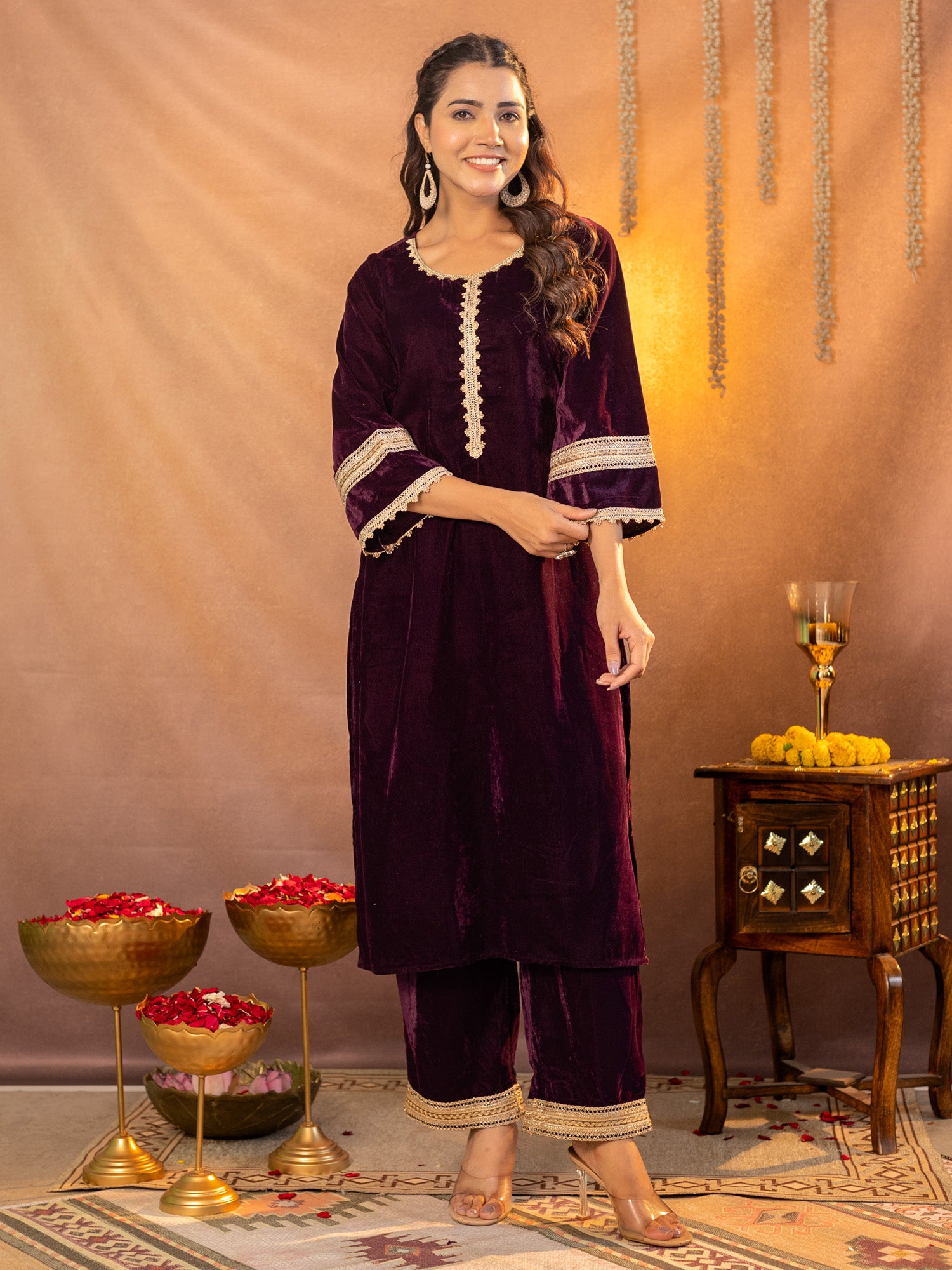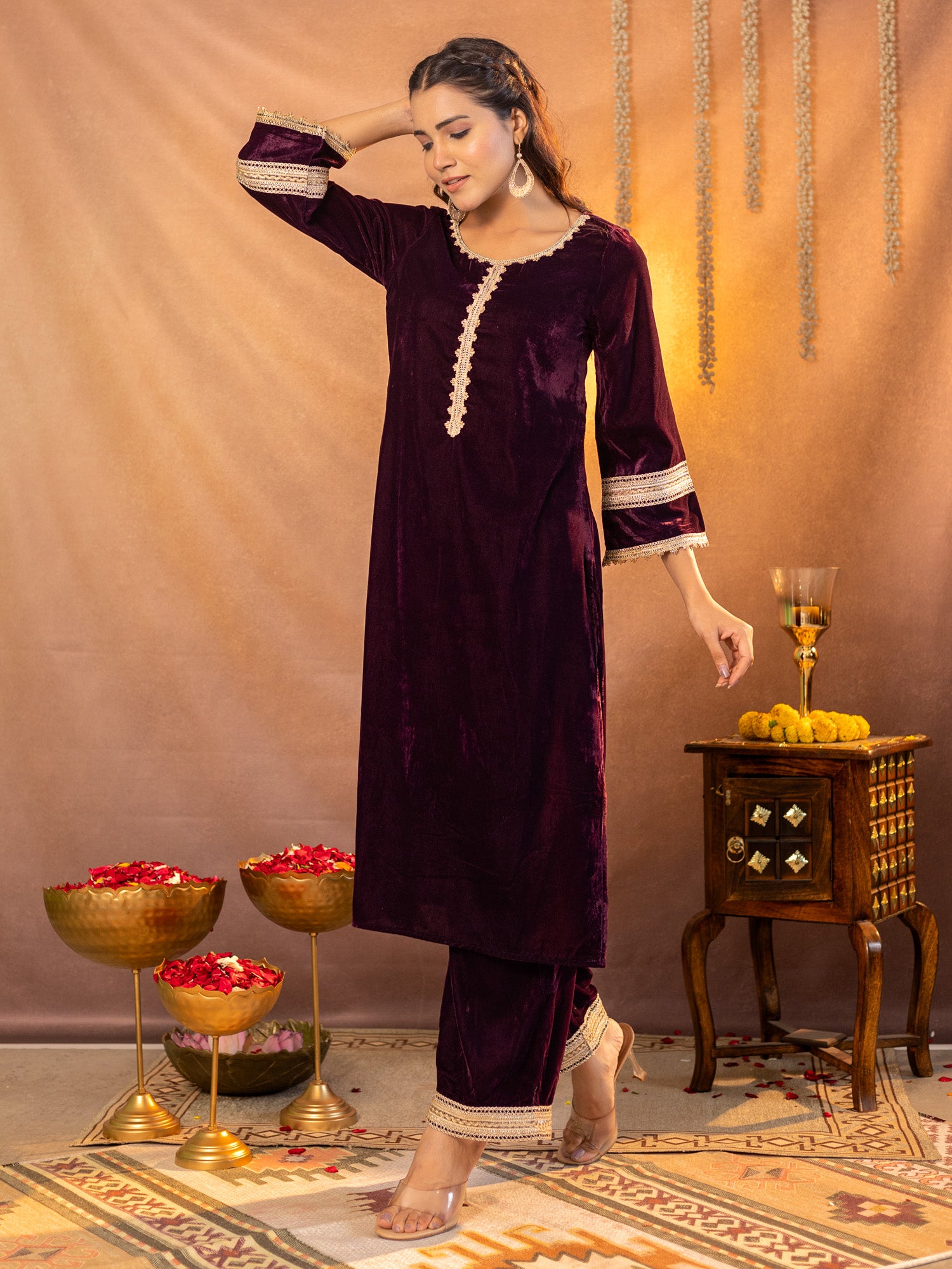 Luxe Maroon Velvet Kurta And Pant Co-ord Set