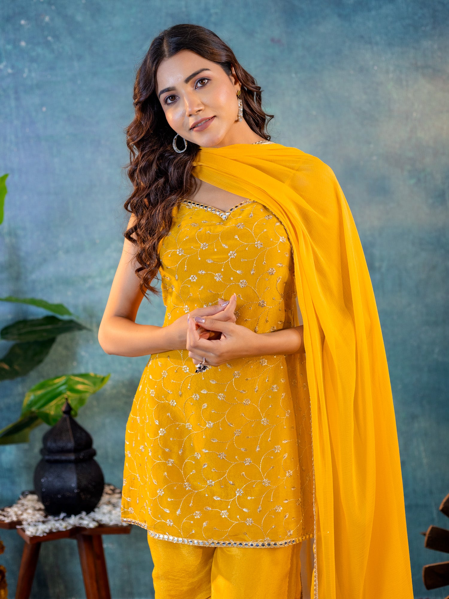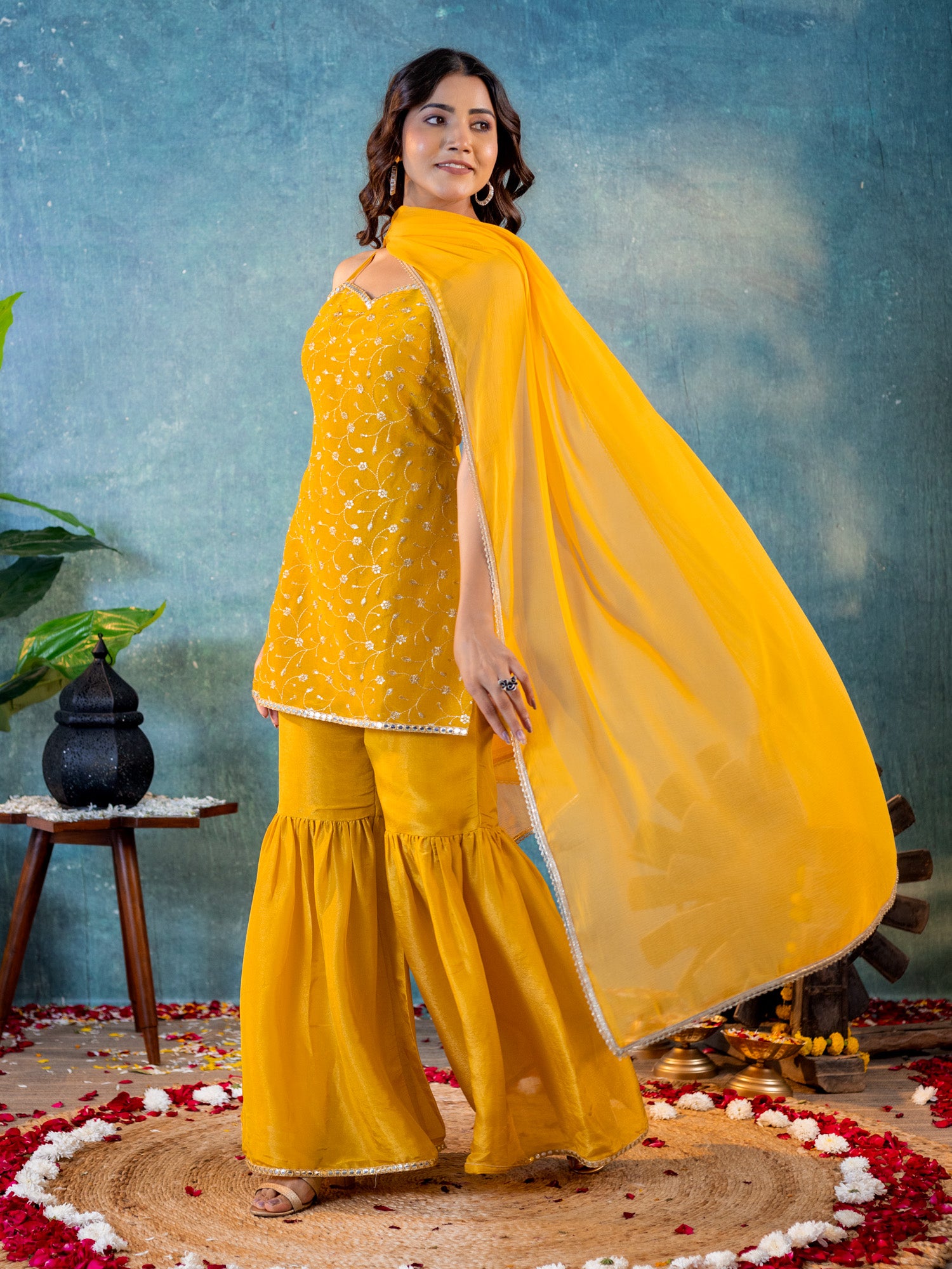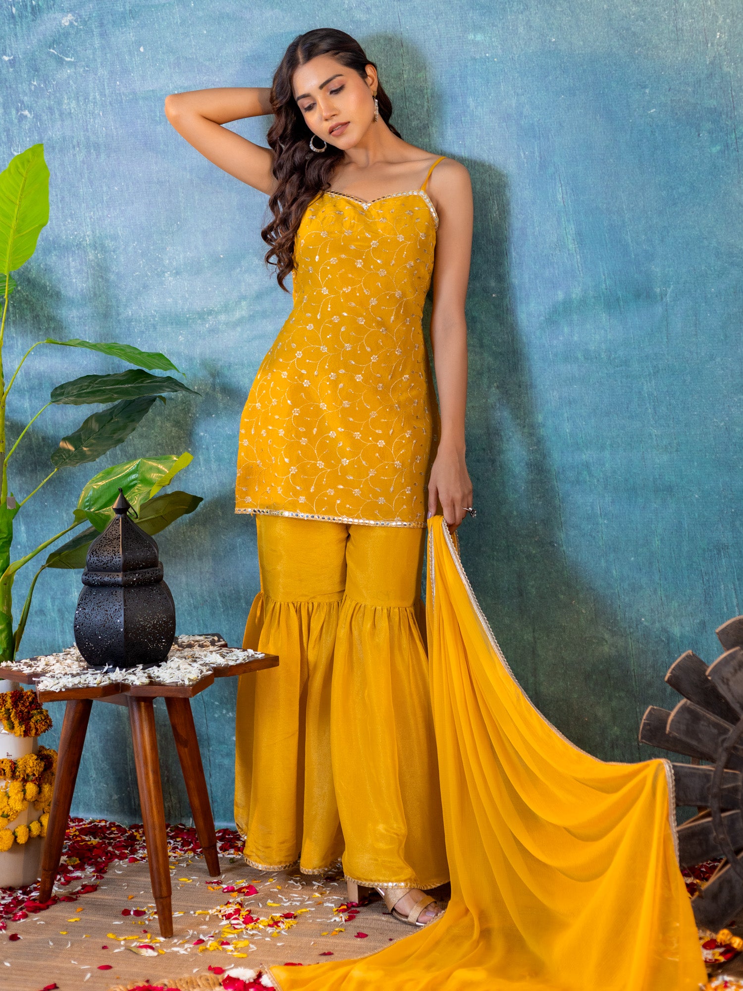 Mustard Tissue Embroidered Kurta & Sharara Pant with Najneen Dupatta