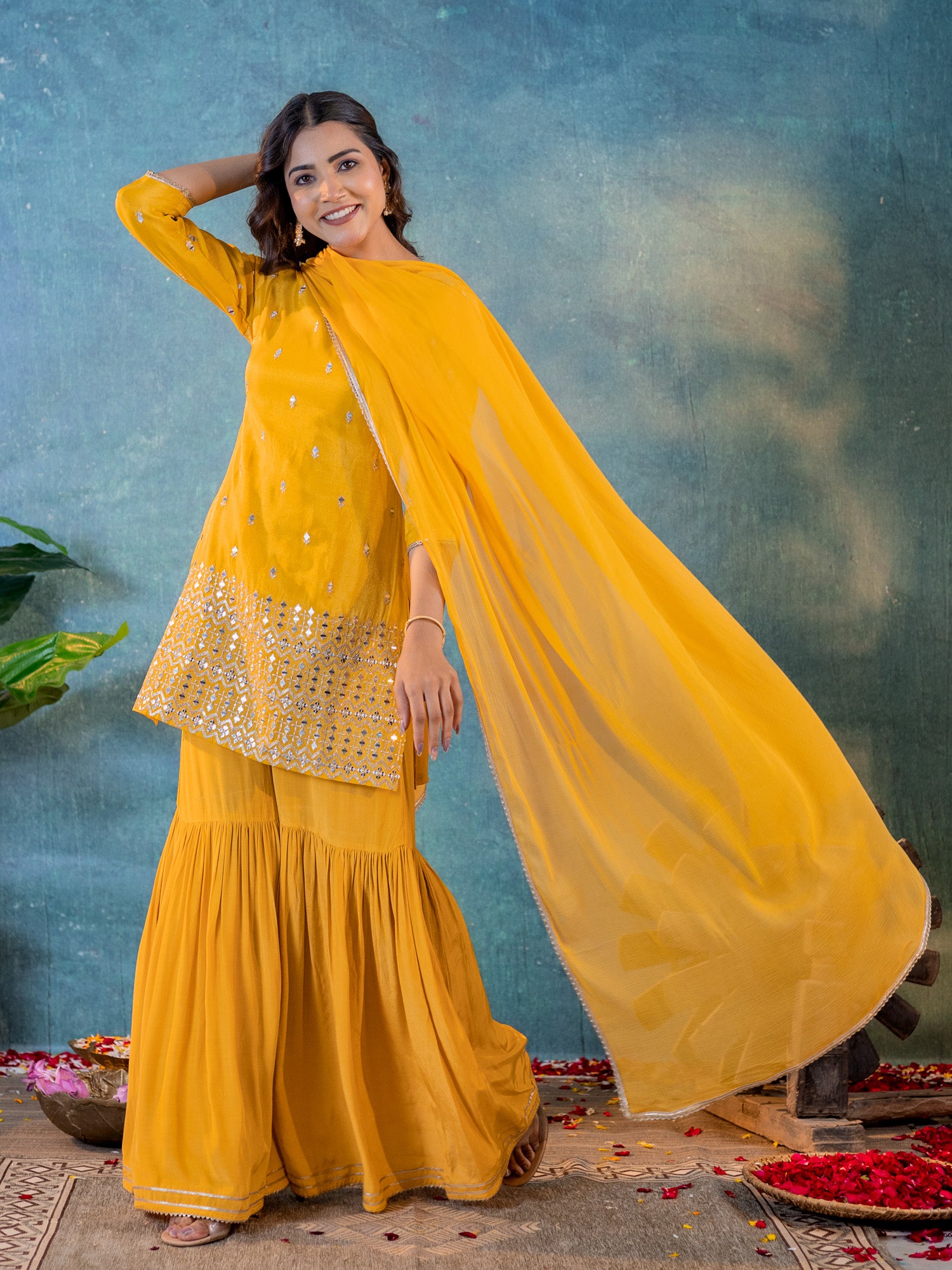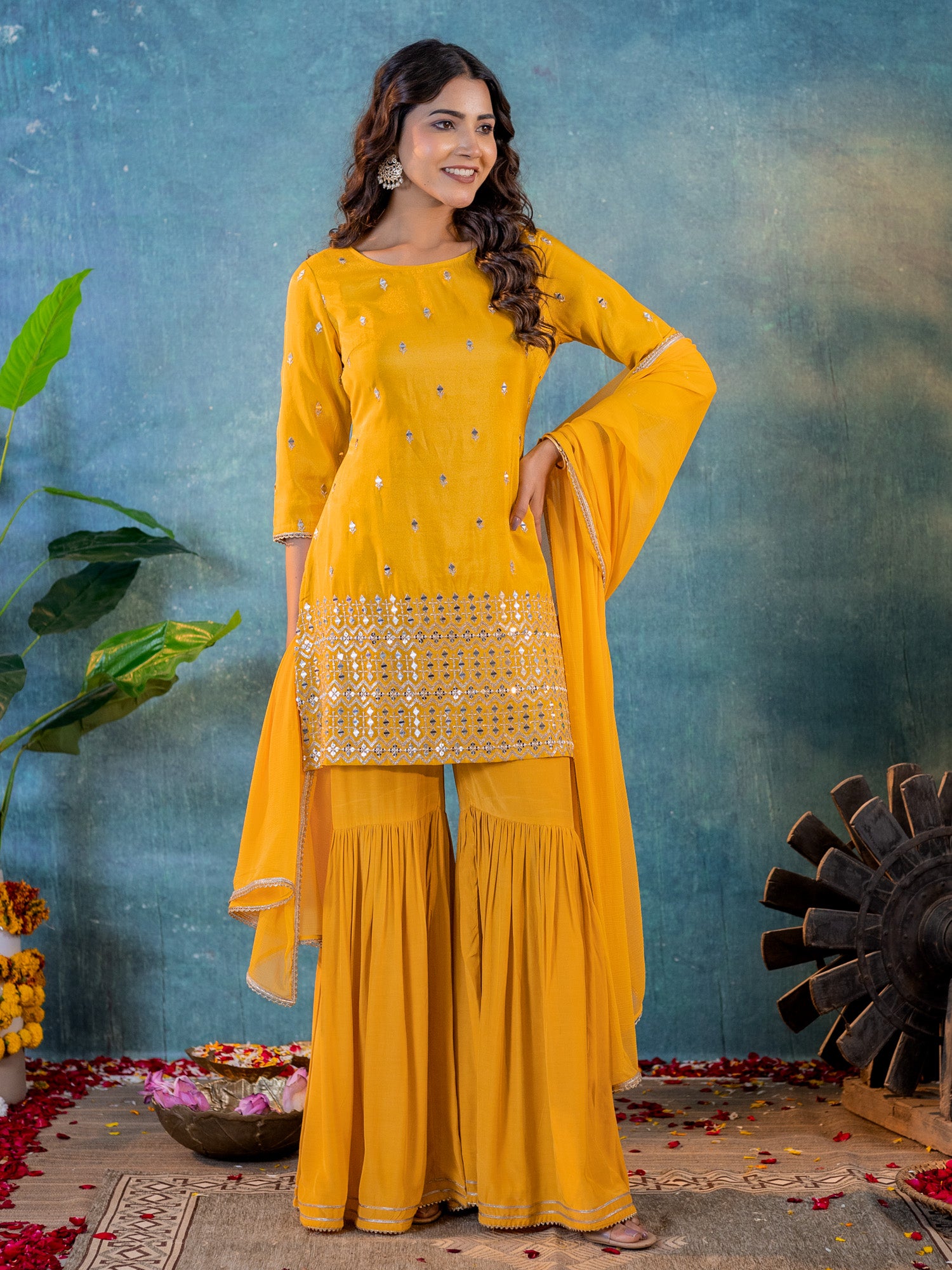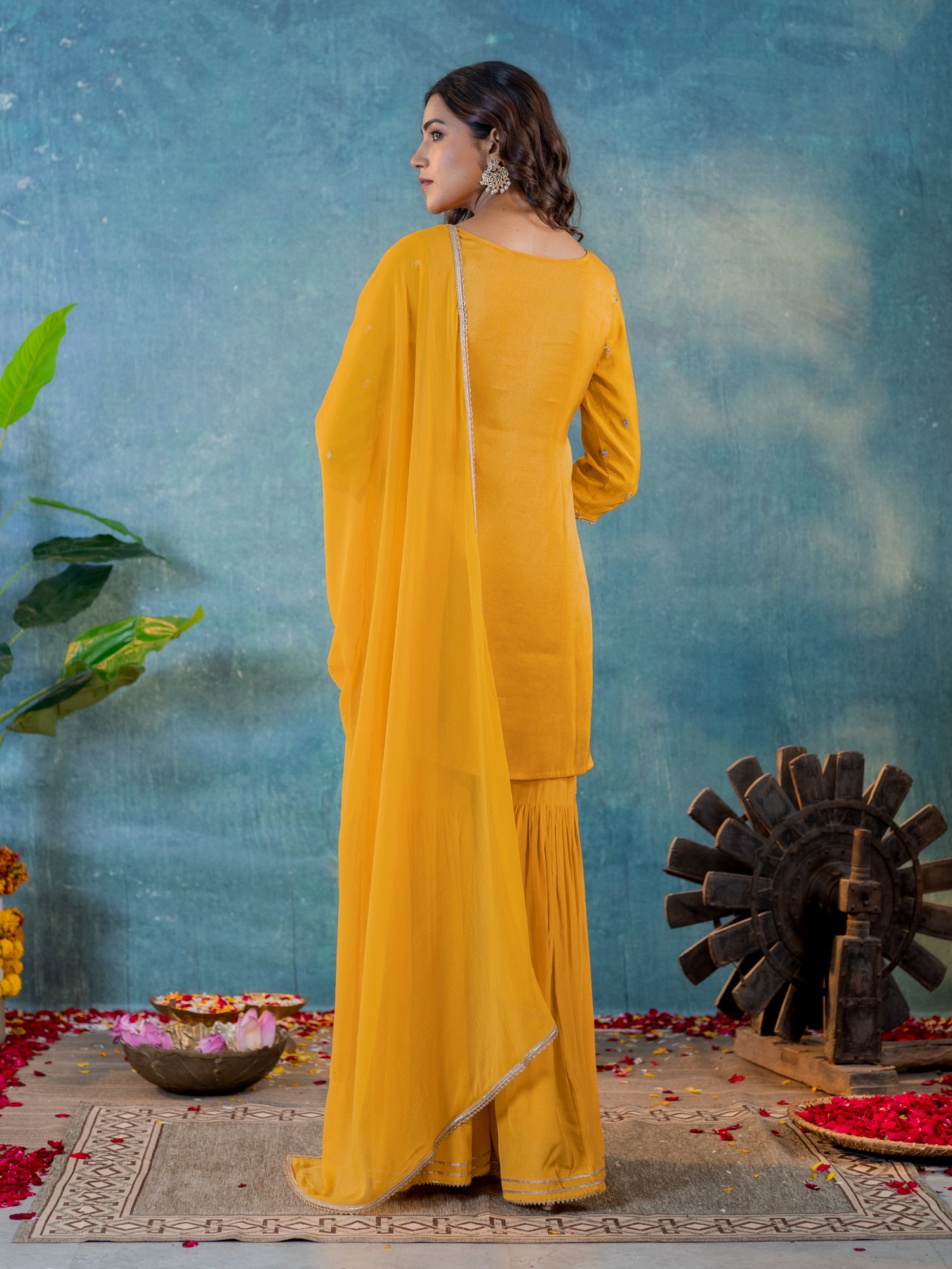 Mustard Tissue Embroidered Kurta & Sharara Pant with Najneen Dupatta