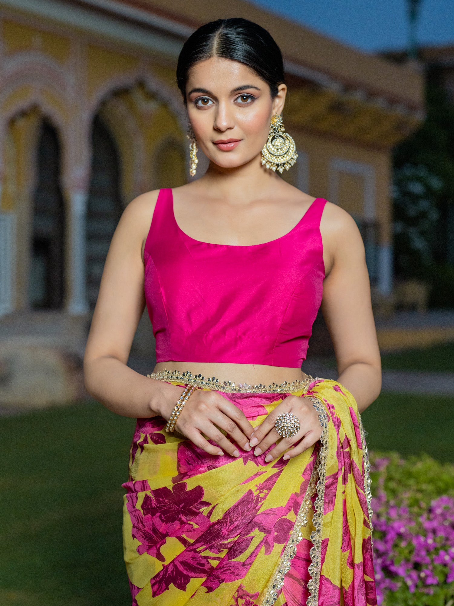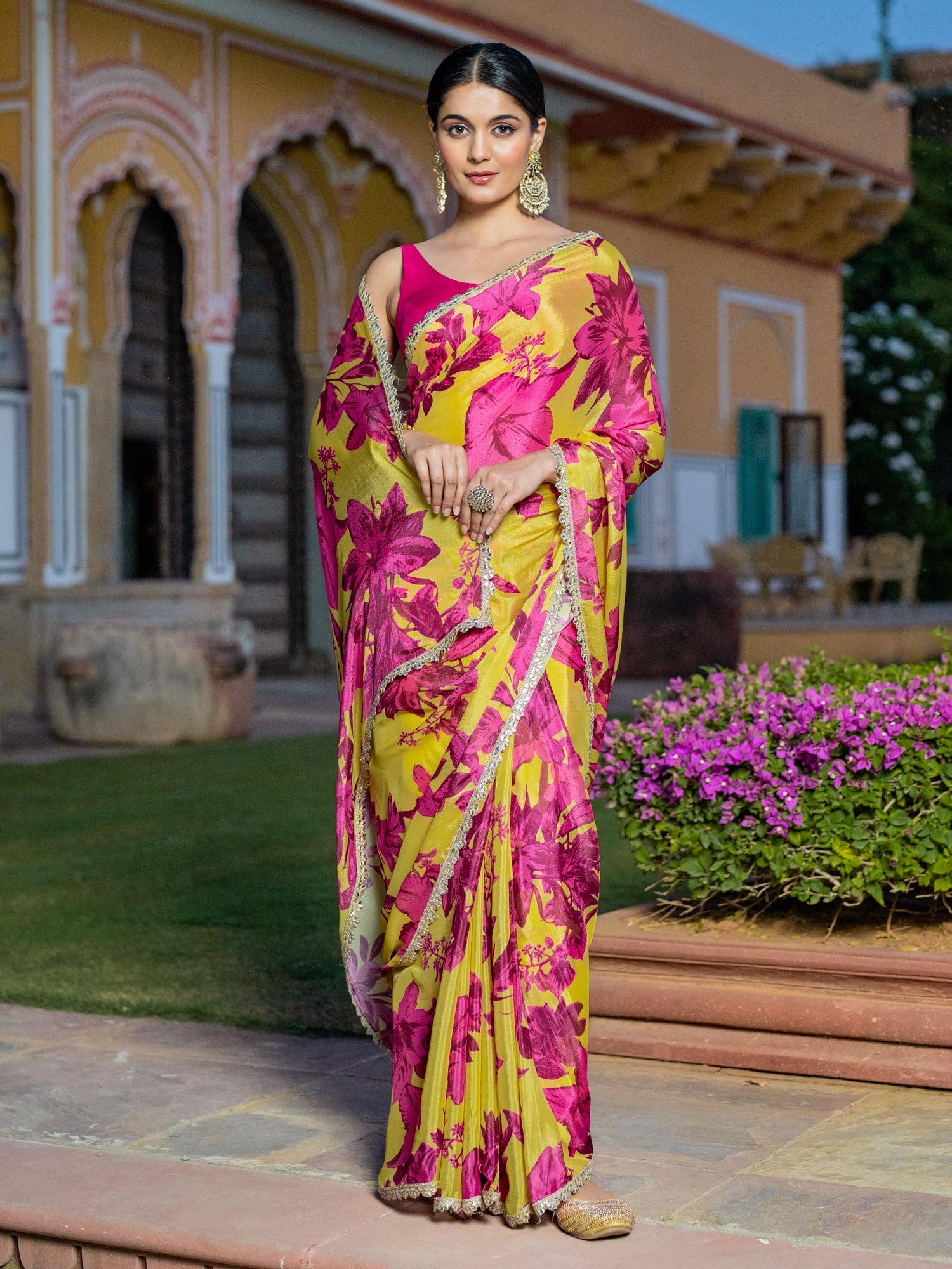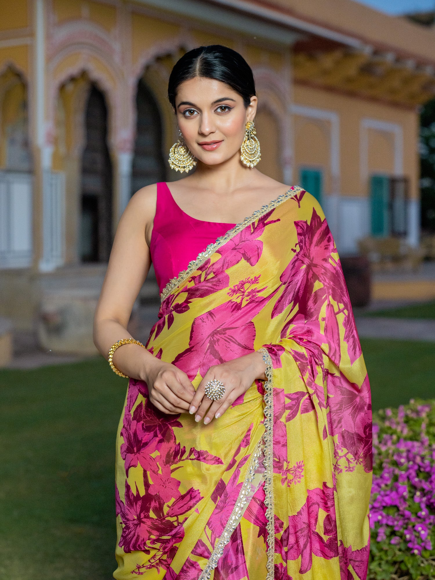 Yellow Festive Saree in Pure Chinon Fabric with Sleeveless Blouse
