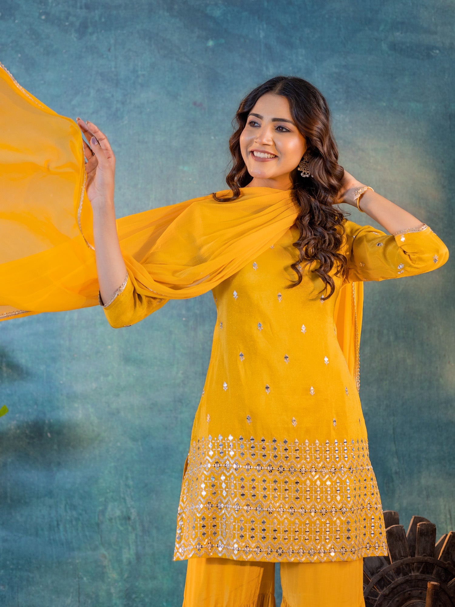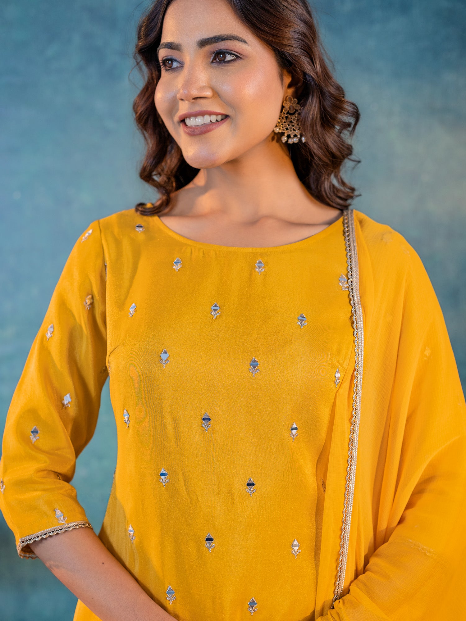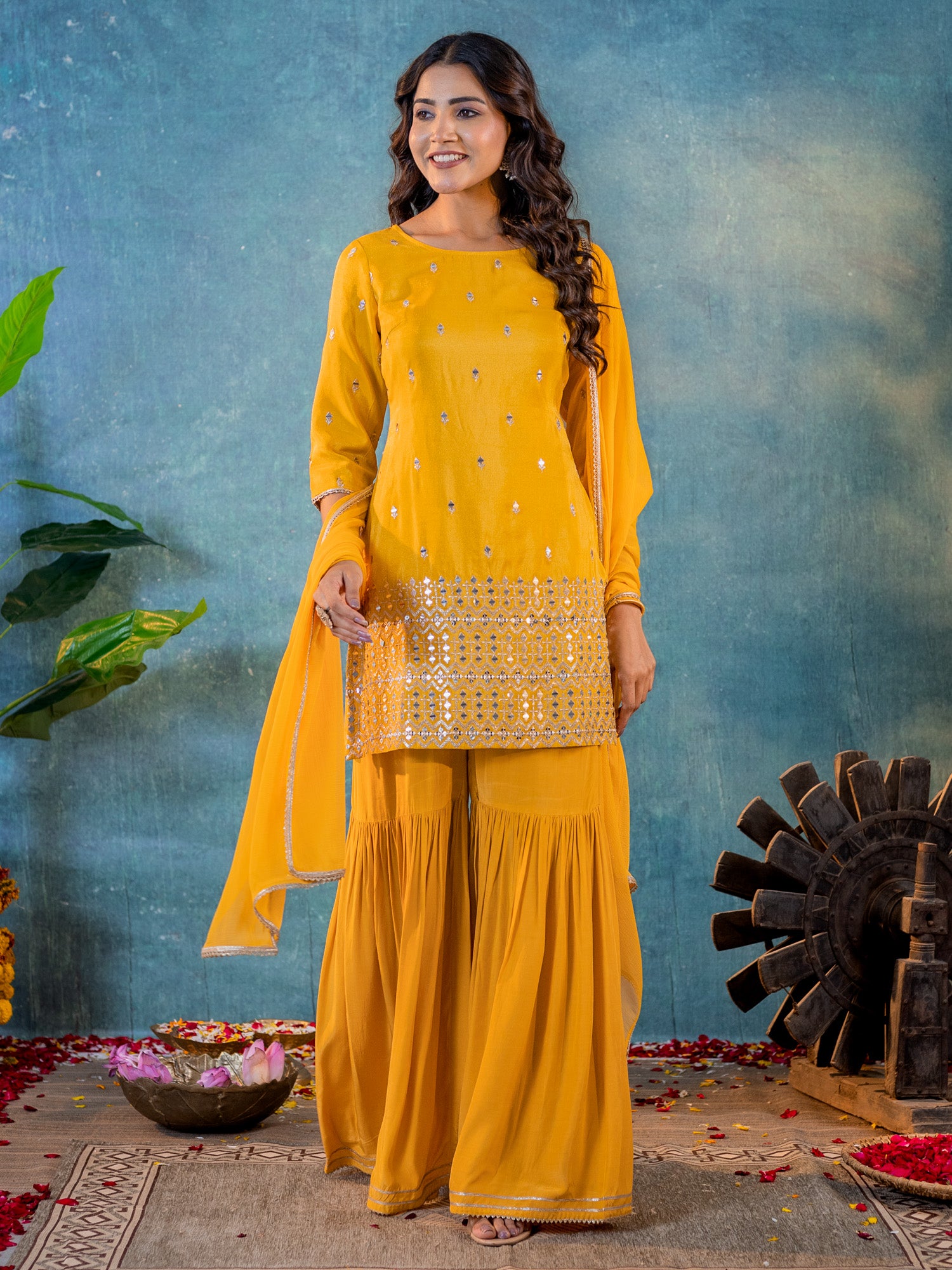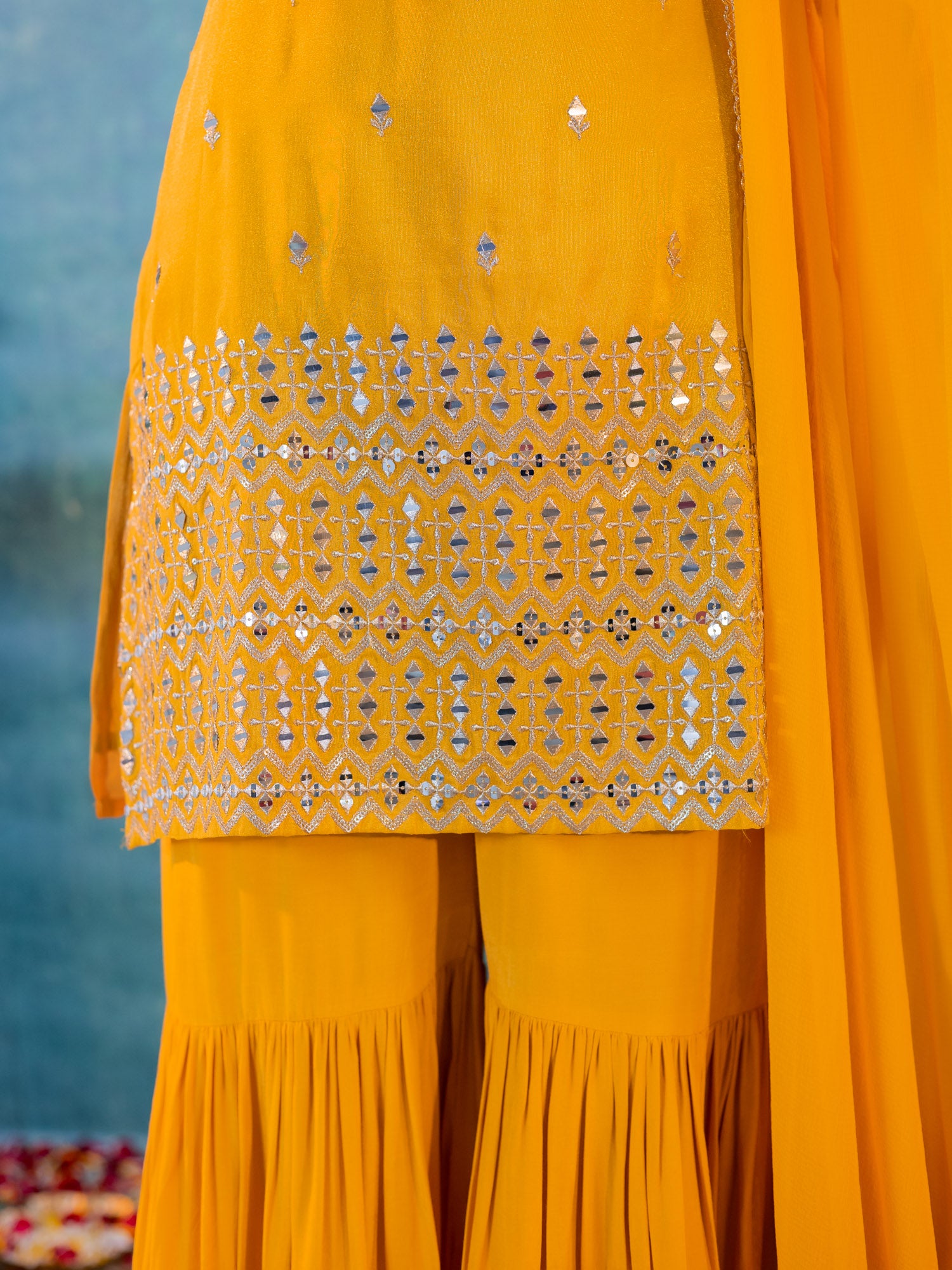Mustard Tissue Embroidered Kurta & Sharara Pant with Najneen Dupatta