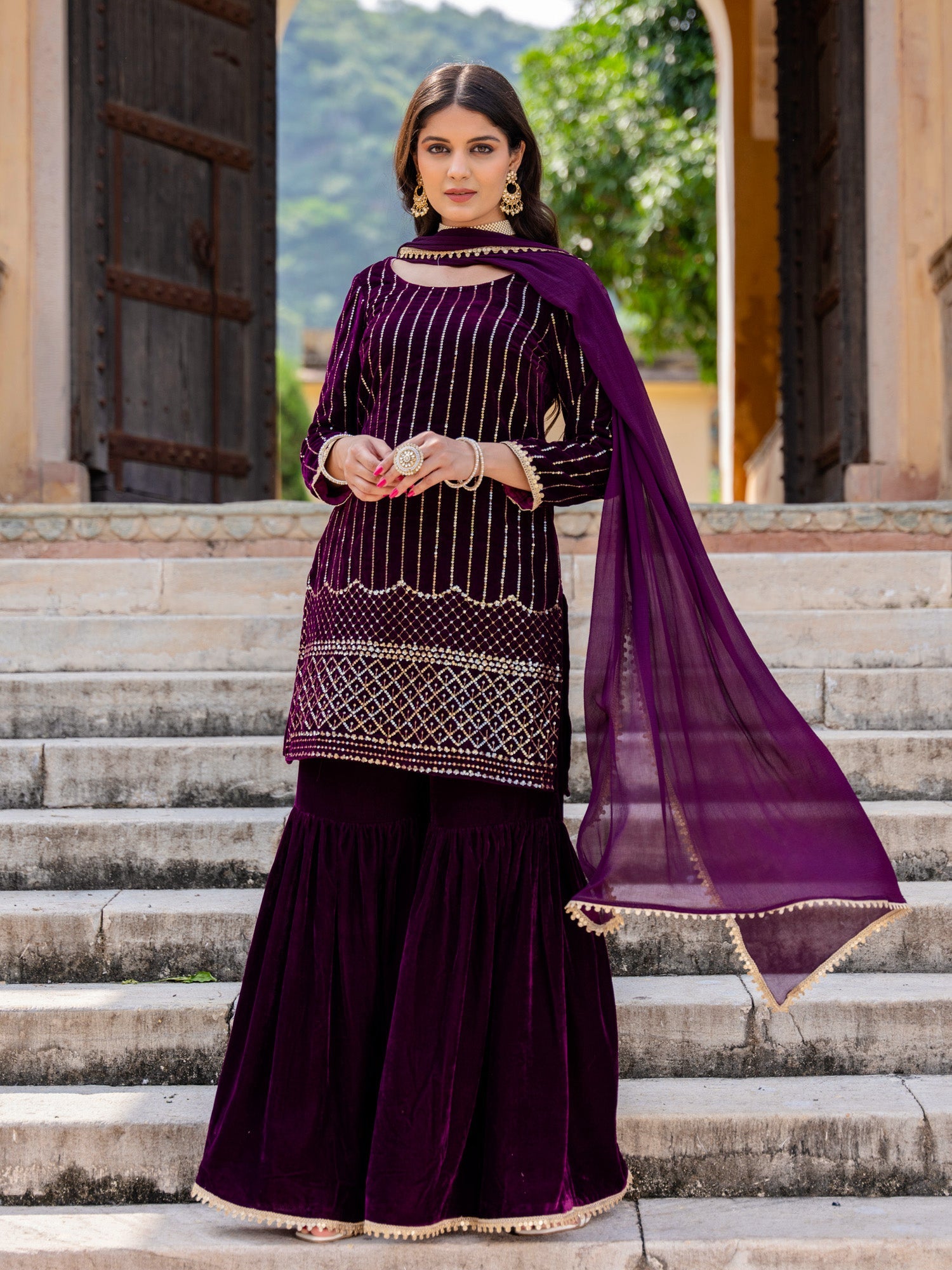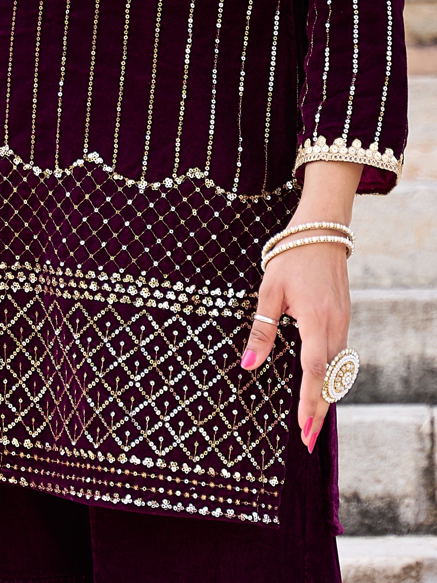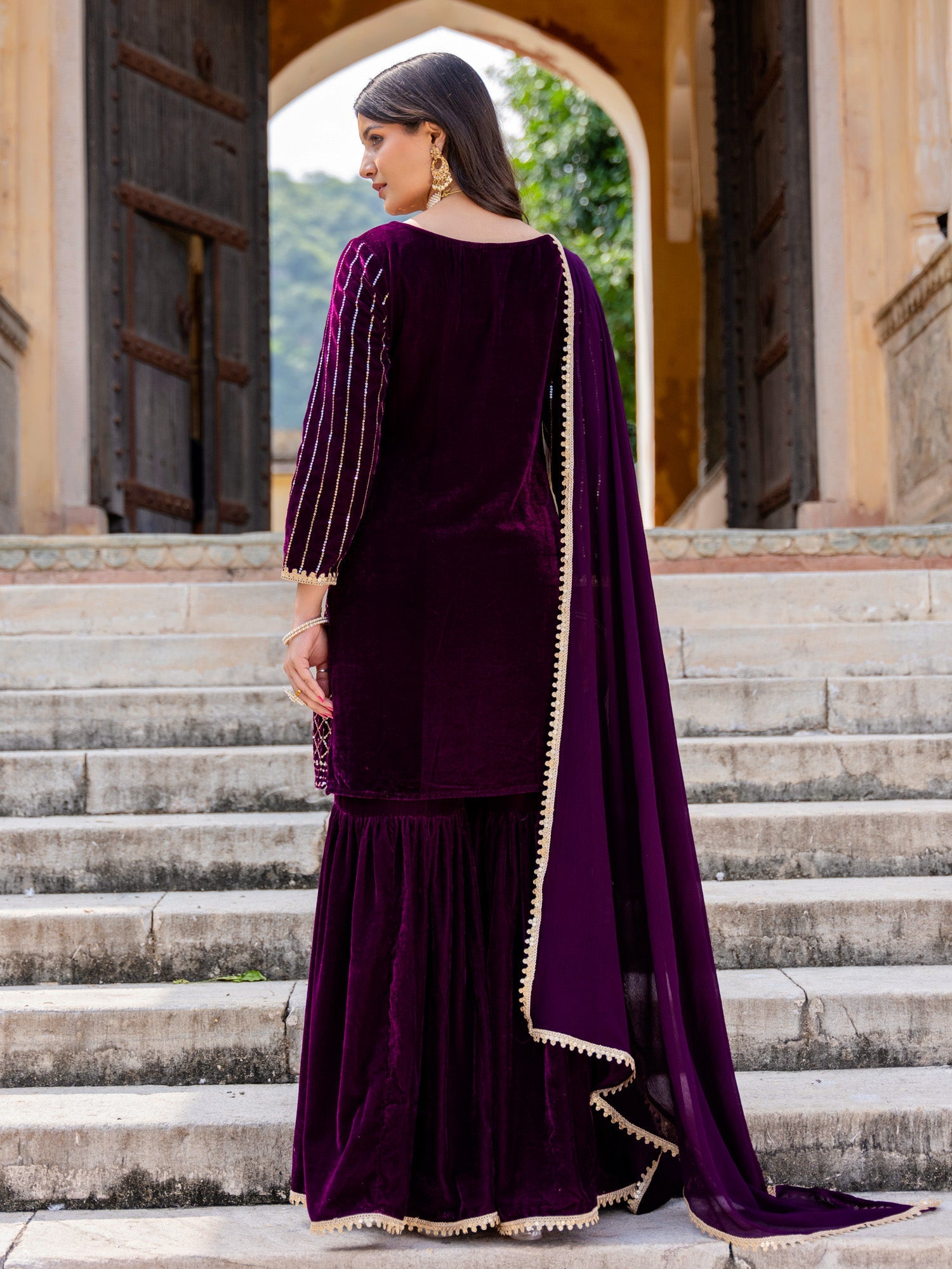 Wine Velvet Embroidered Straight Kurta And Sharara With Chiffon Dupatta
