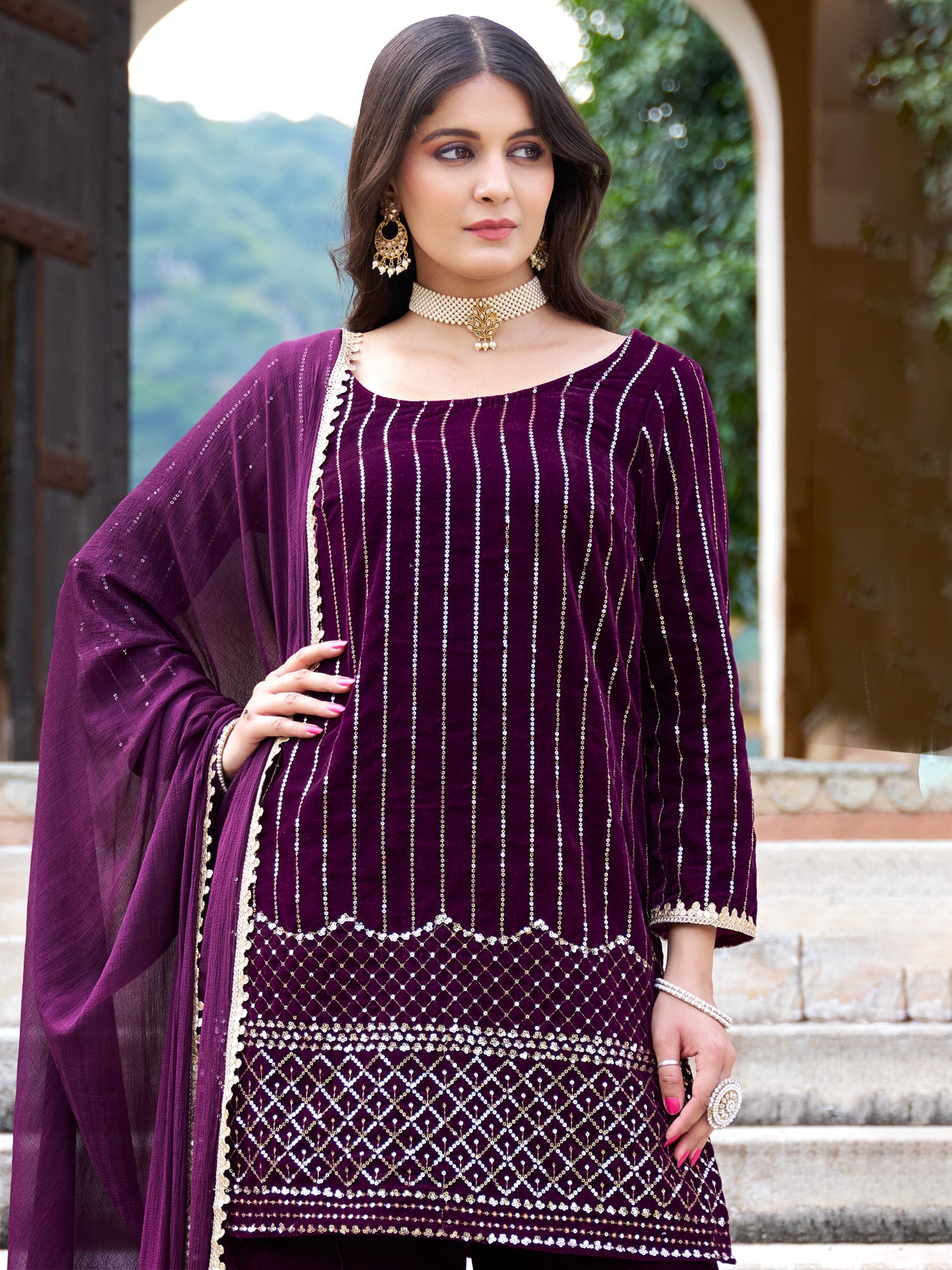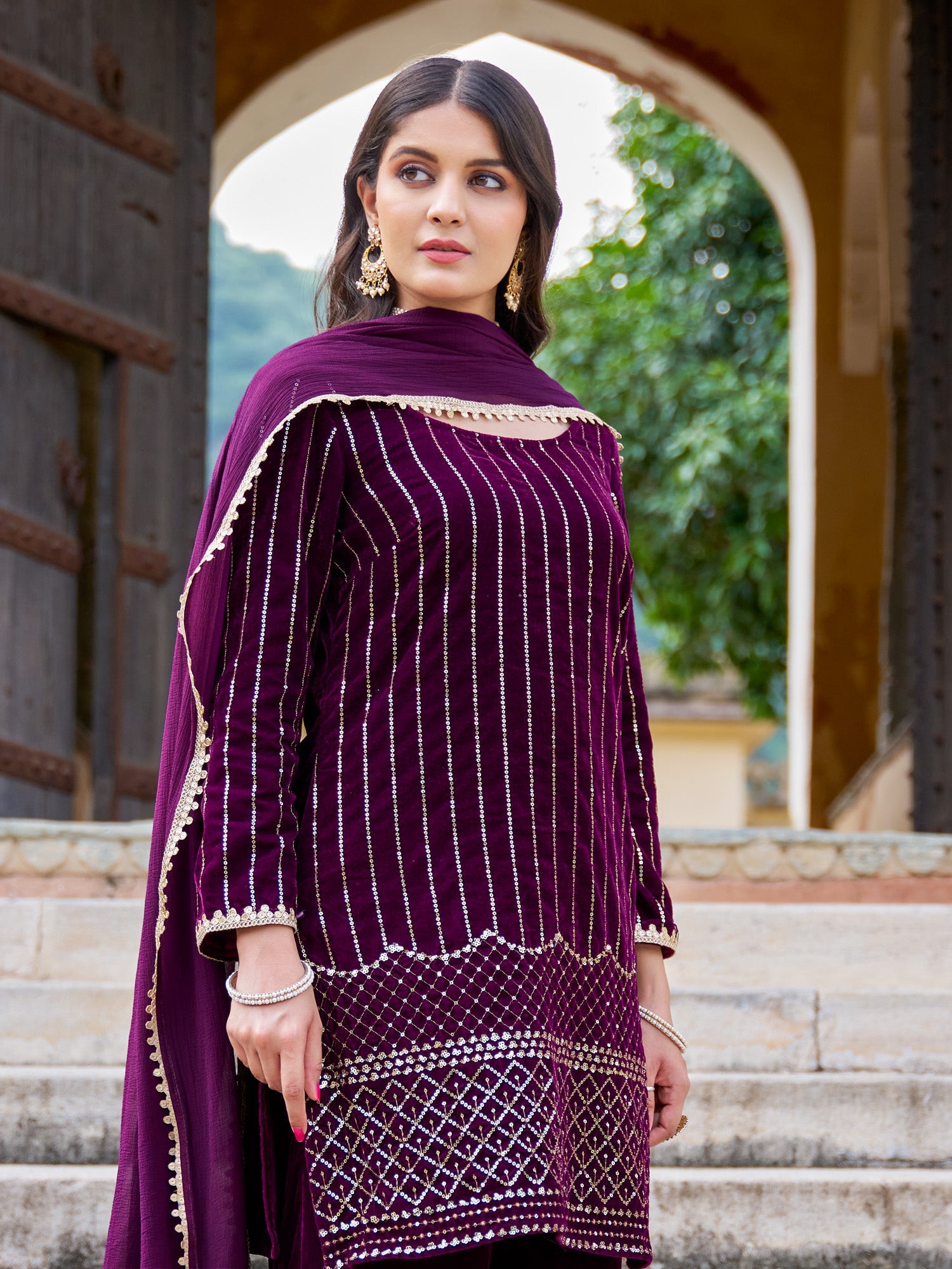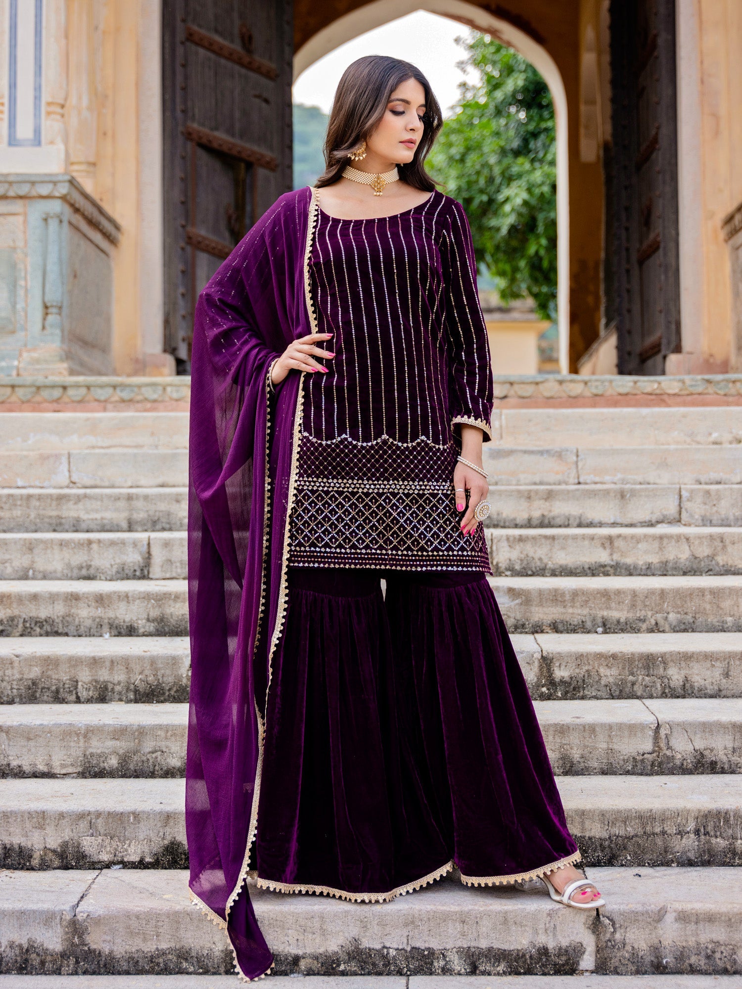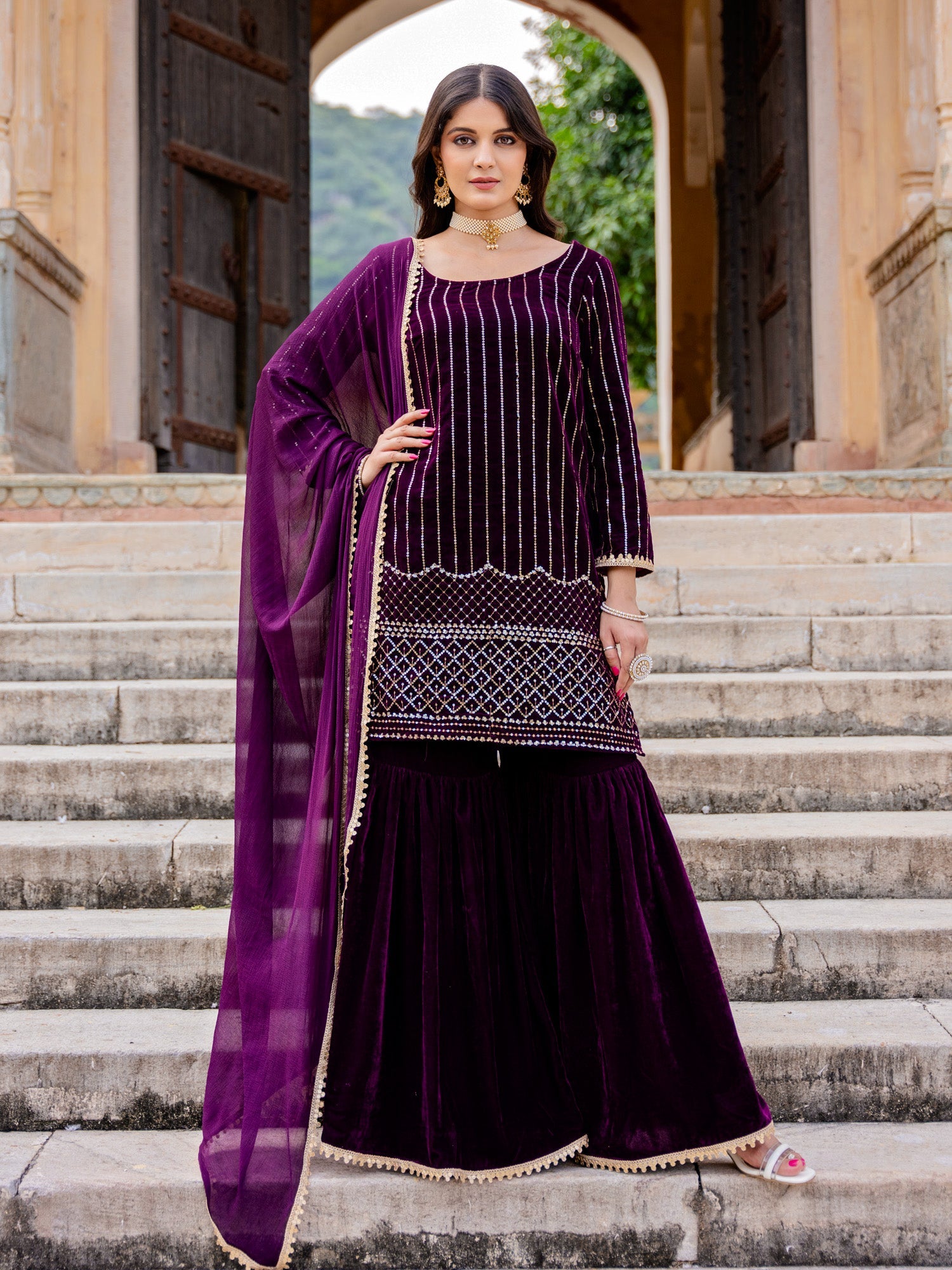 Wine Velvet Embroidered Straight Kurta And Sharara With Chiffon Dupatta