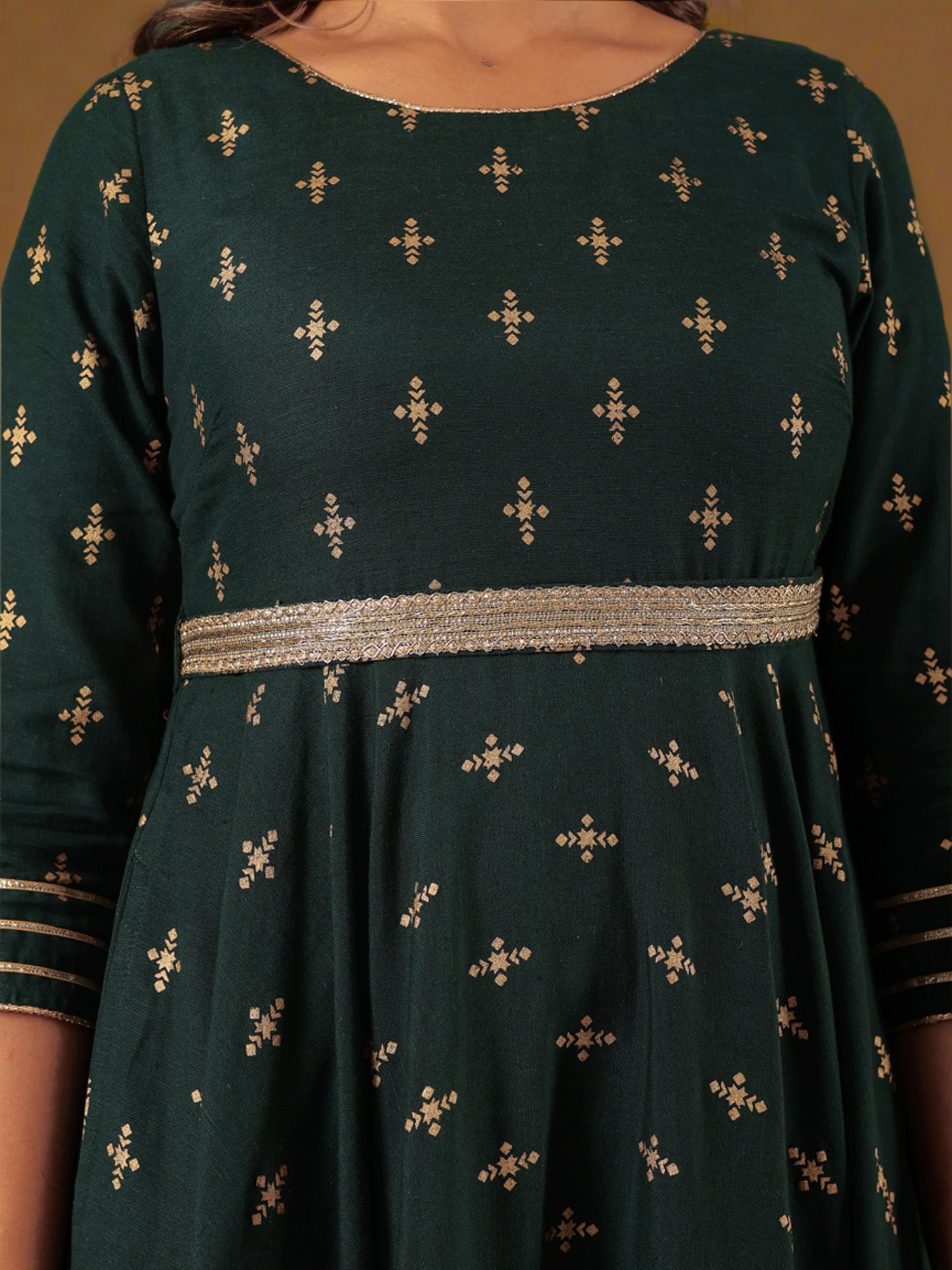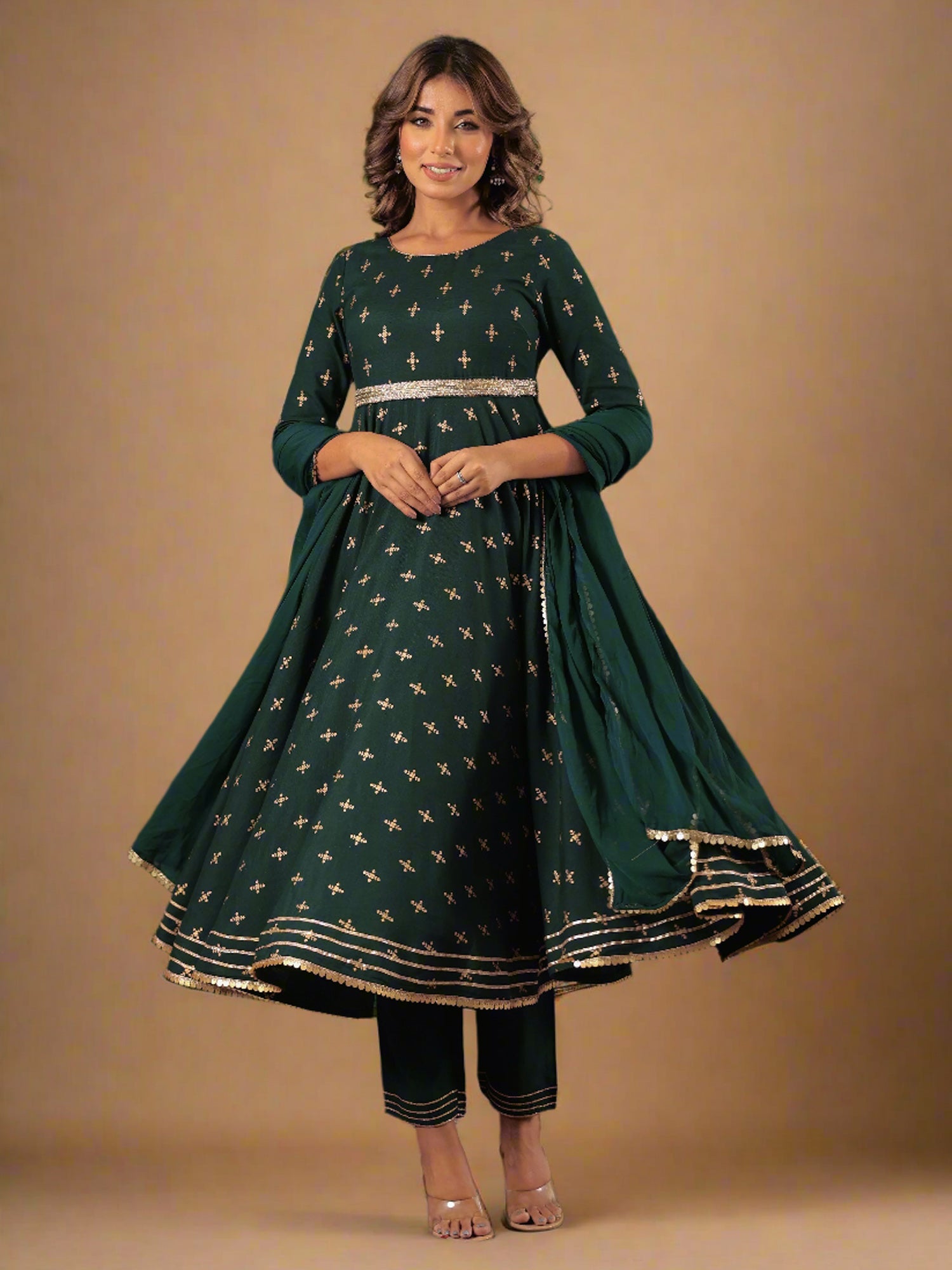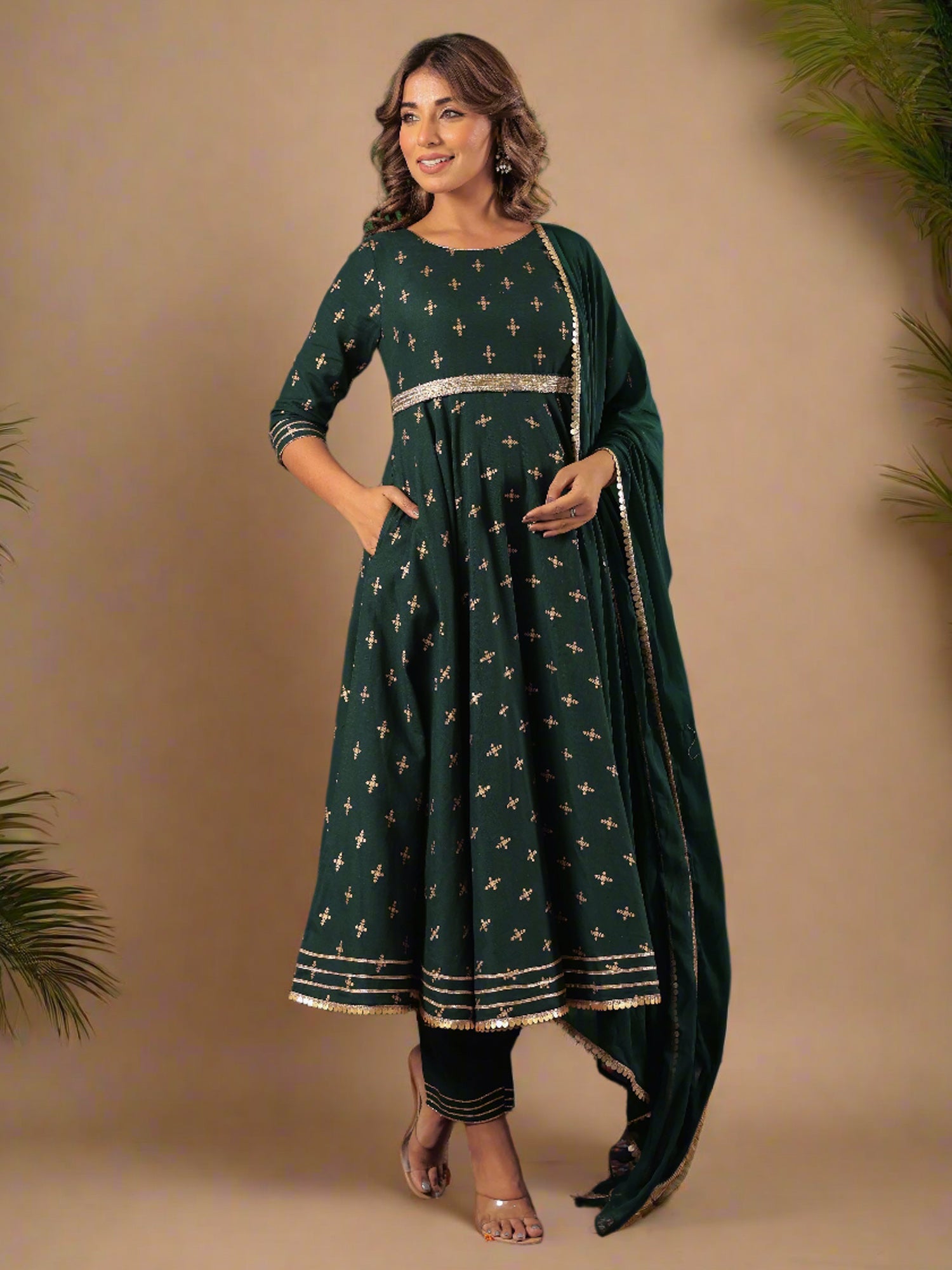 Green Gold Printed Anarkali Kurti with Narrow Pant Paired with Dupatta