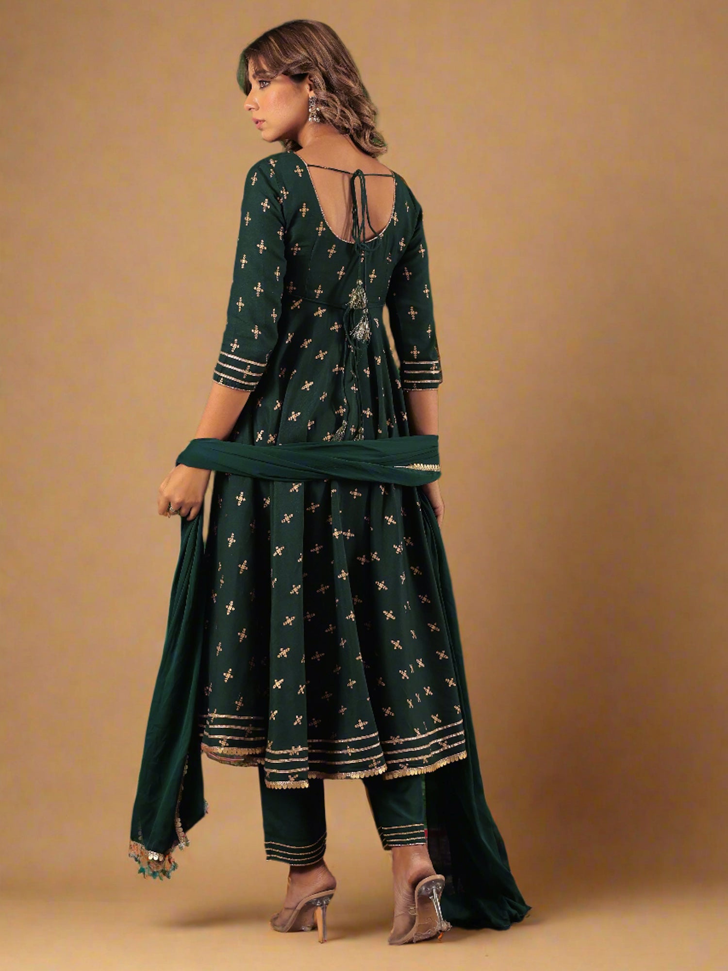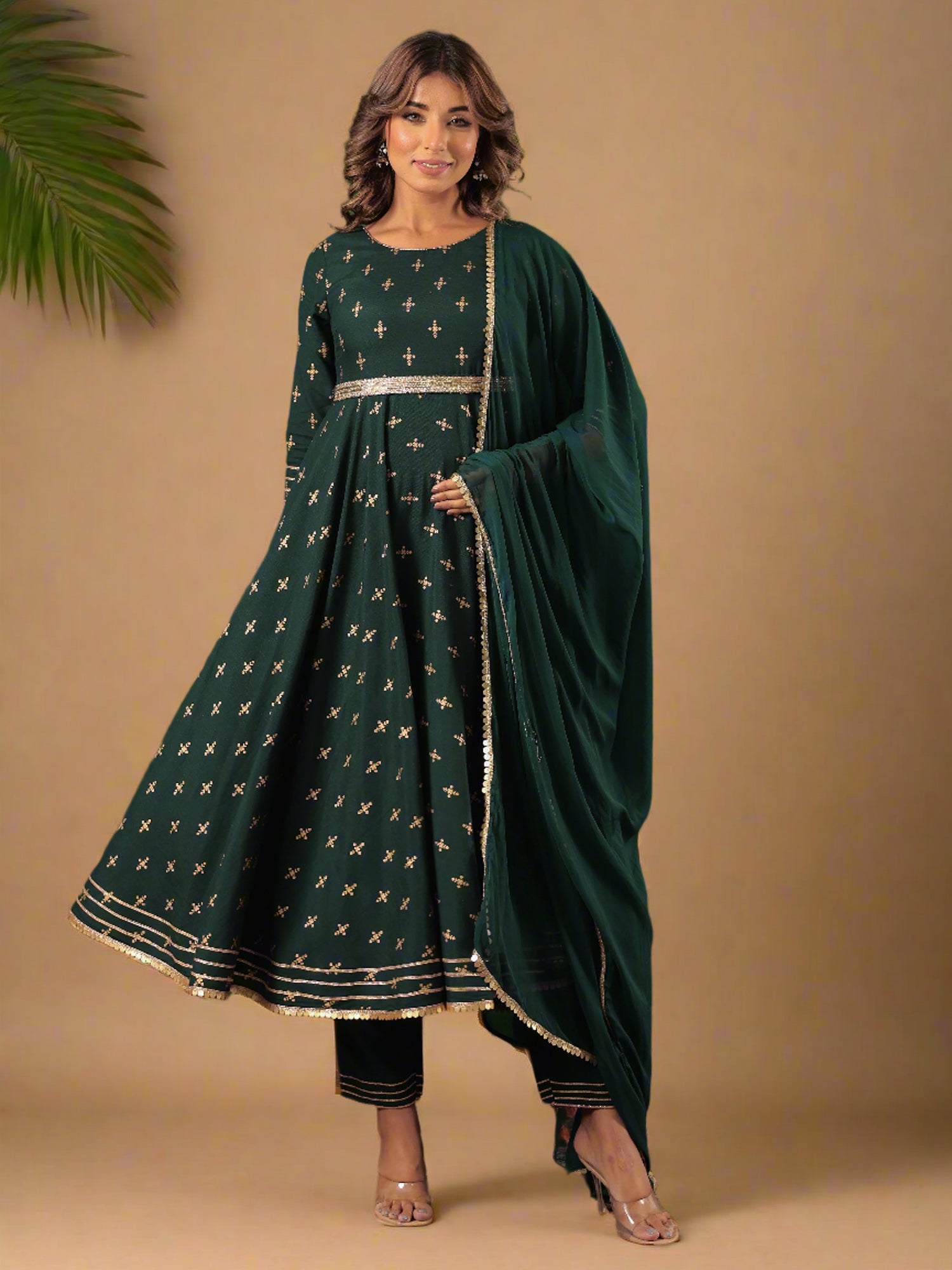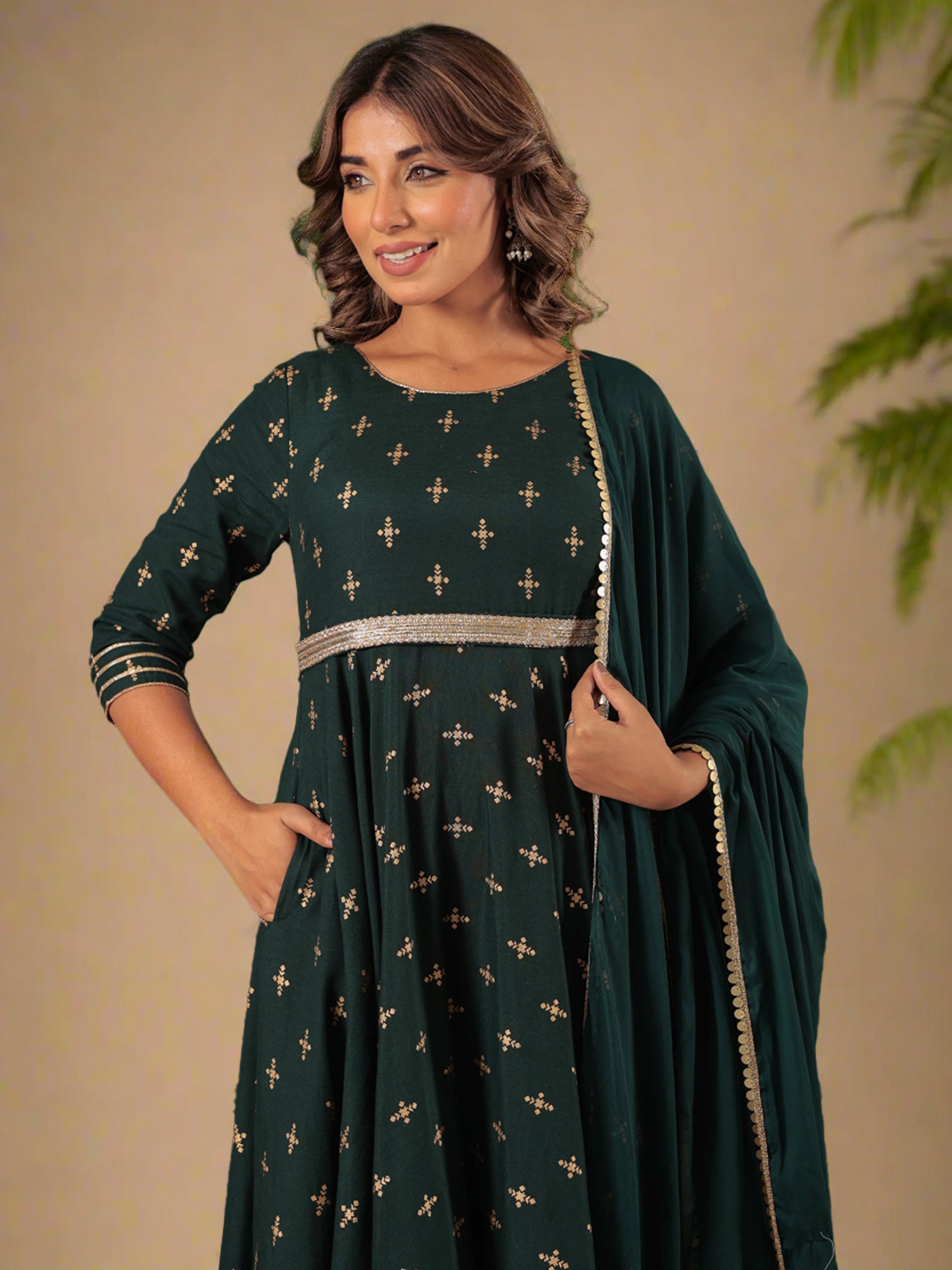 Green Gold Printed Anarkali Kurti with Narrow Pant Paired with Dupatta