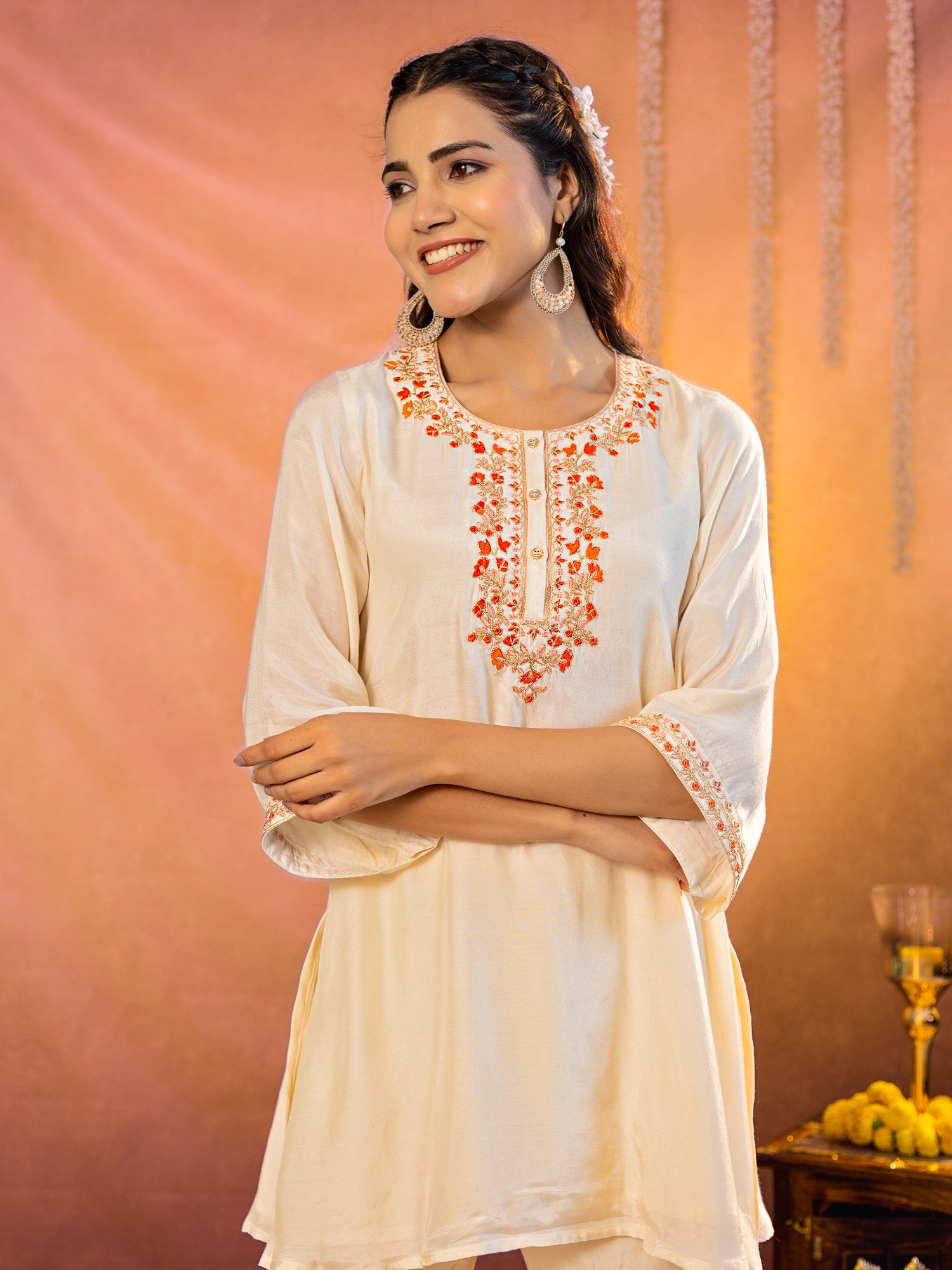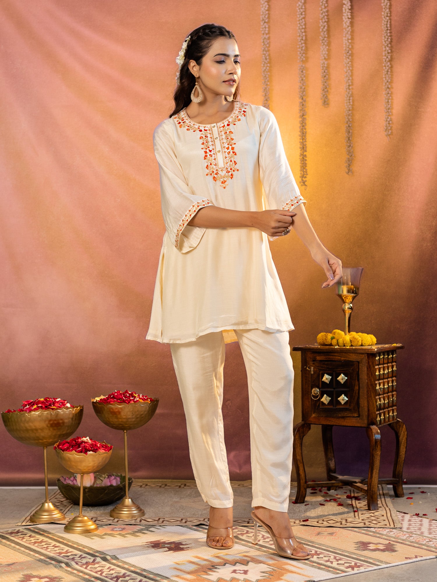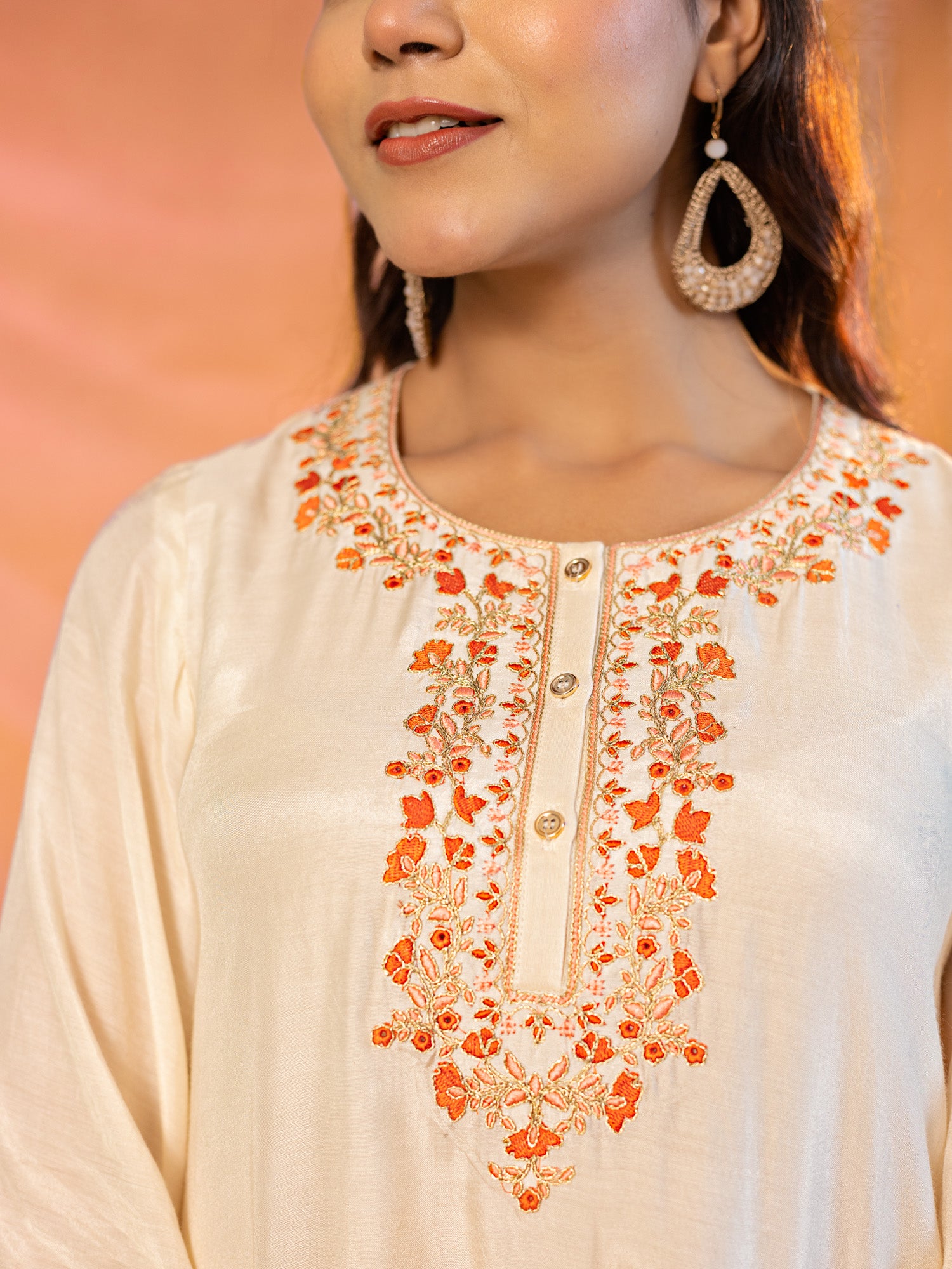 Beige Muslin embroidered Kurta with pakistani sleeves Co-Ord Set