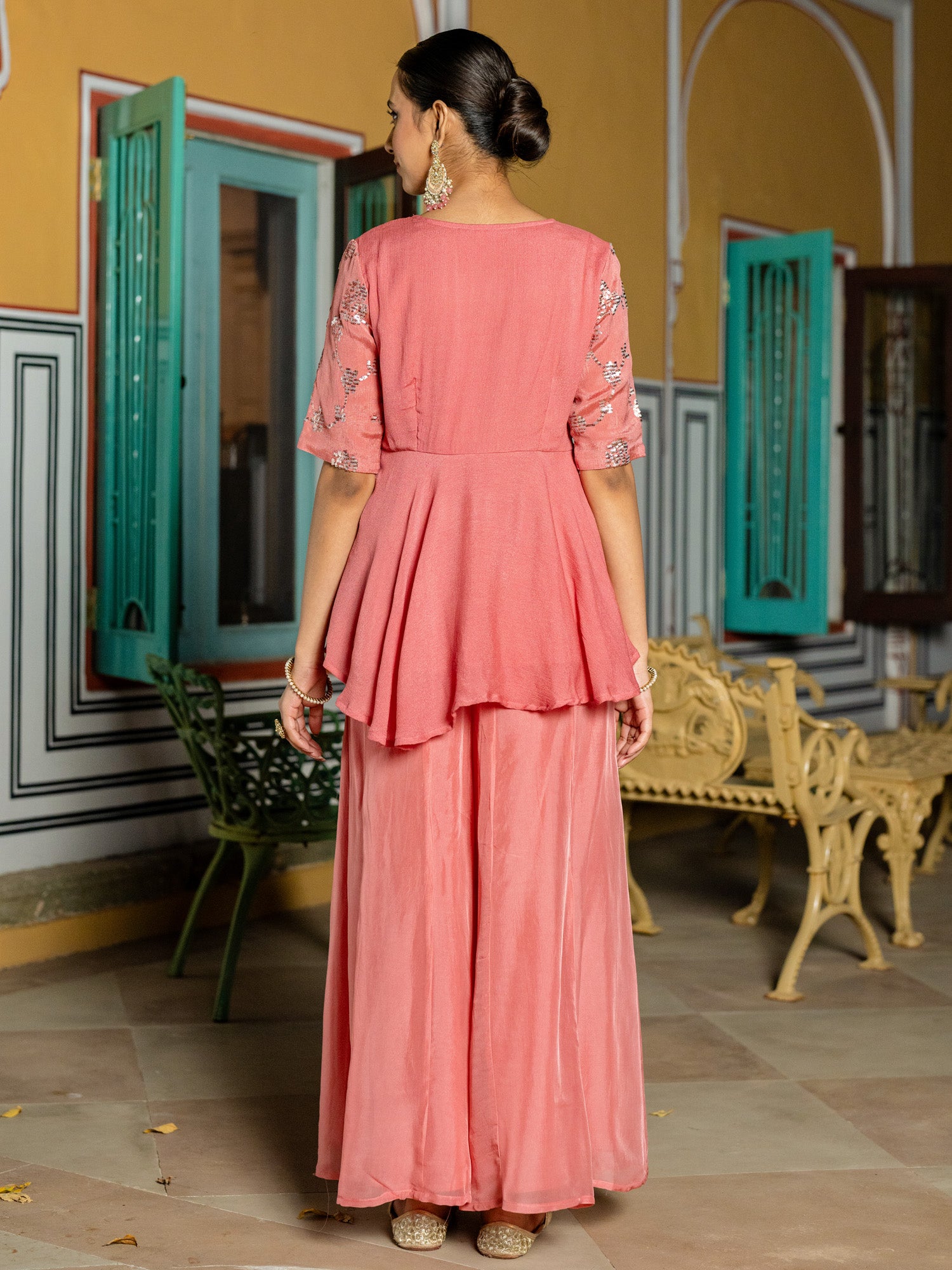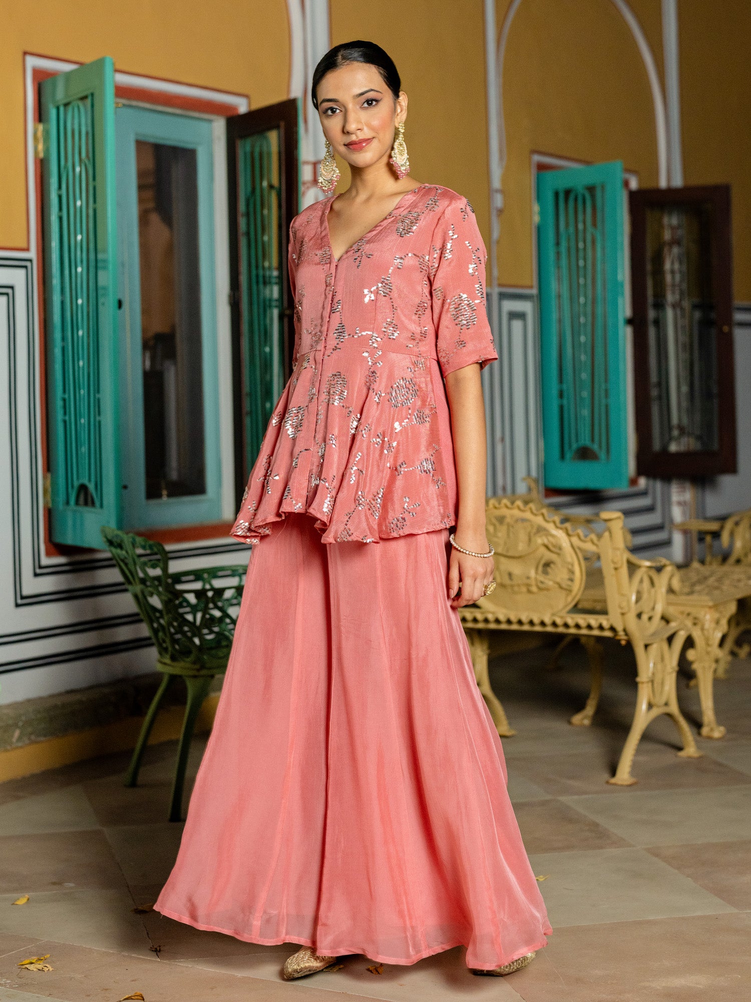 Blush Pink Chinon Sequin Embroidered Peplum Co-Ord Set With Flared Pant