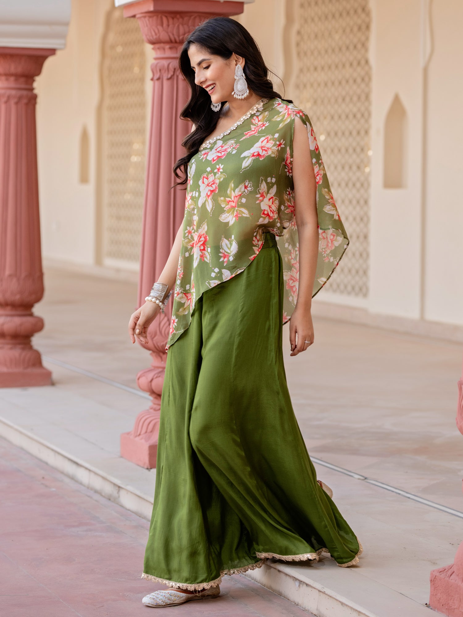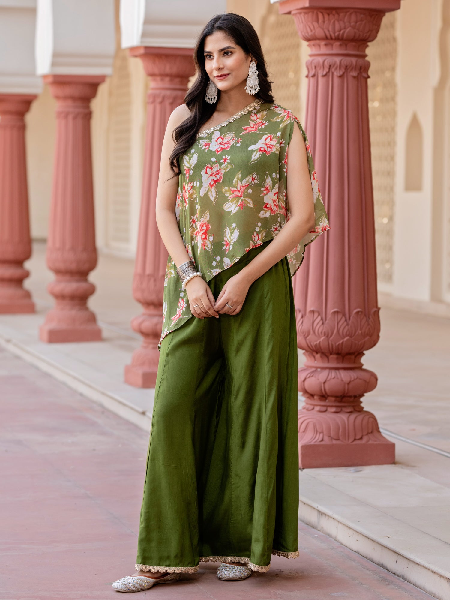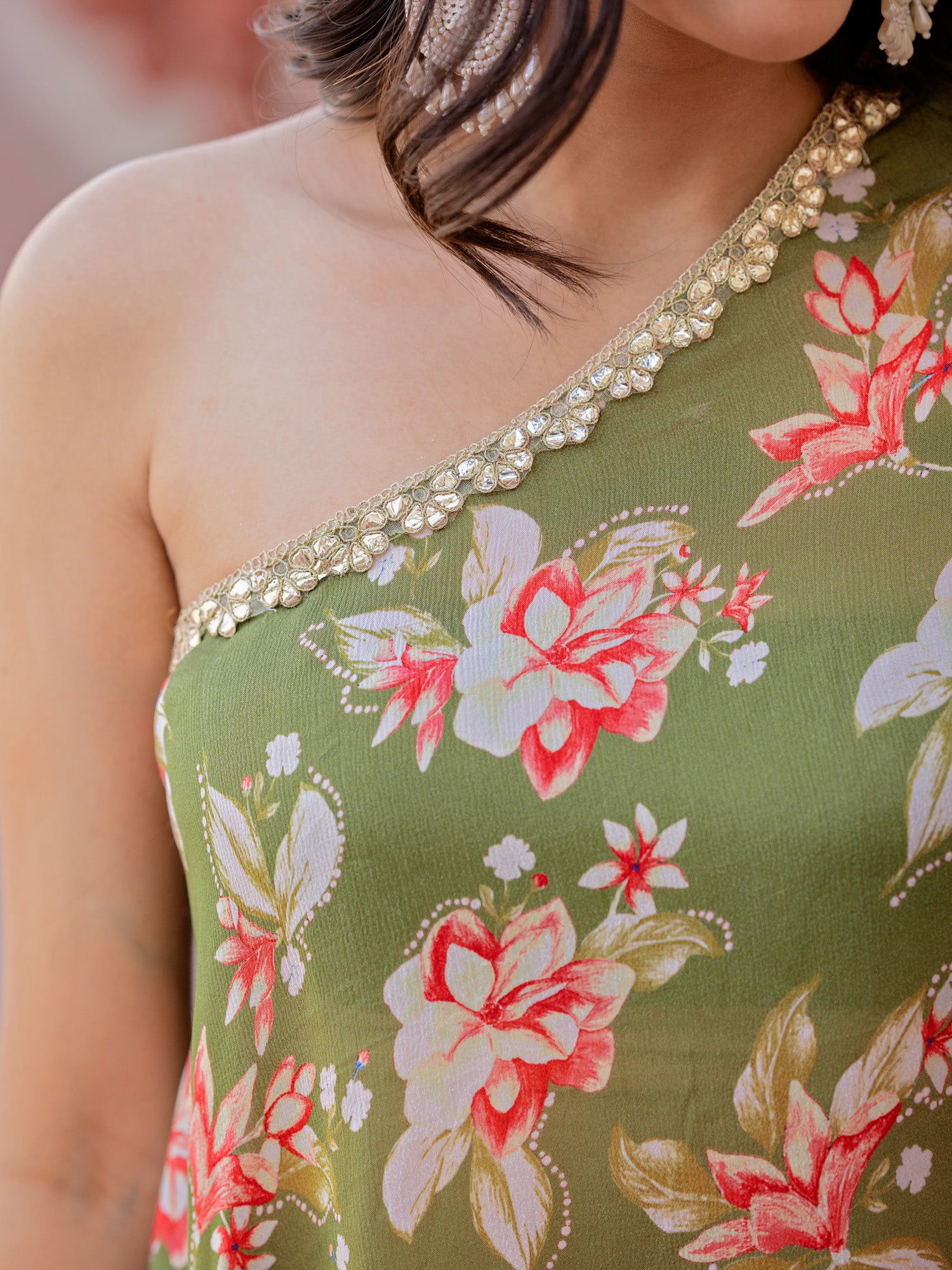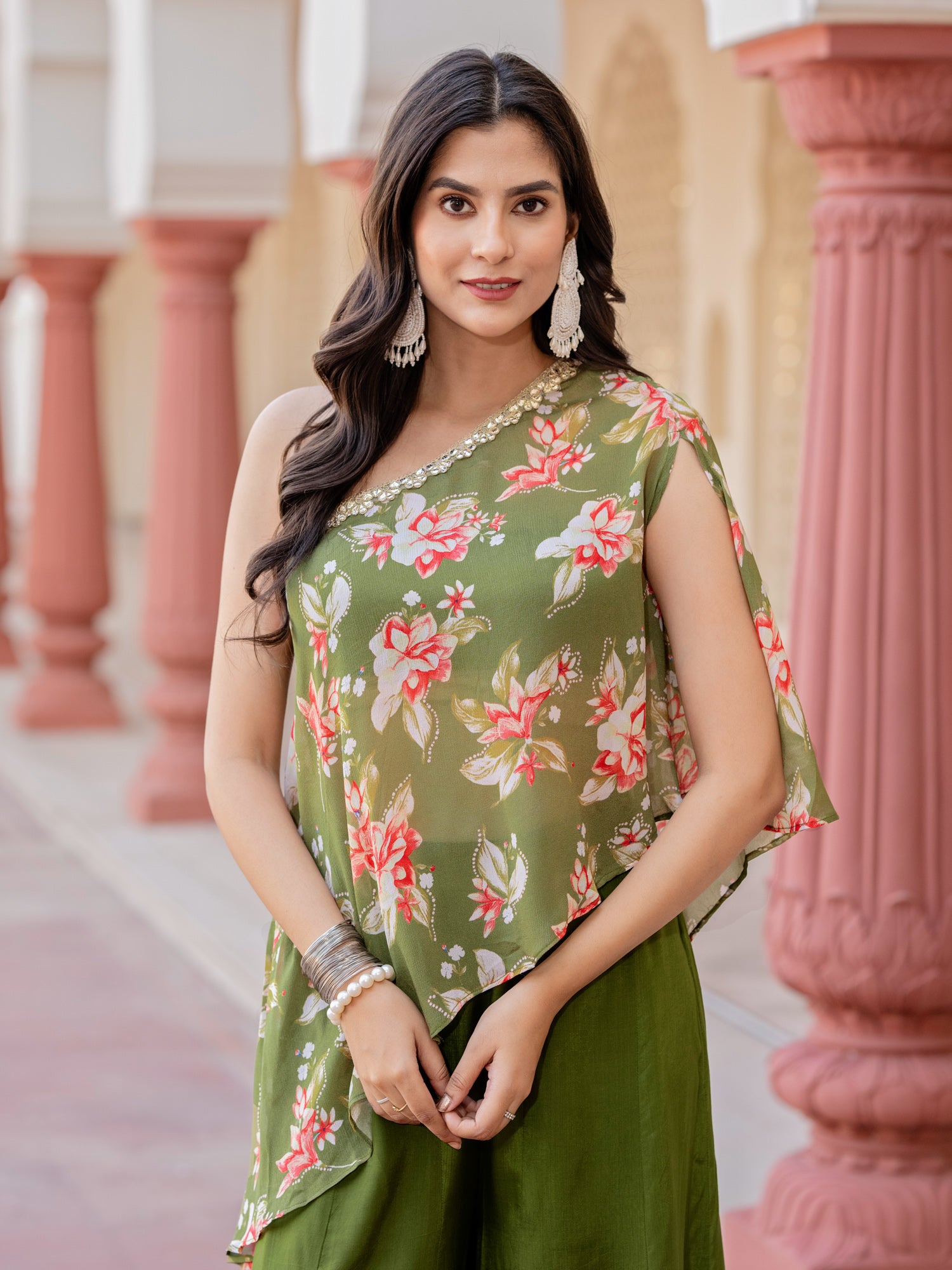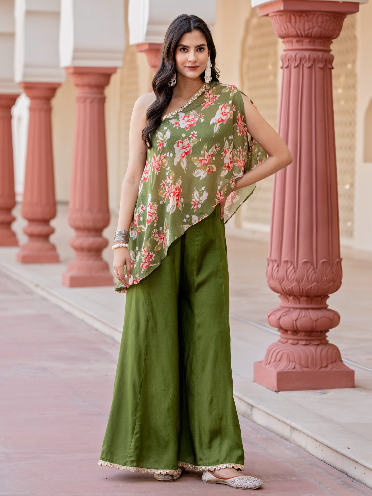 Green Floral Printed One Shoulder Top With Flared Pant Co-Ord Set