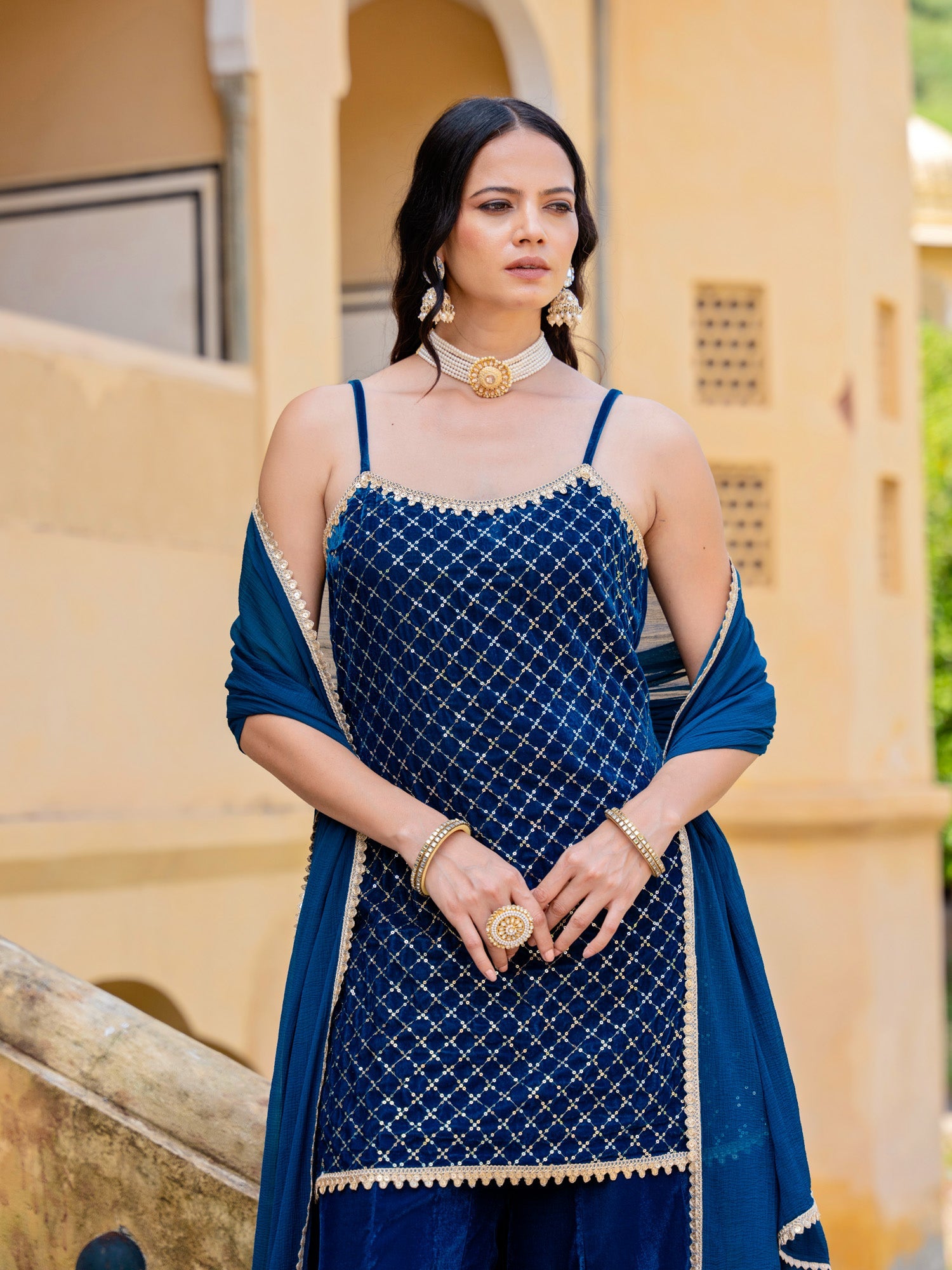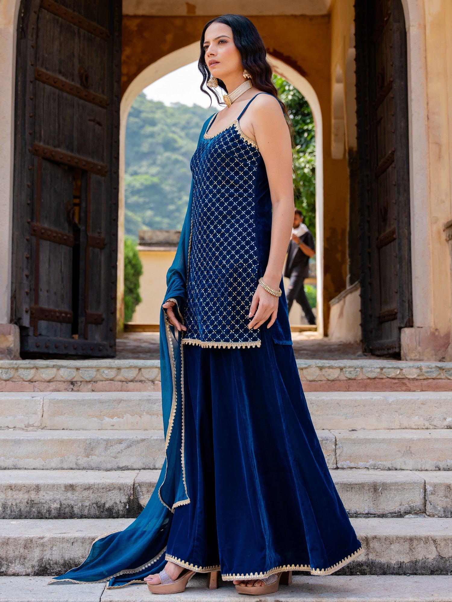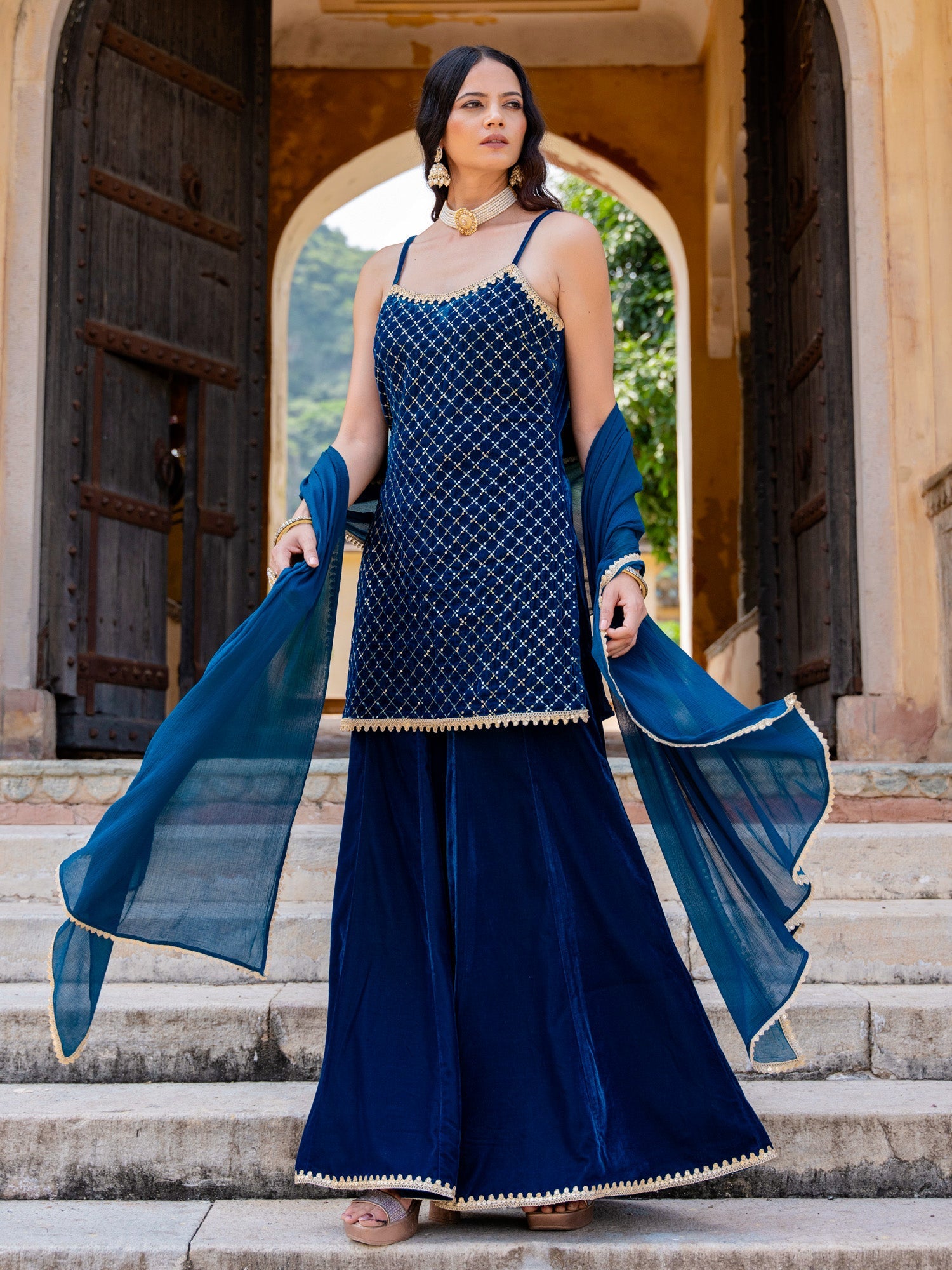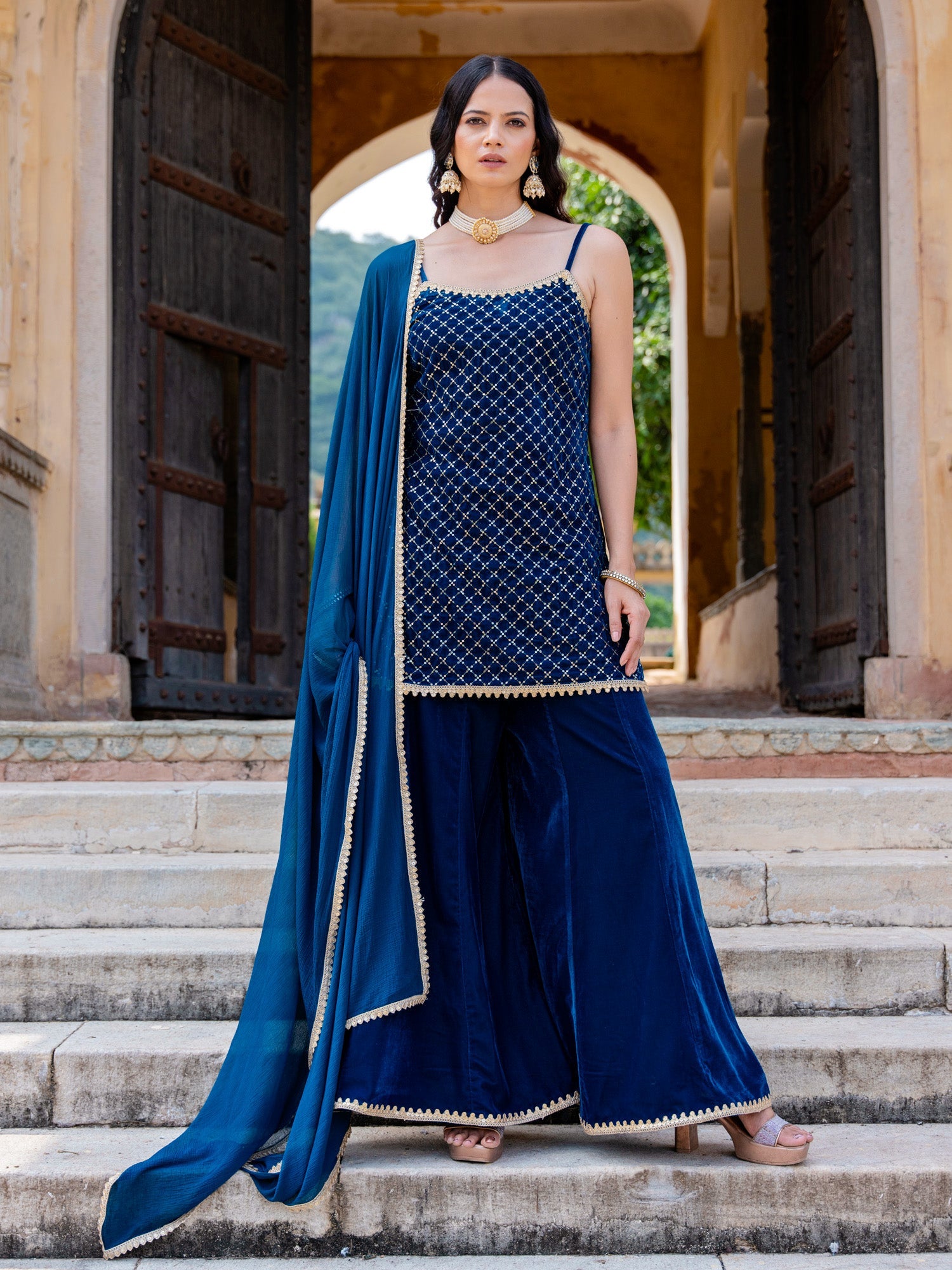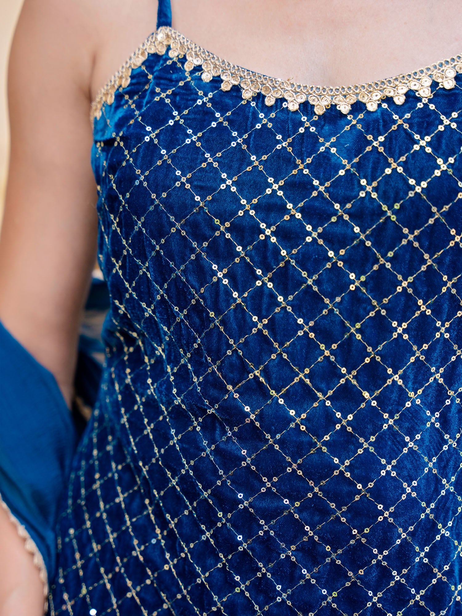 Blue Velvet Embroidered Sleeveless Strappy Kurta And Sharara Set With Dupatta