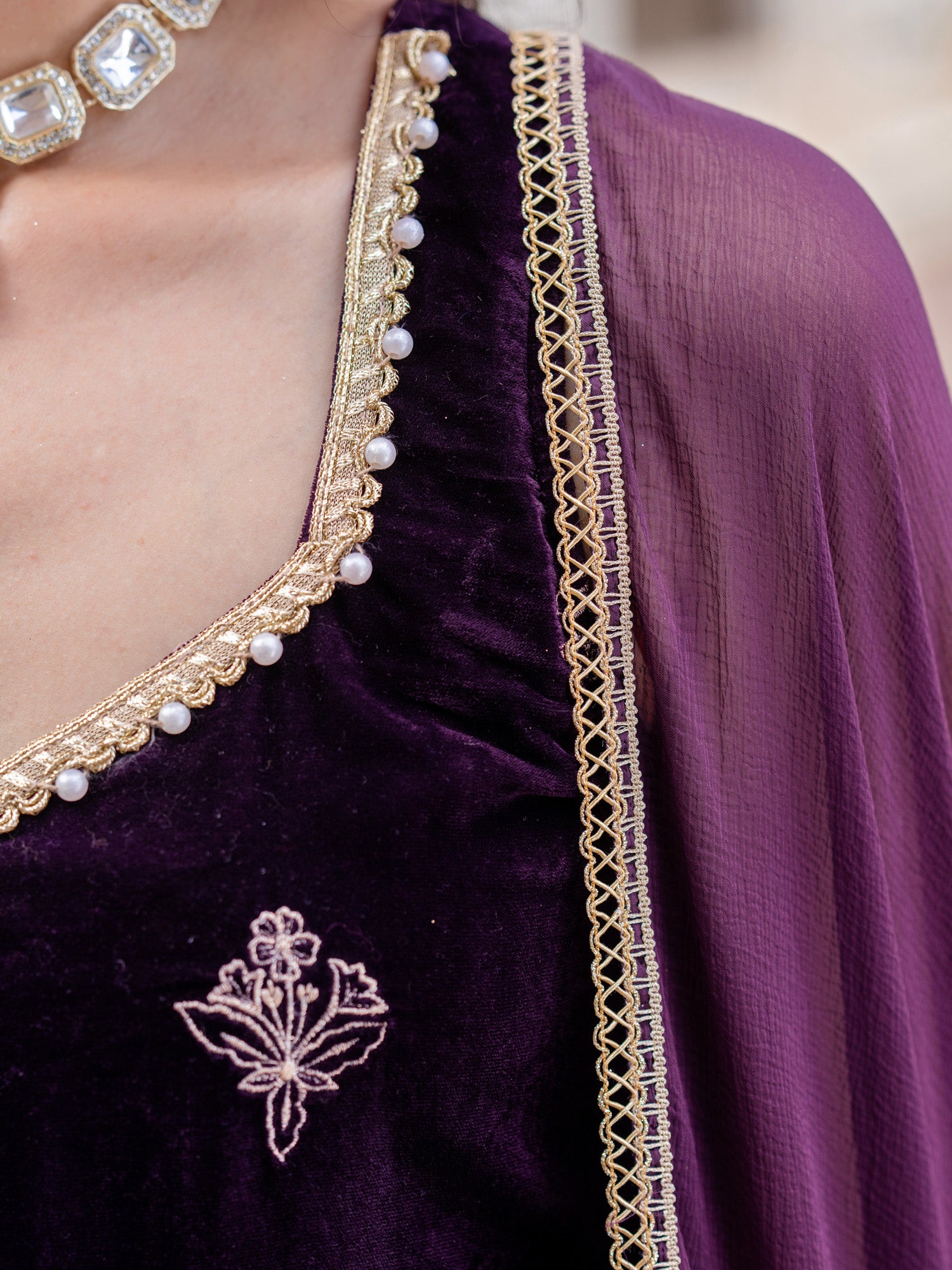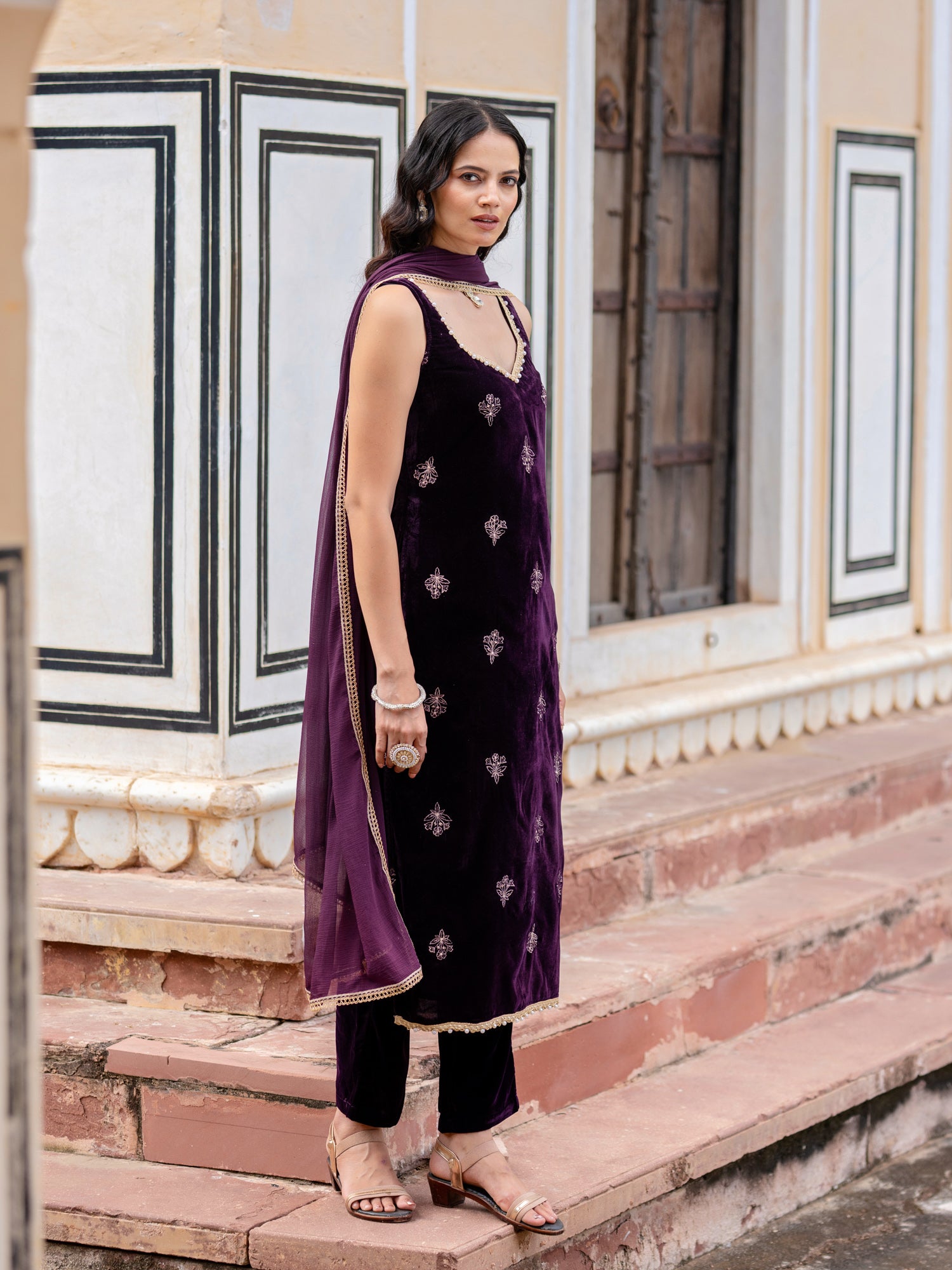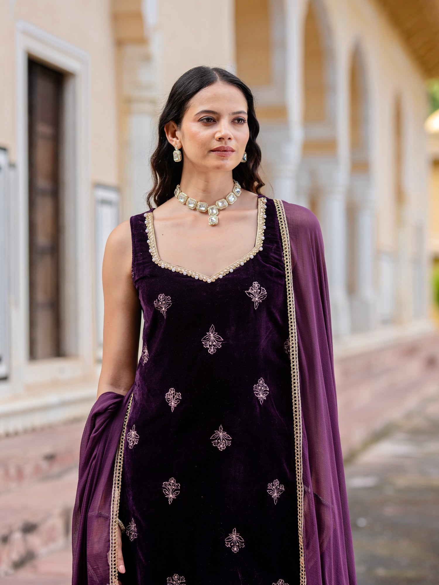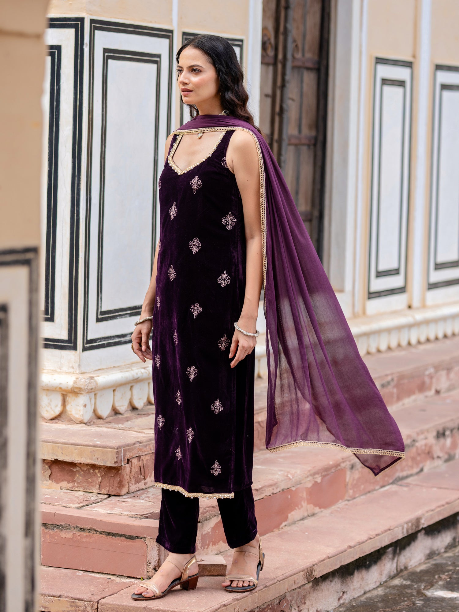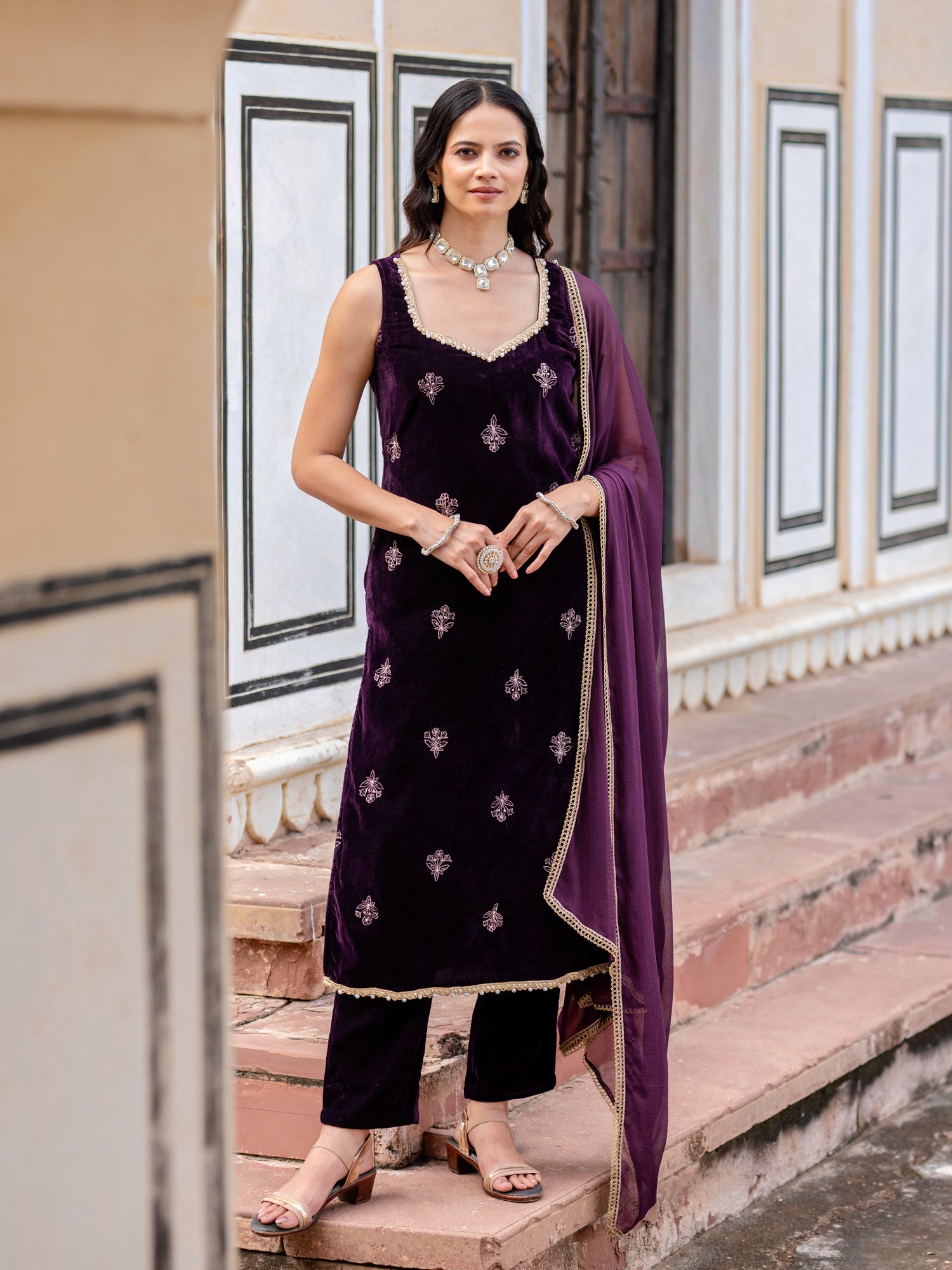 Wine Velvet Embroidered Sweetheart Neck Kurta And Pant With Dupatta